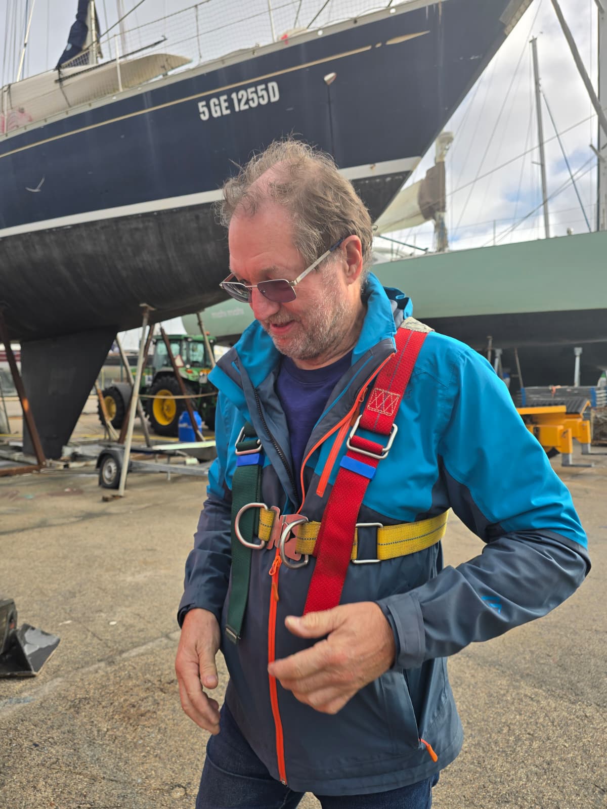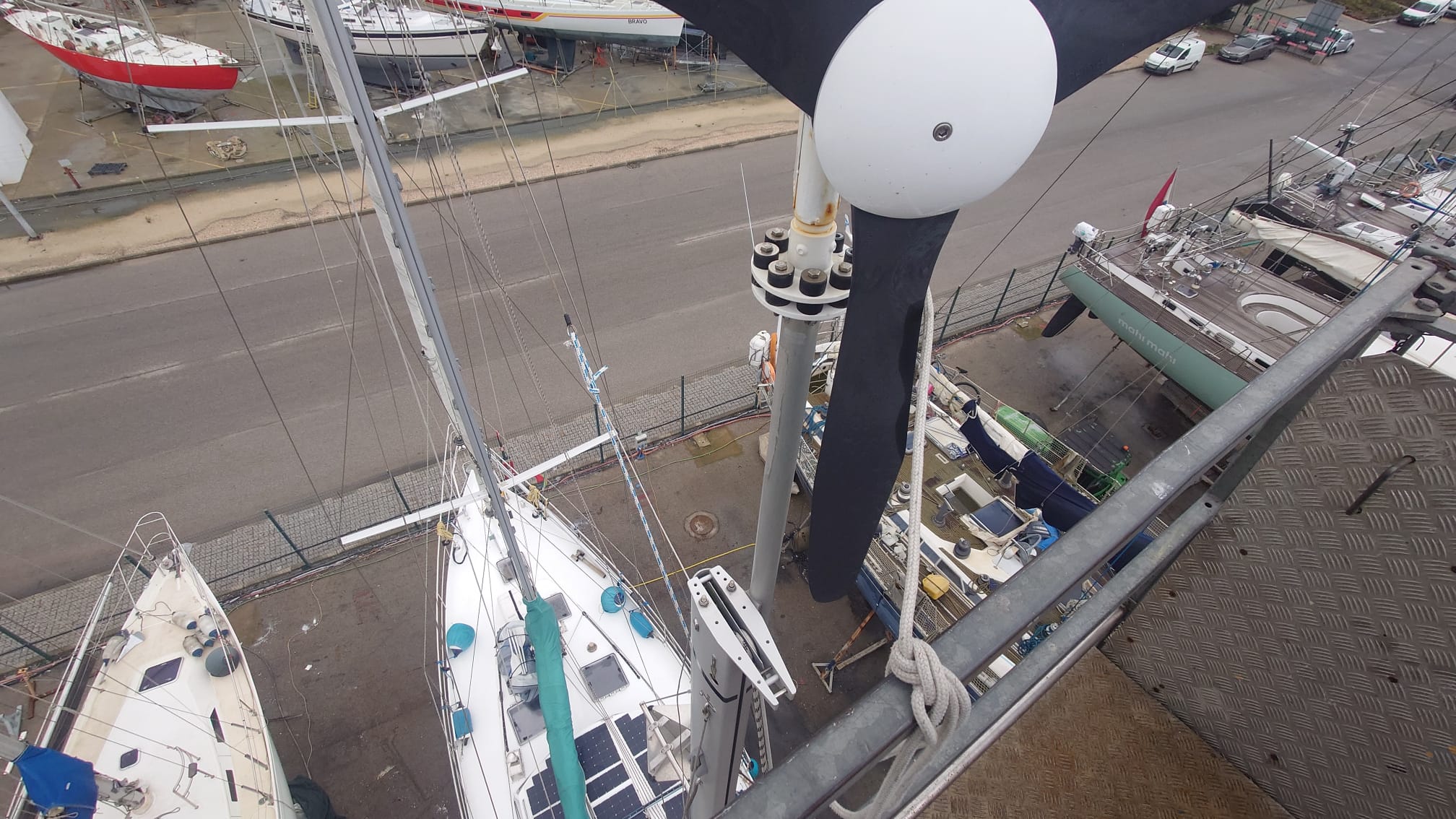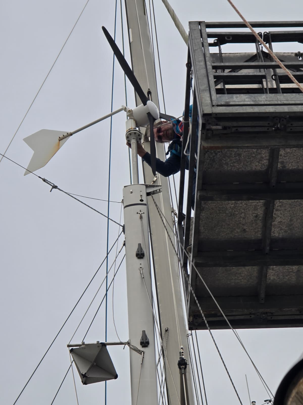 The Manitou” to take Wim up to the mizzen mast to remove the old wind generator and prepare for its replacement. The lift operator supplies a safety harness even though Wim will be on a safe platform.