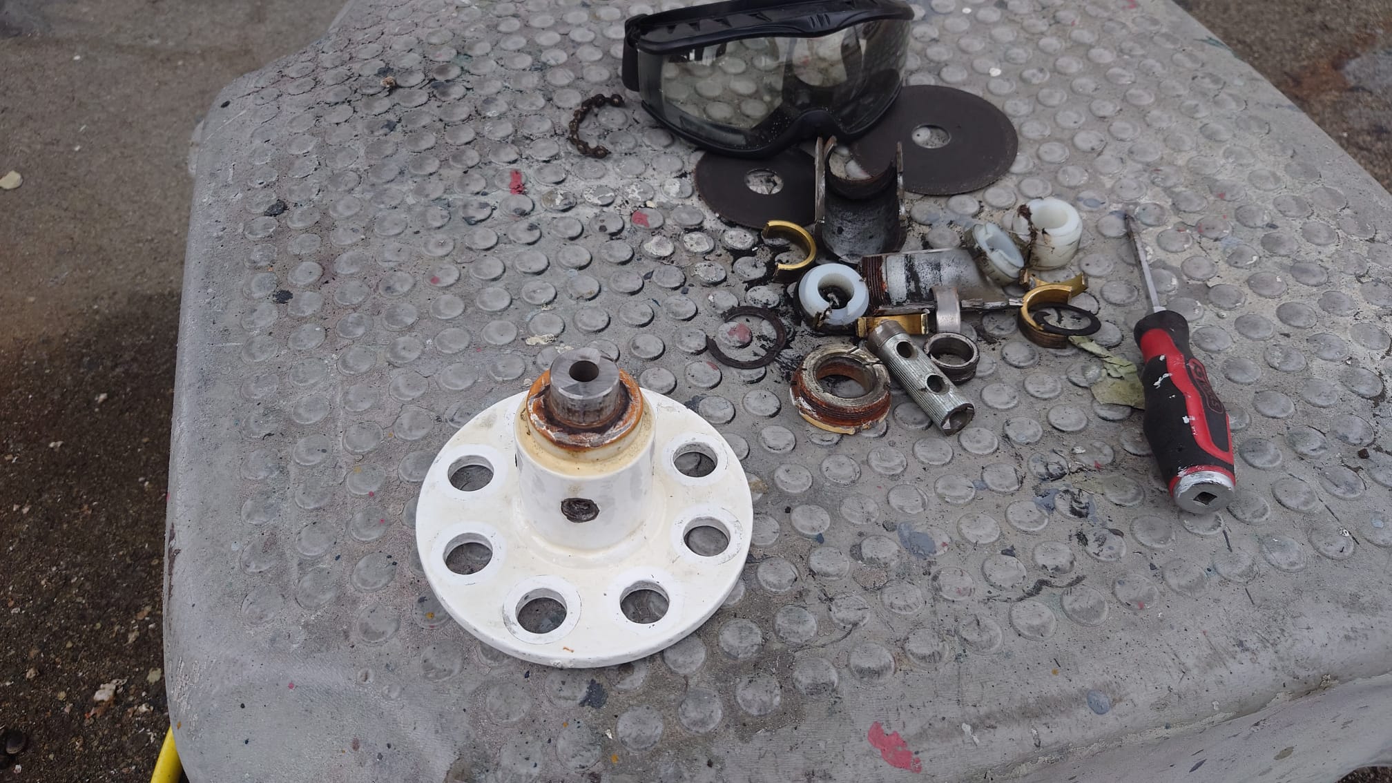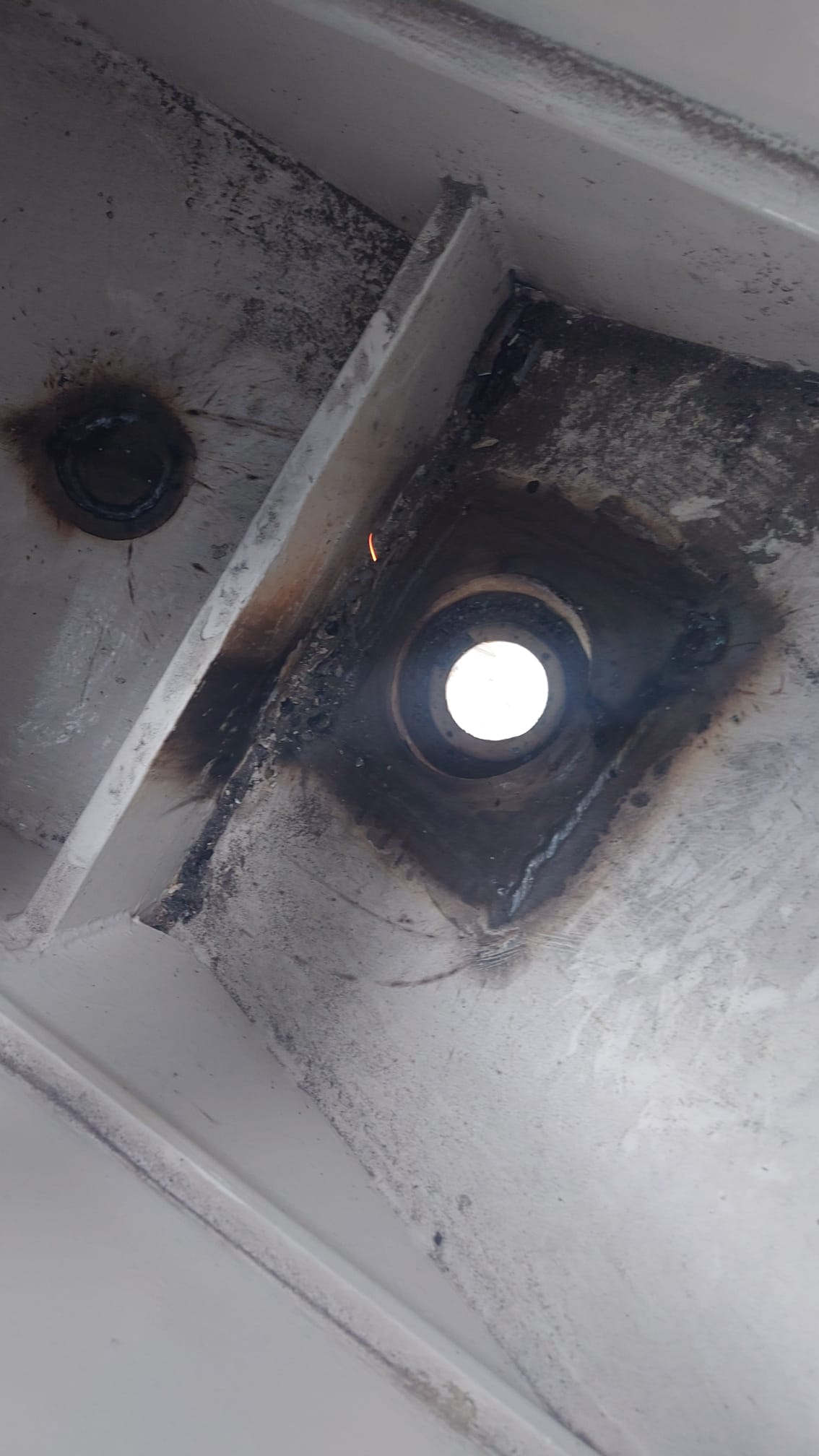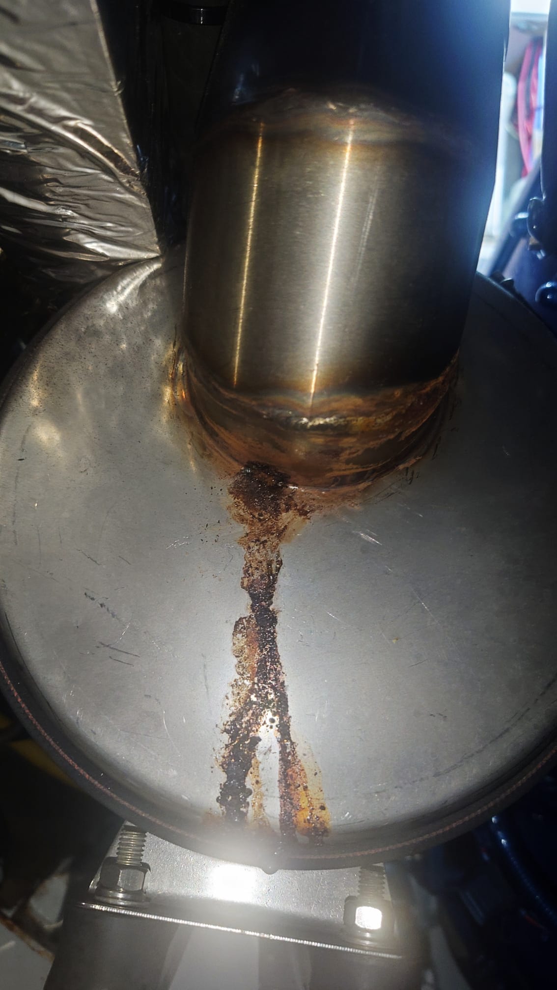 While Wim has the engine hatch de-mounted he can have a look behind the engine. Bummer! The exhaust water lock has a small leak! A bad weld. A drop of salt water leaks out. This has to be repaired…