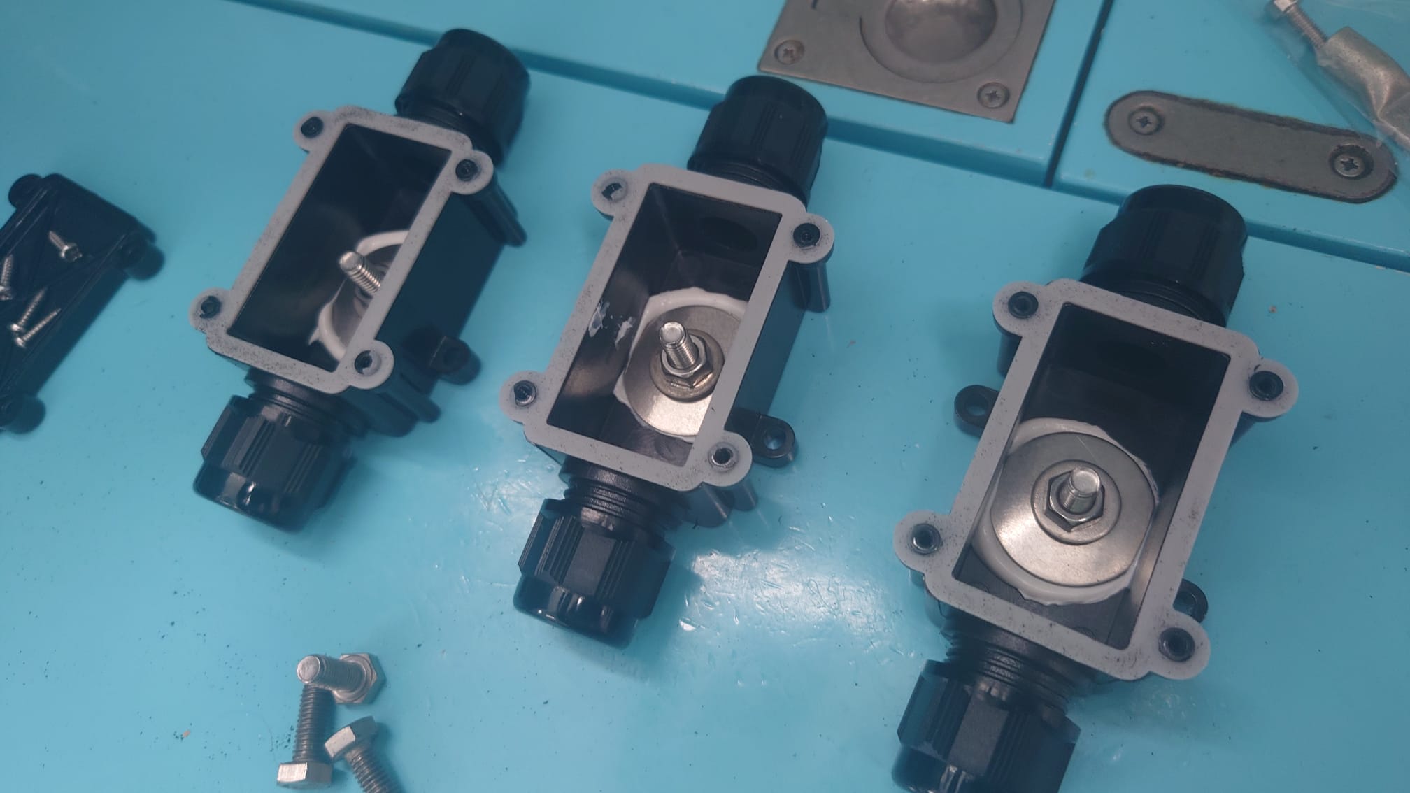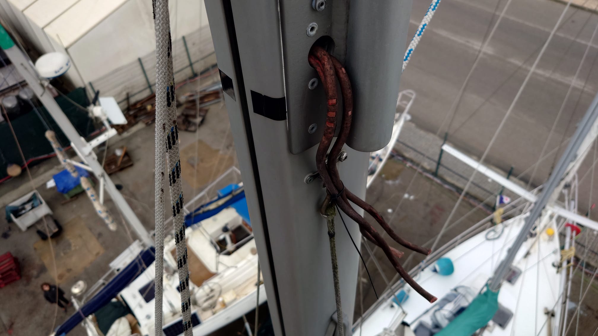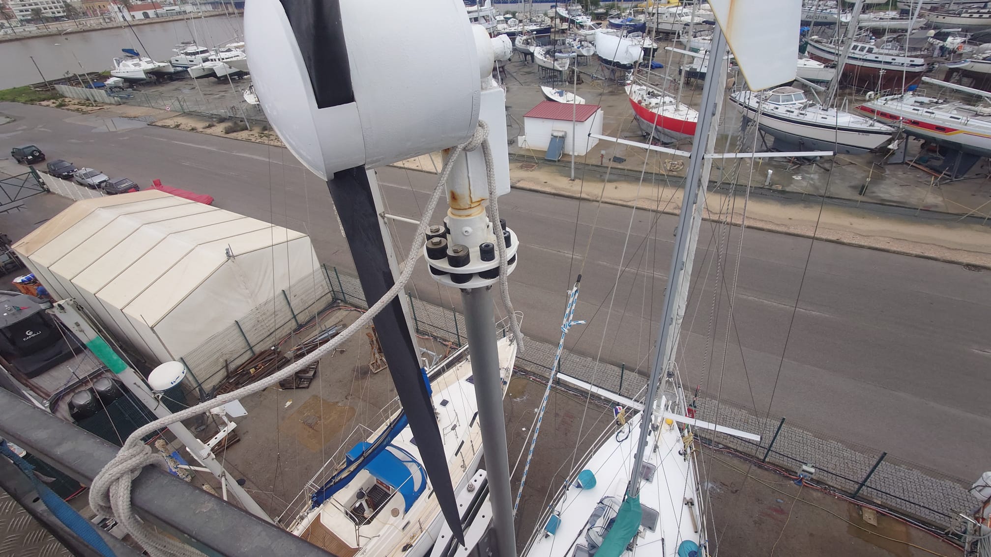 Wim prepares the new junction boxes for the wind generator cables in the mast top. But mounting these will probably have to wait till after the weekend… It will be stormy the next couple of days.