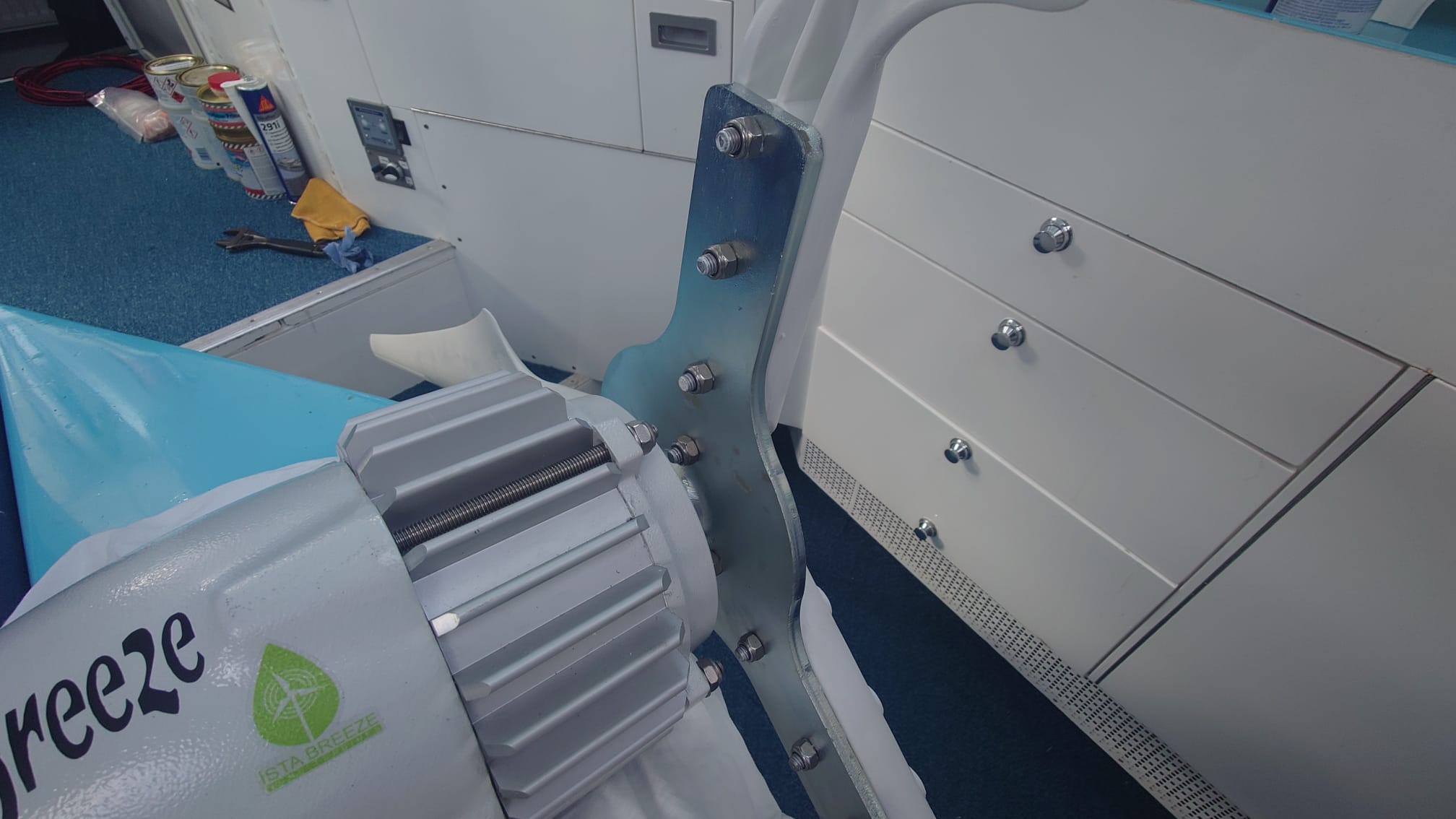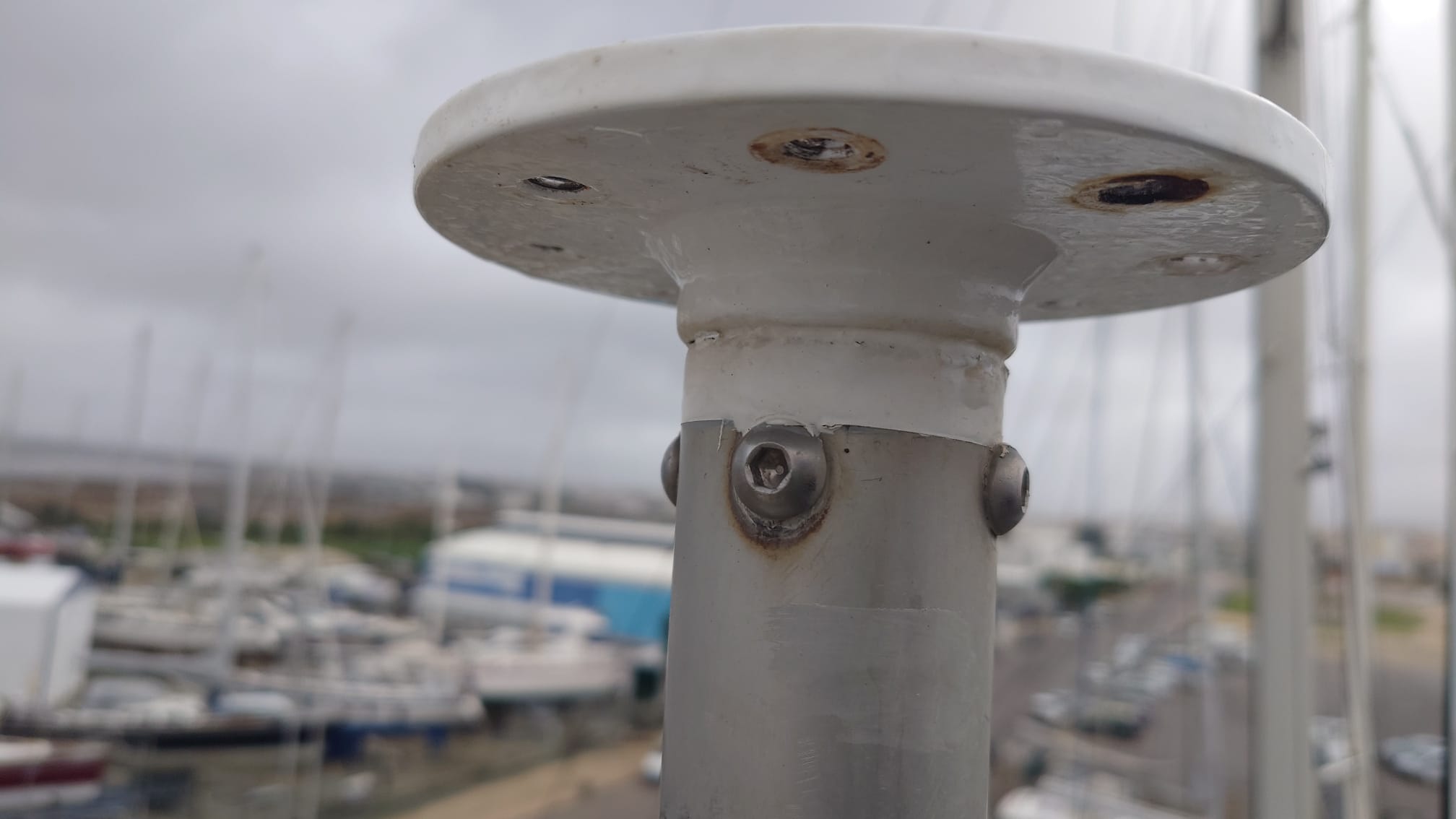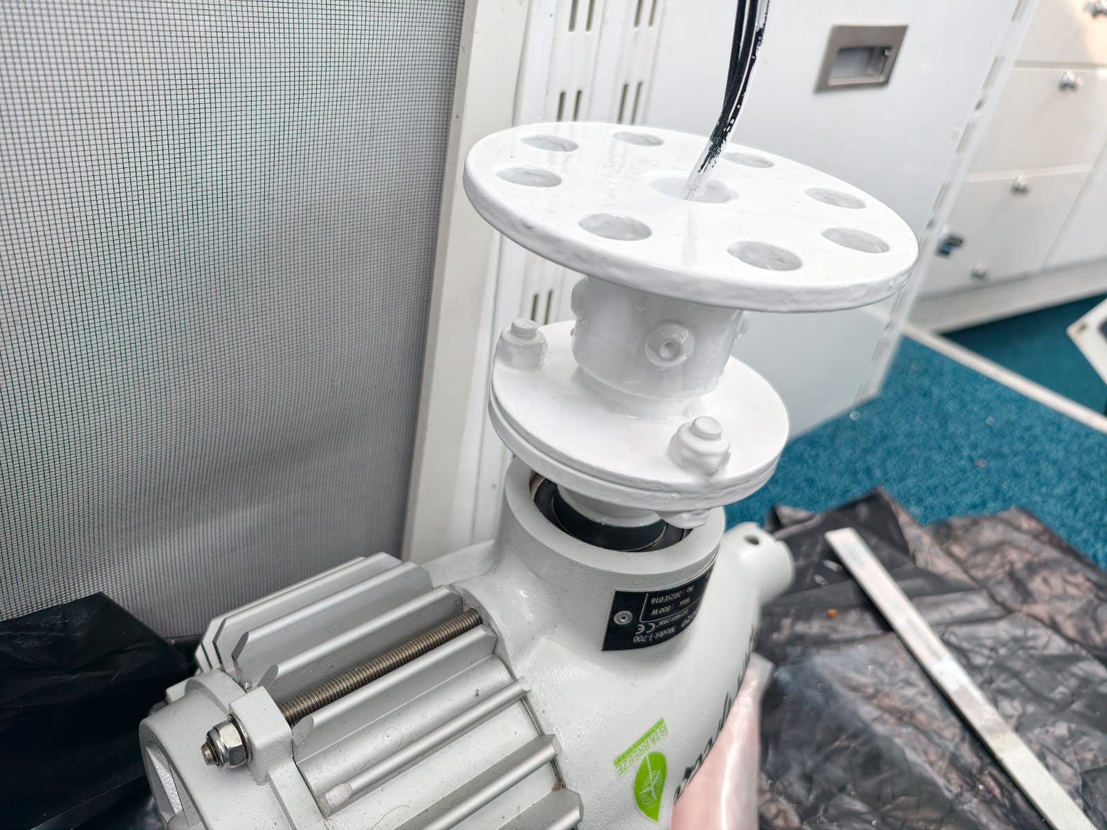 Wim goes on painting the wind generator mount. It has 4 layers of Interprotect primer and 2 layers of high gloss Perfection Pro.