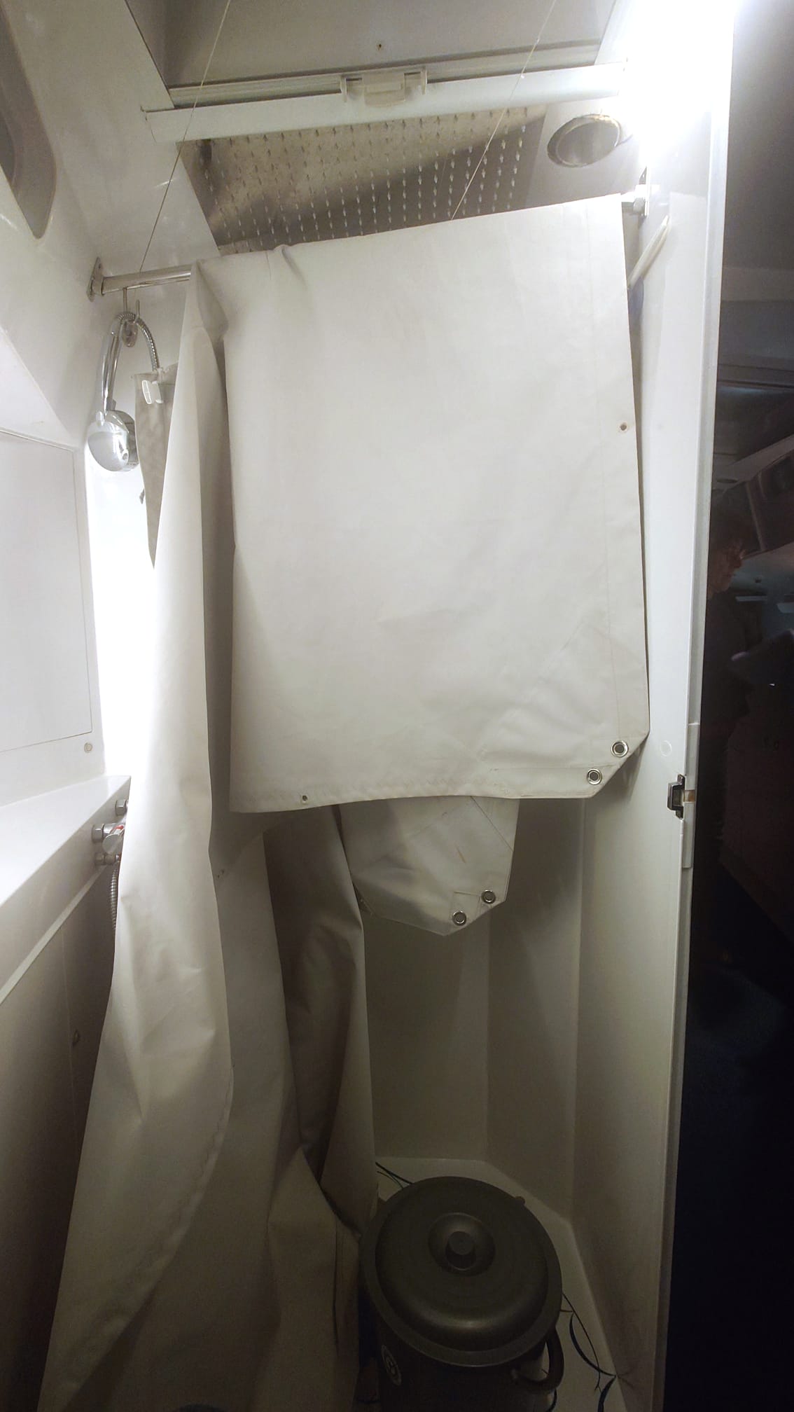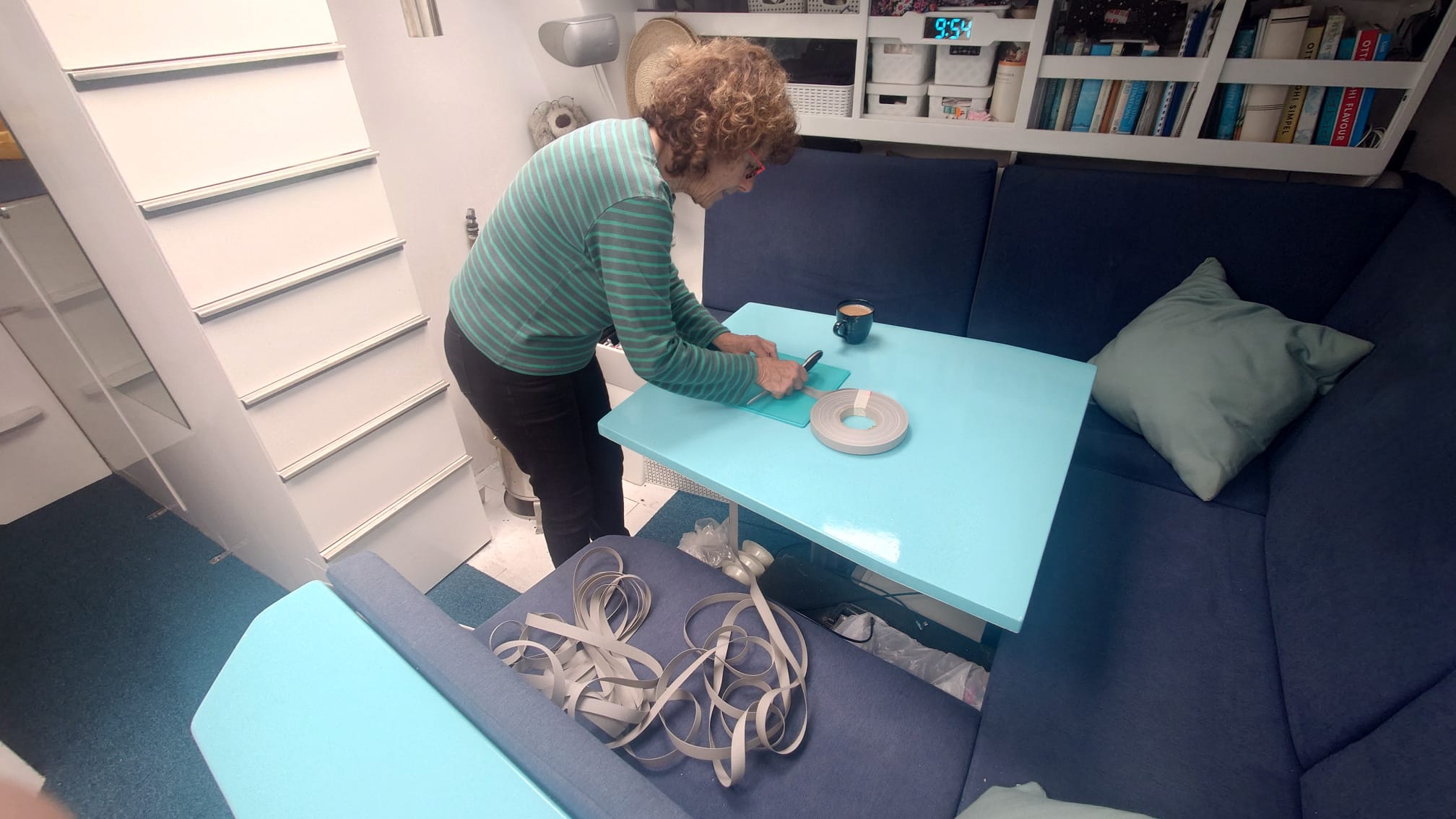 The fabric from the cockpit sun tent is a bit dirty. Since it’s rainy and windy all the time , Wim decides to clean it on the bathroom floor. Scrubbing it with hot water and some detergent, it is a big wet party with Wim in his birthday suit 💦😅💦. But in the end, it’s nice and clean! We let it hang on the bar to dry.