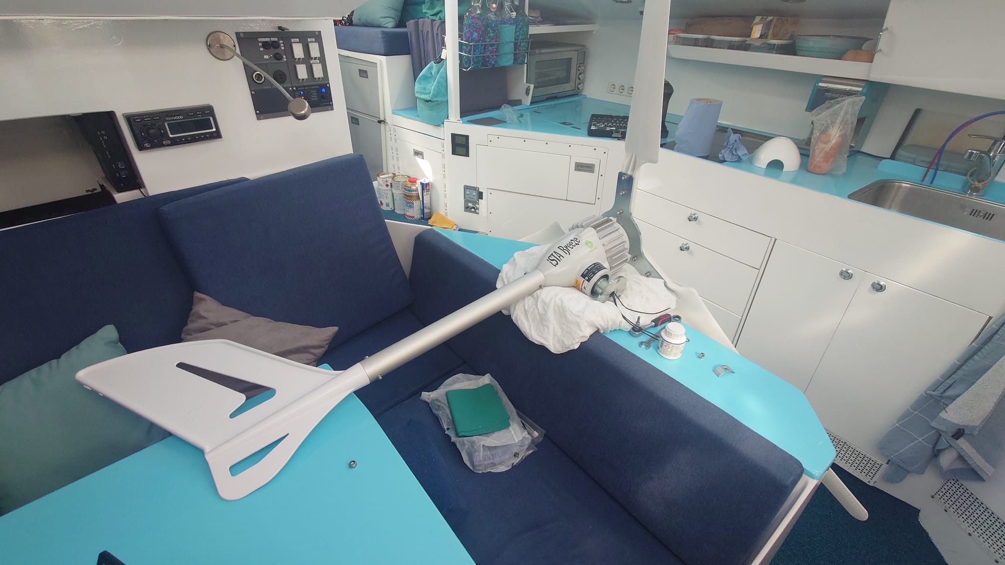 We had a 70kg’s gas spring left over from the time we replaced the gas spring under the aft bed by a 100kg’s one.