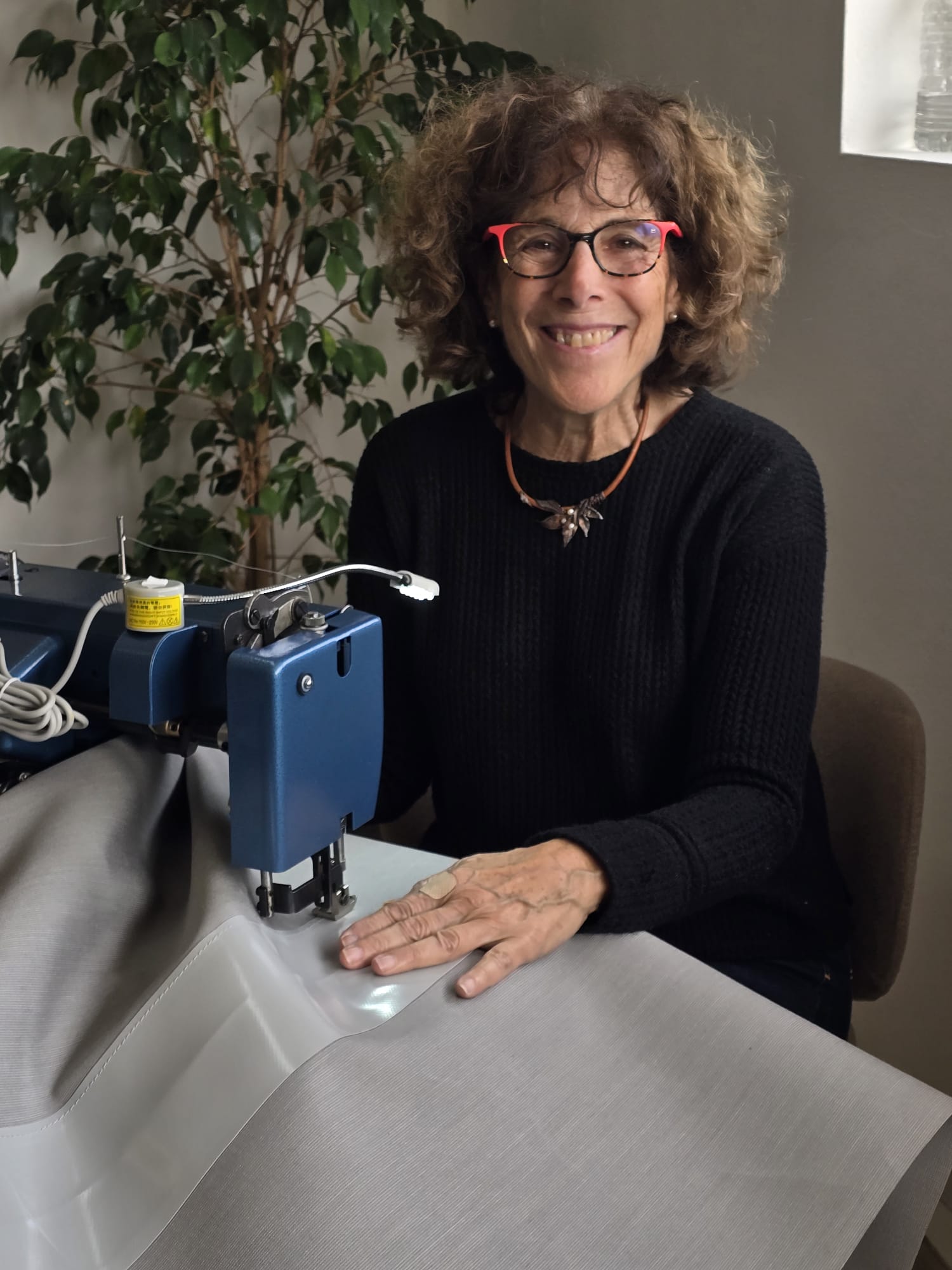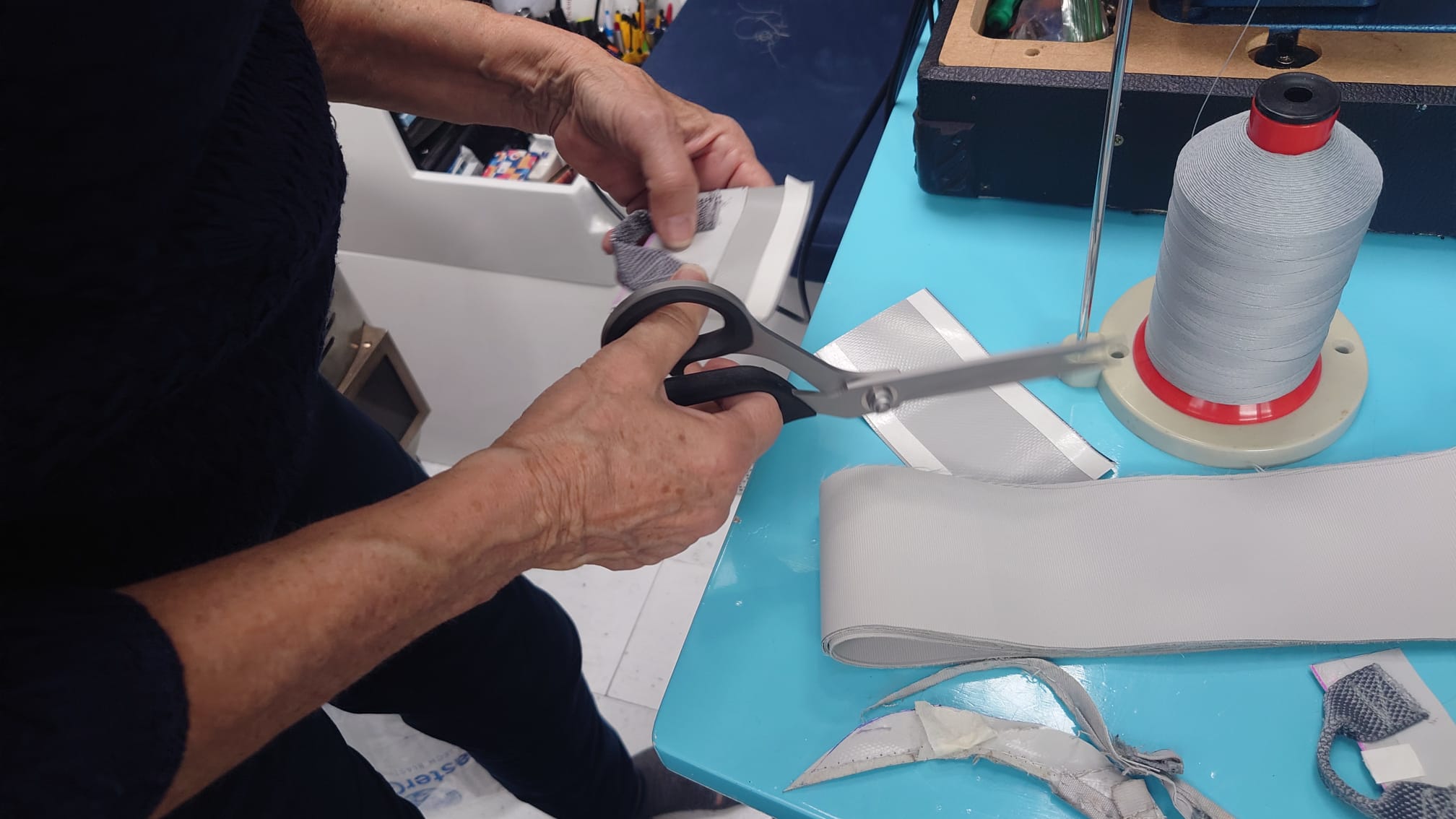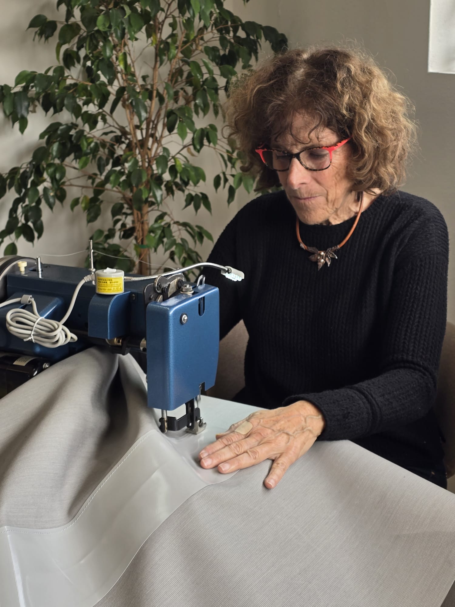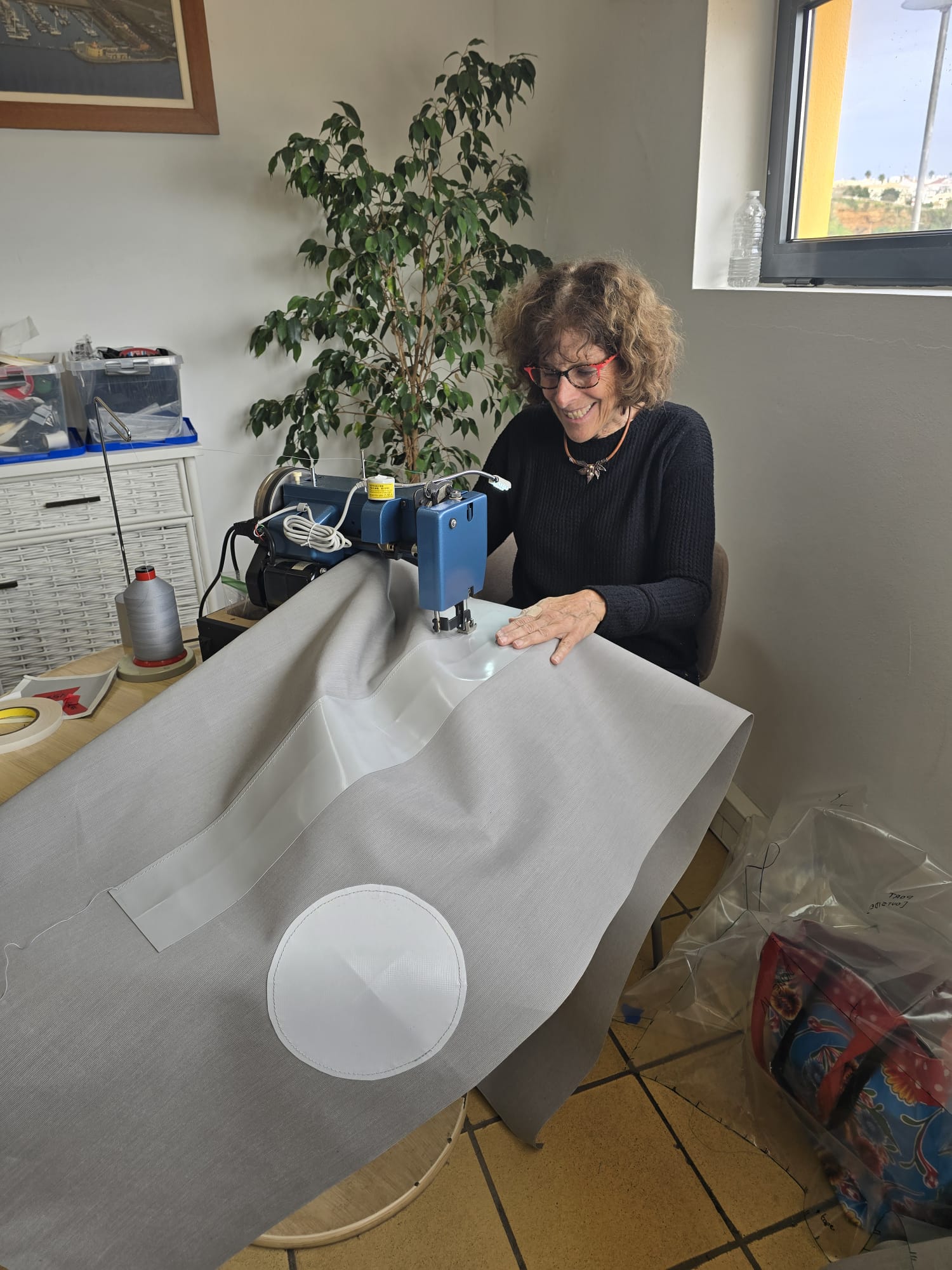 Sher works on modifications to the cockpit sun shade. She’s sewing in guides and end pockets for the battens to mount the solar panels.