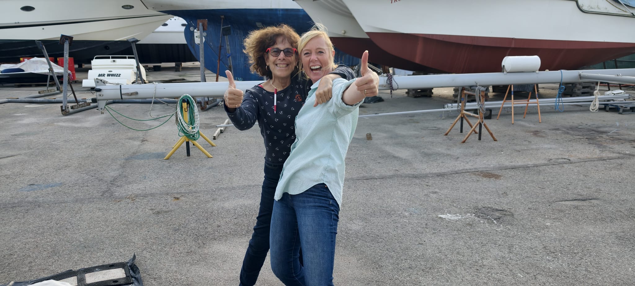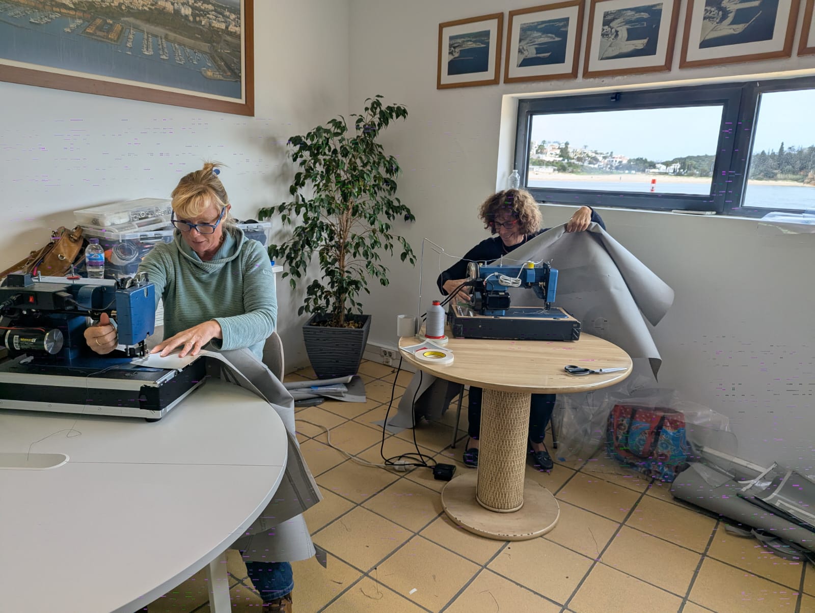 In the marina building, the ladies are busy sewing. They’re making covers for 3 dinghy’s: ours, “Bird Song” and “Zee van tijd”. Sacha (she has been a professional sail maker), explains to Sher.