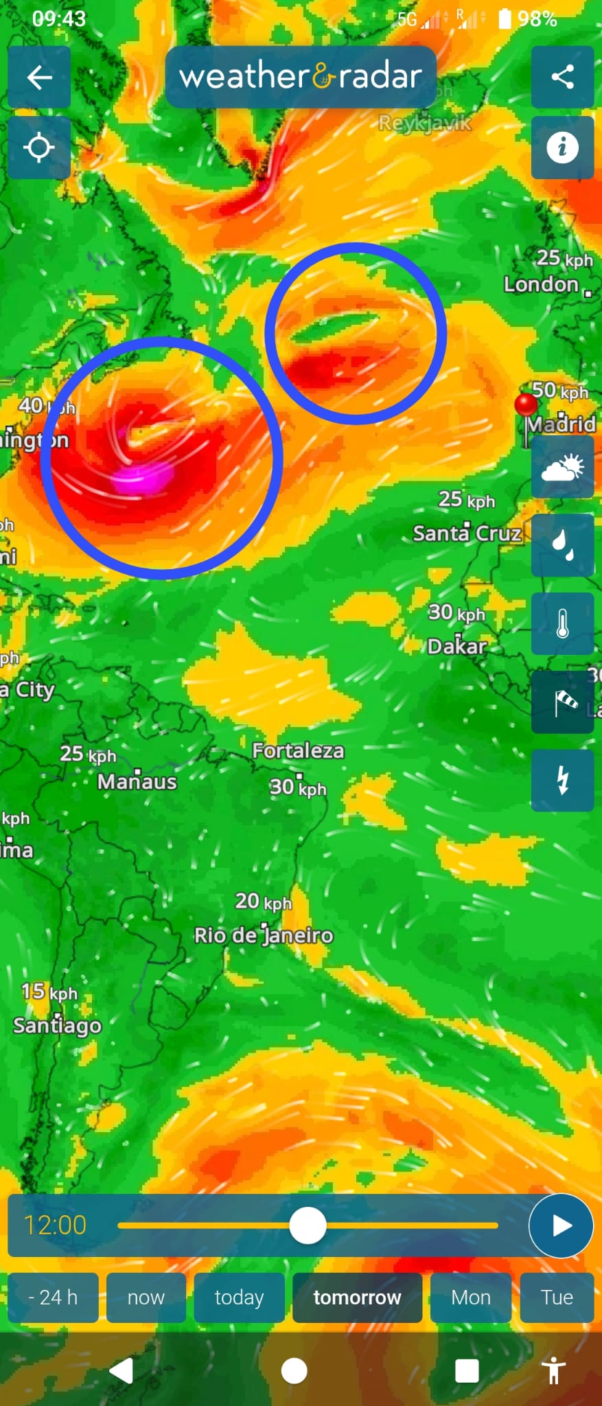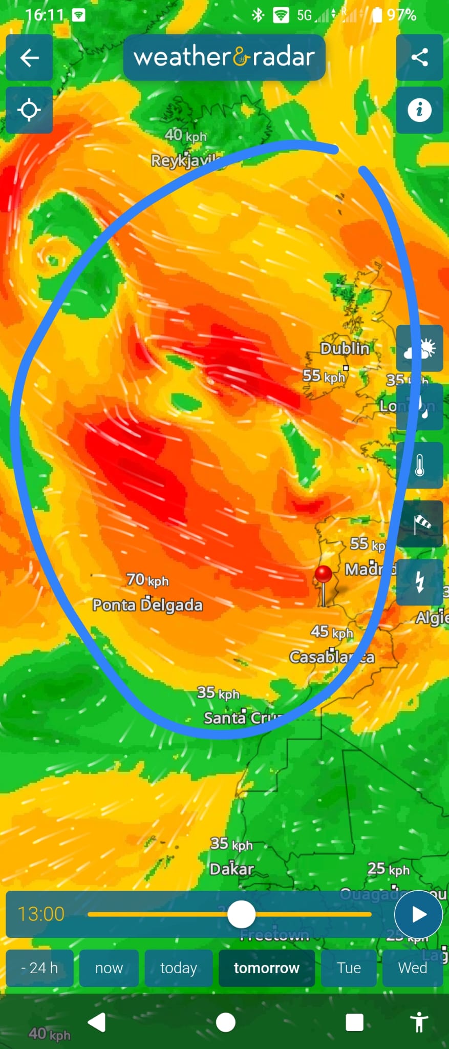 The weather is still crappy. Lots of wind and rain. Like we wrote before, it’s caused by these huge Atlantic depressions. This low pressure system (in the blue circle) reaches from Morocco to Iceland, 2000 nautical miles! And it hit the Portuguese coast with a full blast.