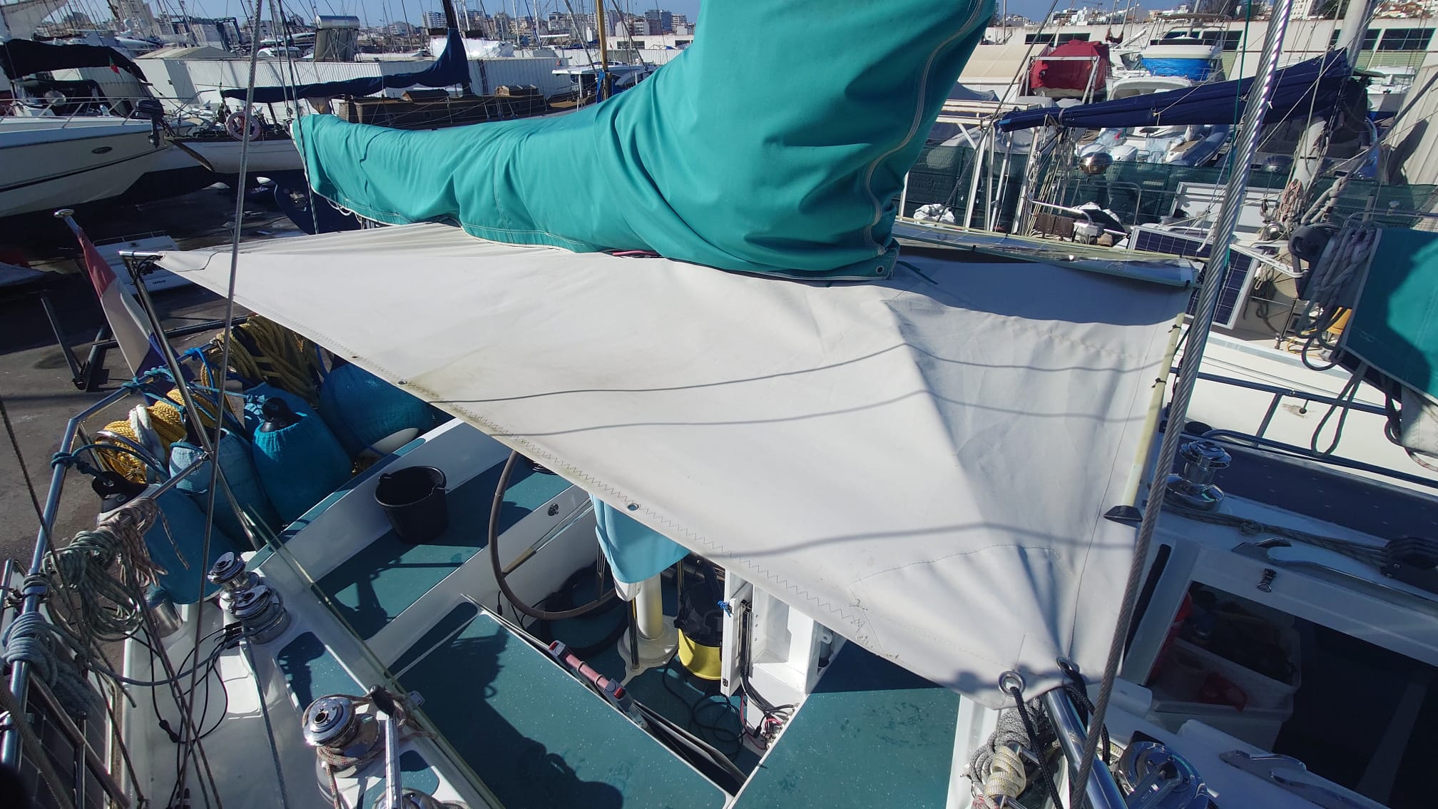 A dry moment! We remove the solar panels from the sun tent over the cockpit. Sher is going to make some modifications. She’s going to make pockets for the battens that support the solar panels and adjust the opening around the mast so the halyard doesn’t rub on it.