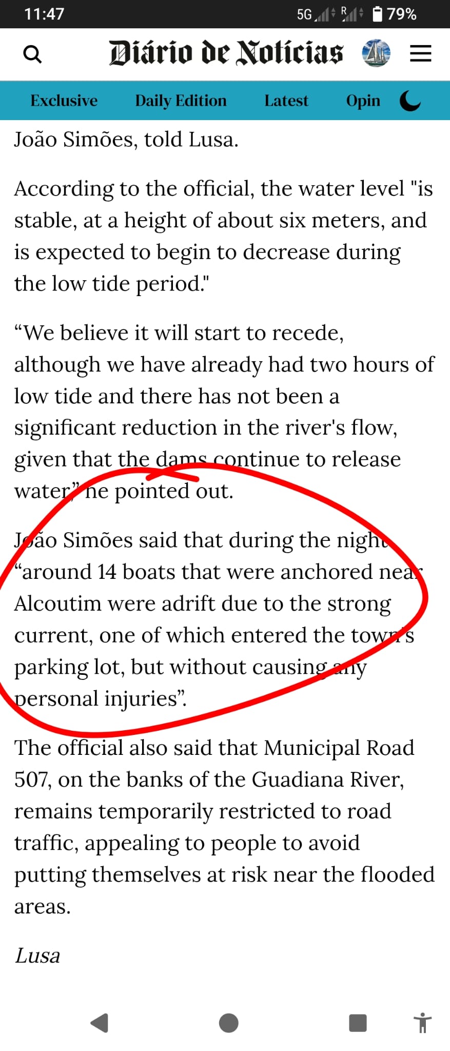 In the “Friends of Manoliño” WhatsApp group, we get a message from the German boat “Müggele”. They are anchored in the Guadiana river on the border between Spain and Portugal, and because of all the rain, 2 dams are discharging a huge amount of water. The current in the river has gone to 8 knots and the water level has risen 8m!! They were rescued last night by the maritime police and they are ashore while their boat is still at anchor! How awful!! The situation is dramatic. A large number of boats lost their anchor and are adrift. Lots of big debris in the river (like boats, logs and entire trees) that could hit their boat. Oops… we’re happy to be safely located on land in the boatyard…🫡