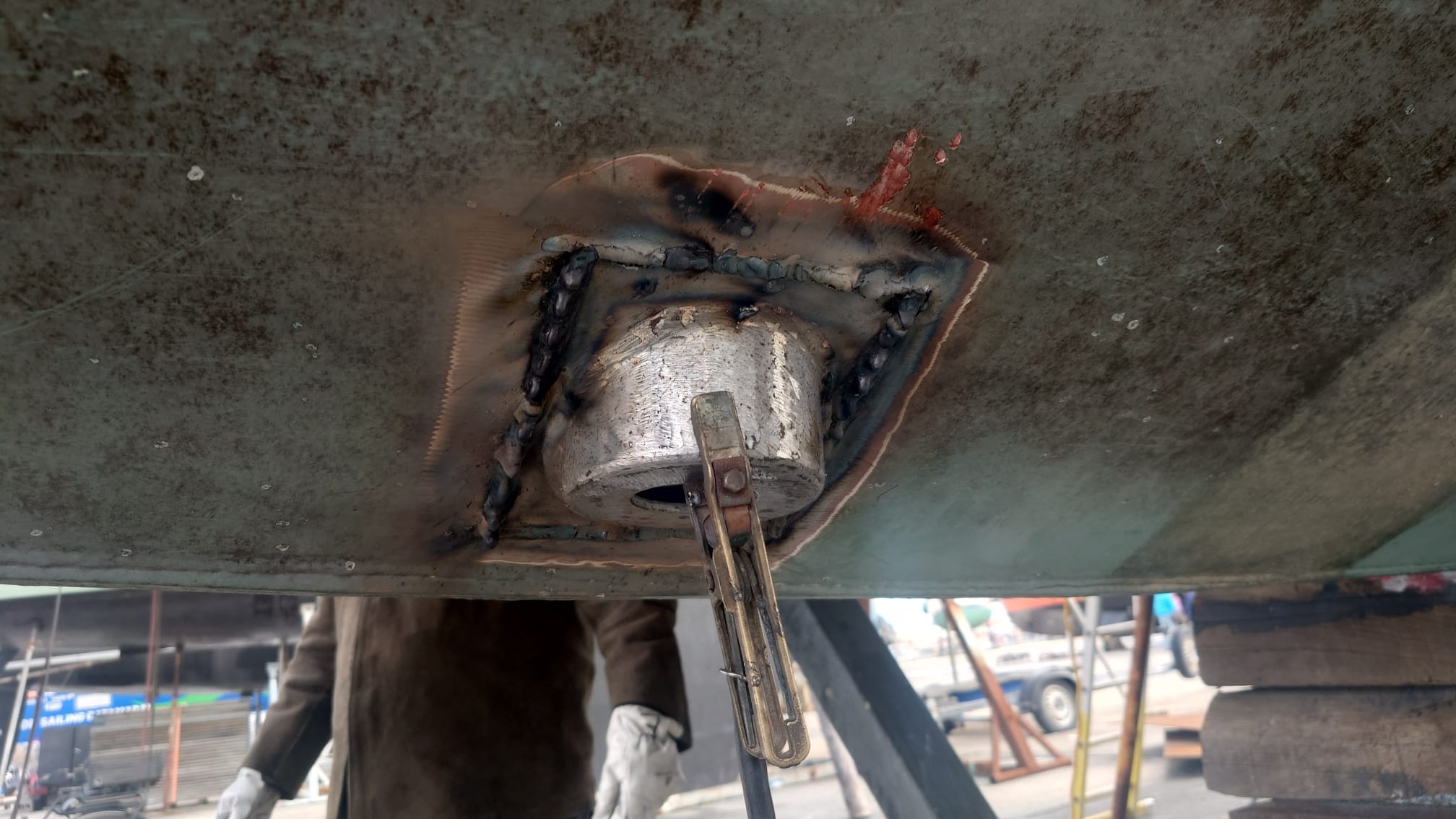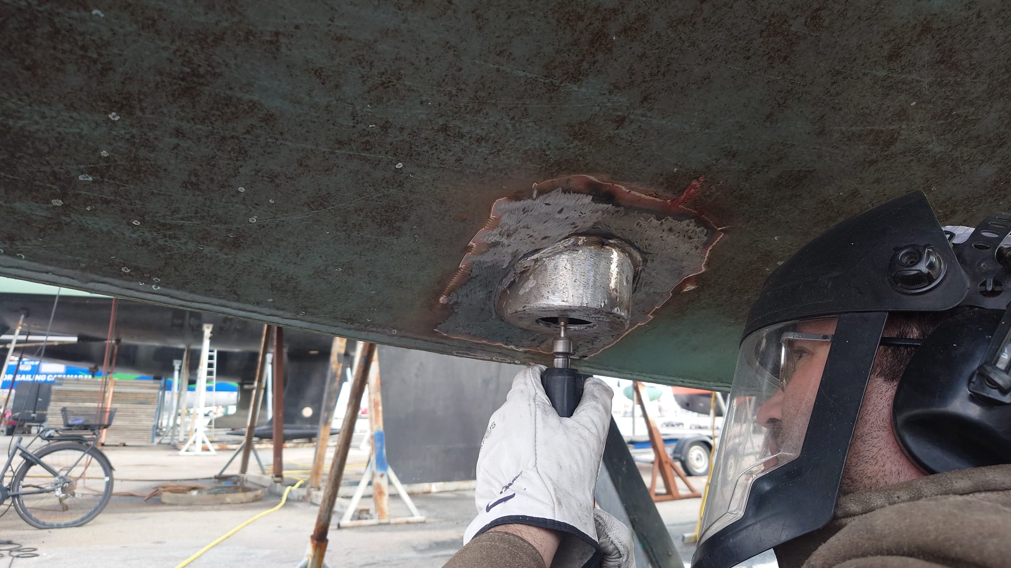 They knock hard on the boat and immediately get to work! Wim has to switch off all electric systems and disconnect the starter battery quickly! The electric currents while welding on the boat could damage things…