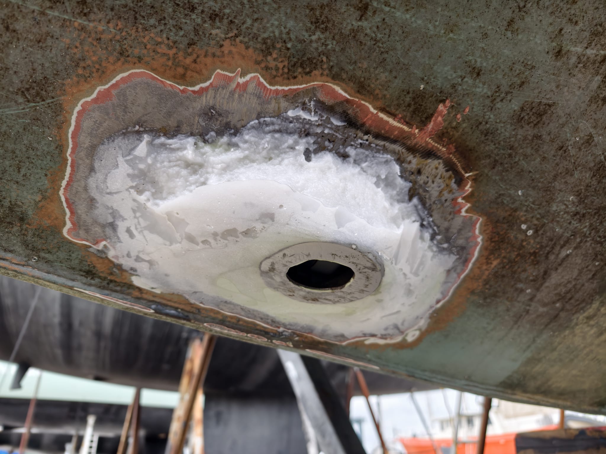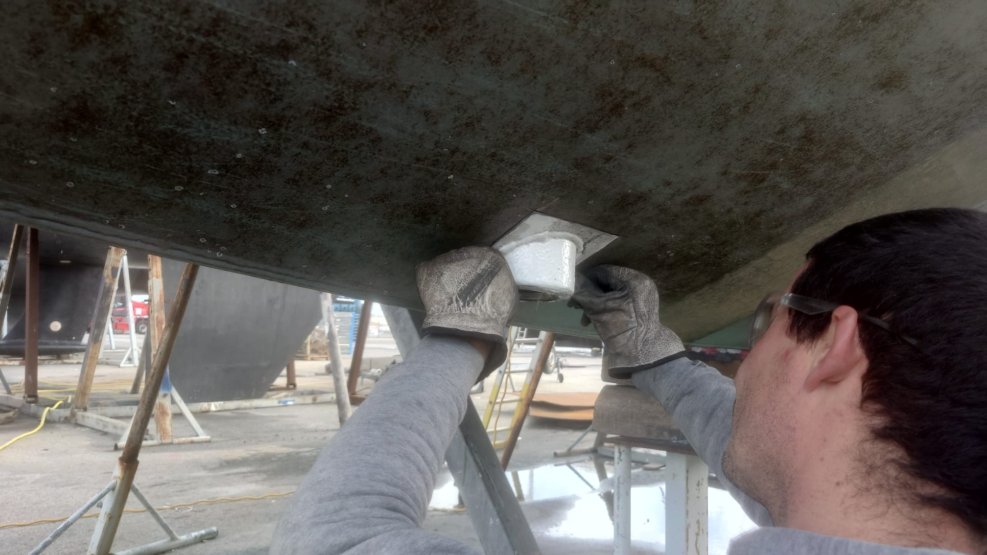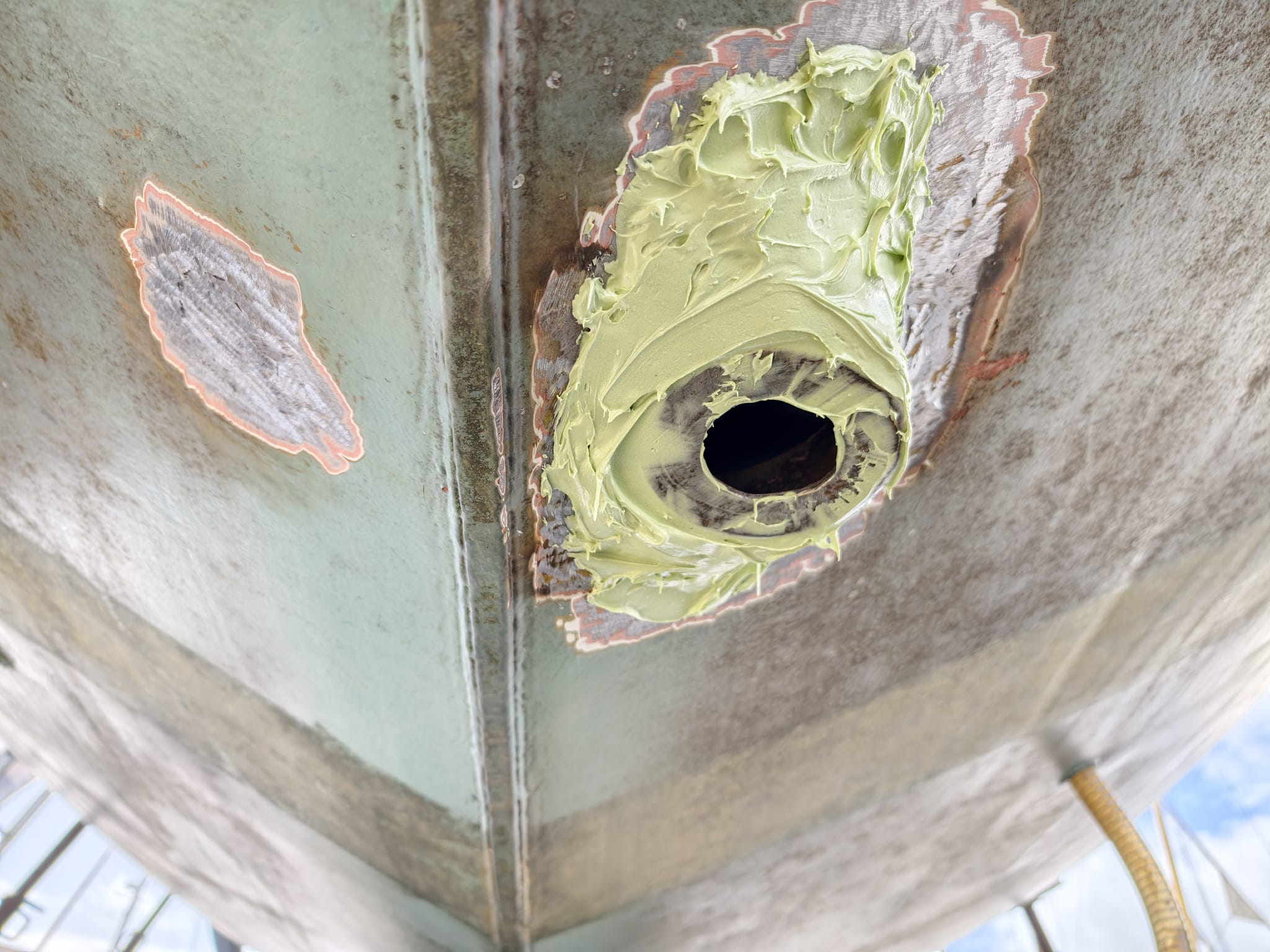 Now that it’s not raining, Wim starts to make a shape around the new transducer pot. A nice convex shape has to be made with epoxy filler in order to have a nice flow of water for the speed transducer with no turbulence or accelerations.