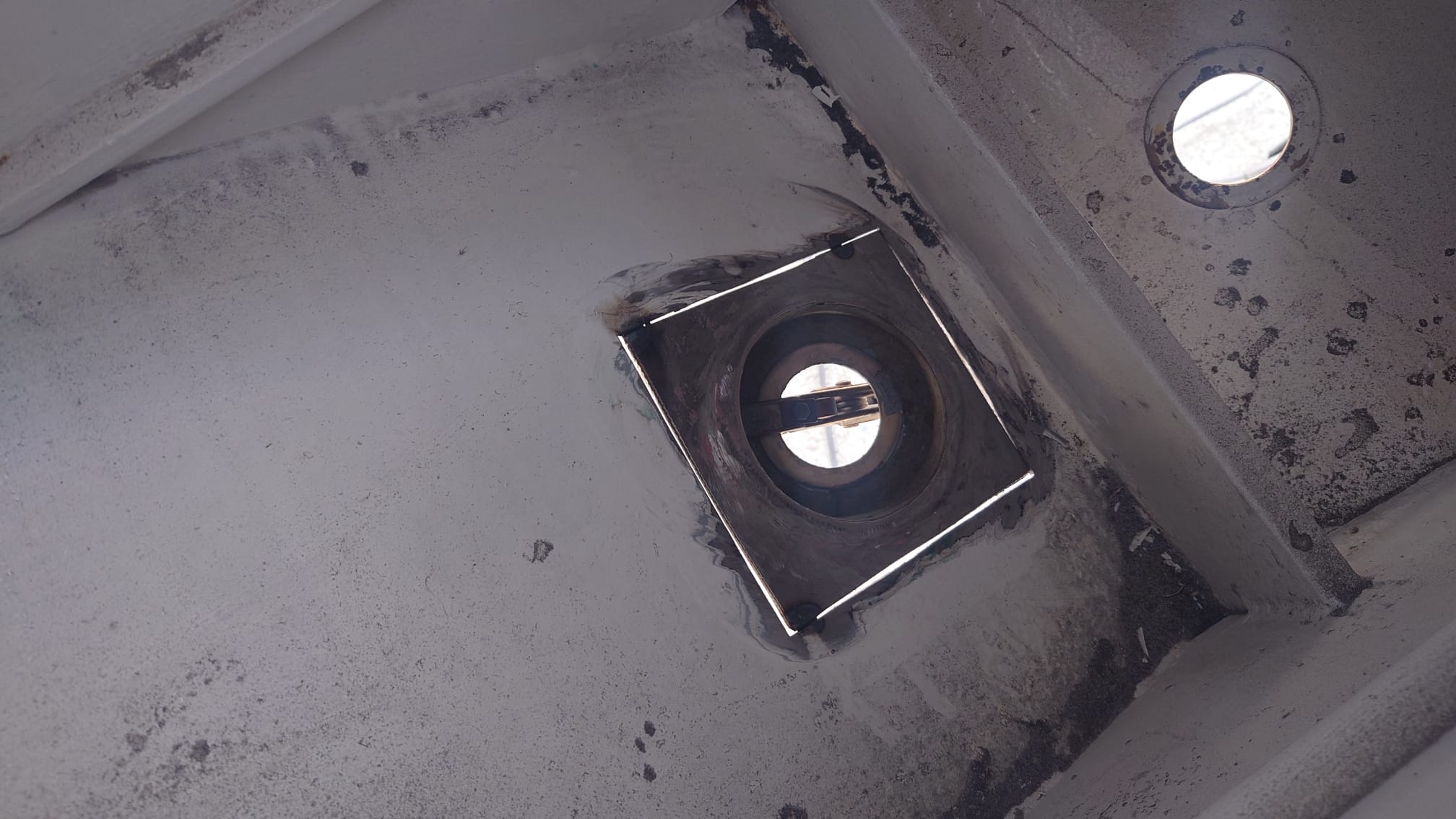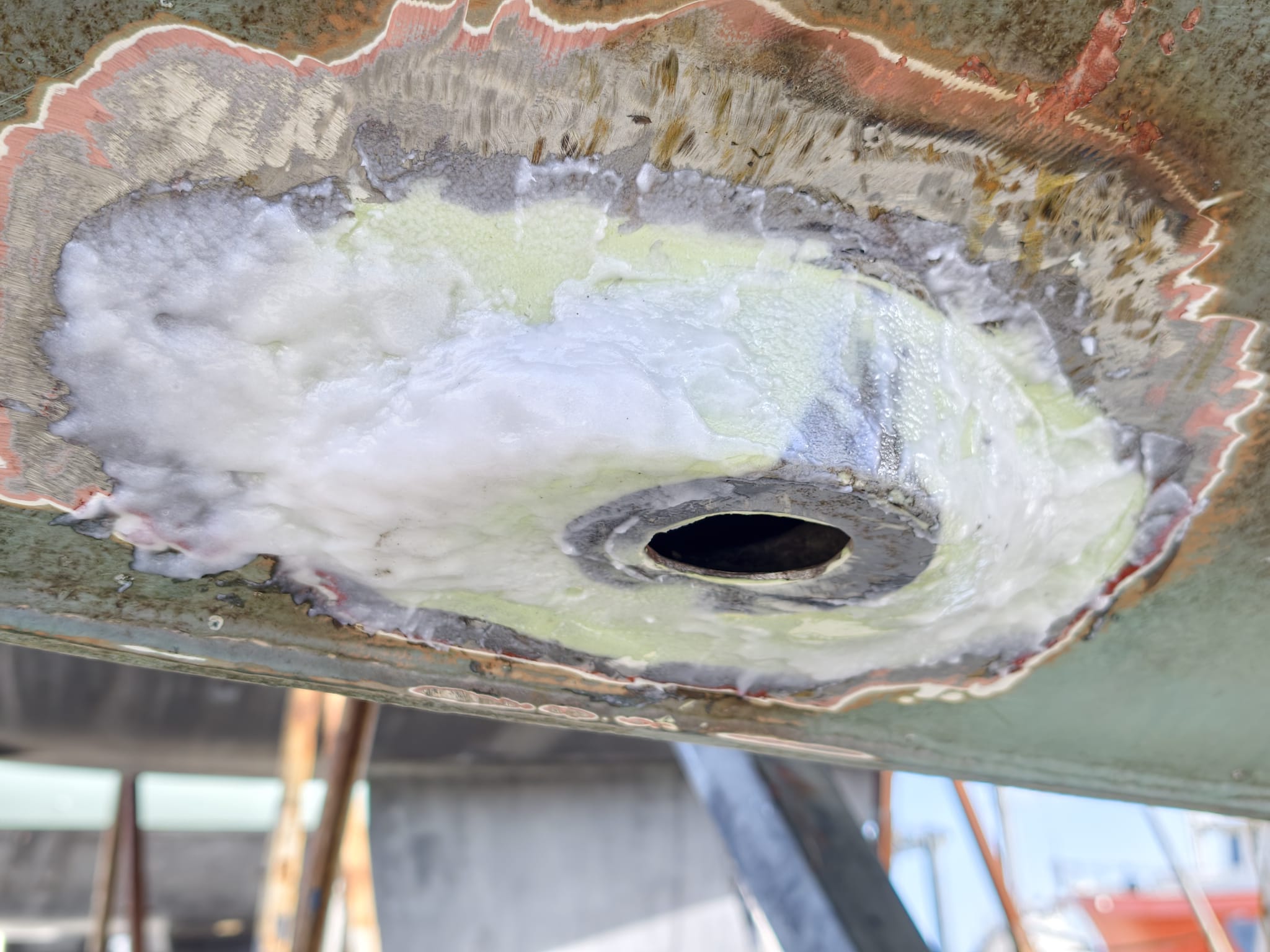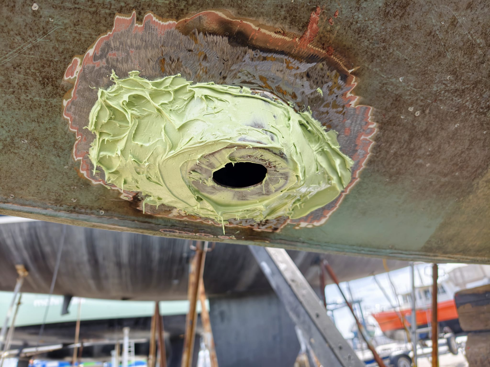 Now that it’s not raining, Wim starts to make a shape around the new transducer pot. A nice convex shape has to be made with epoxy filler in order to have a nice flow of water for the speed transducer with no turbulence or accelerations.