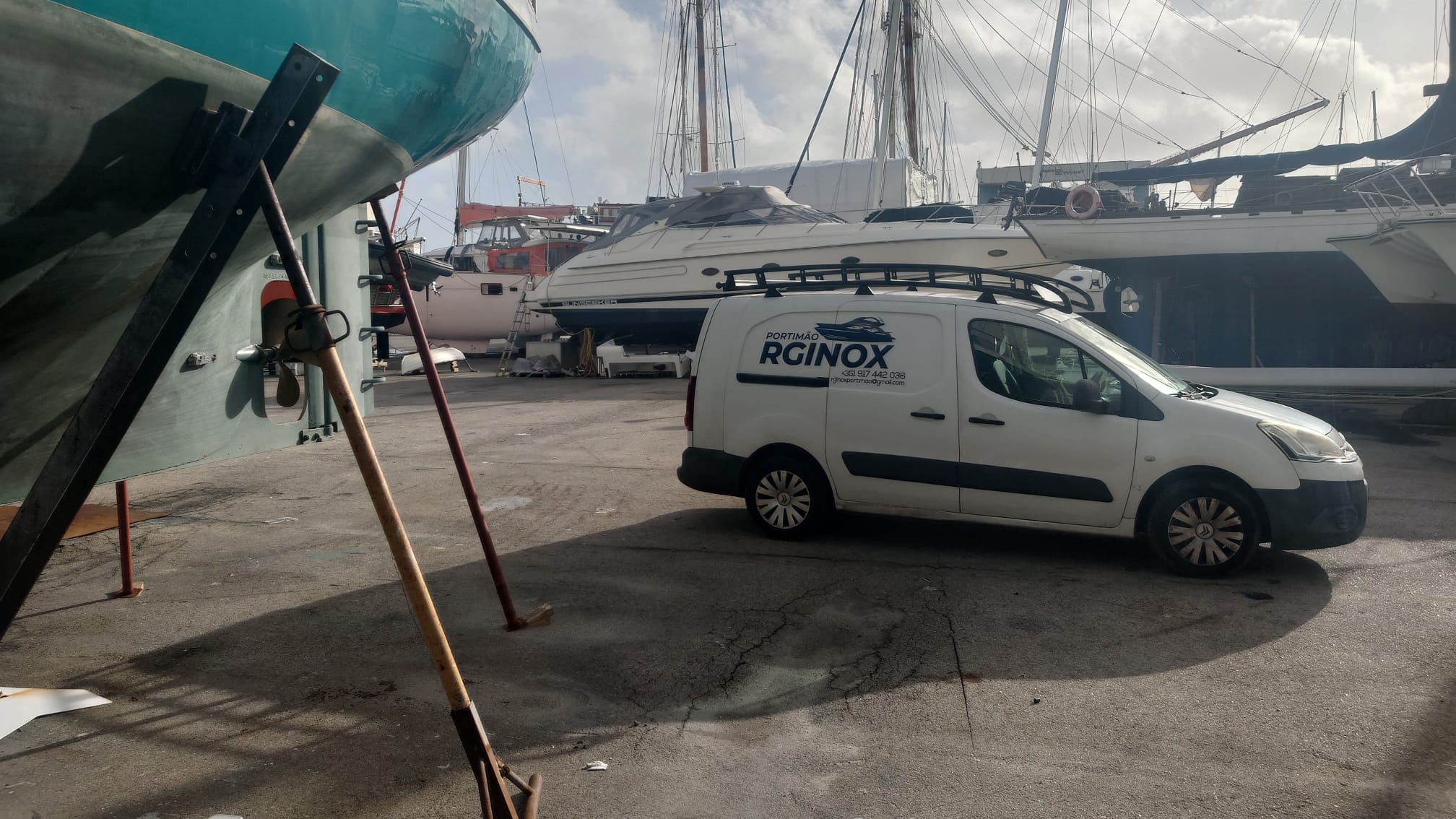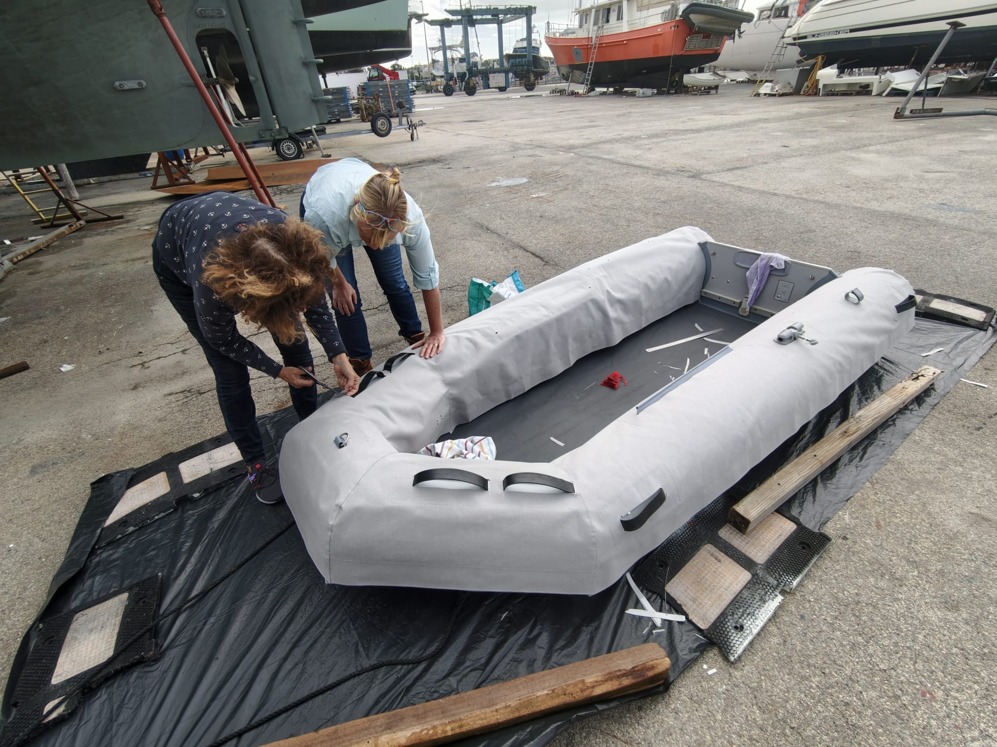We put the dinghy on a piece of plastic next to Dione IV to fit the cover. The boatyard ground is very dirty and full of rusty dust.