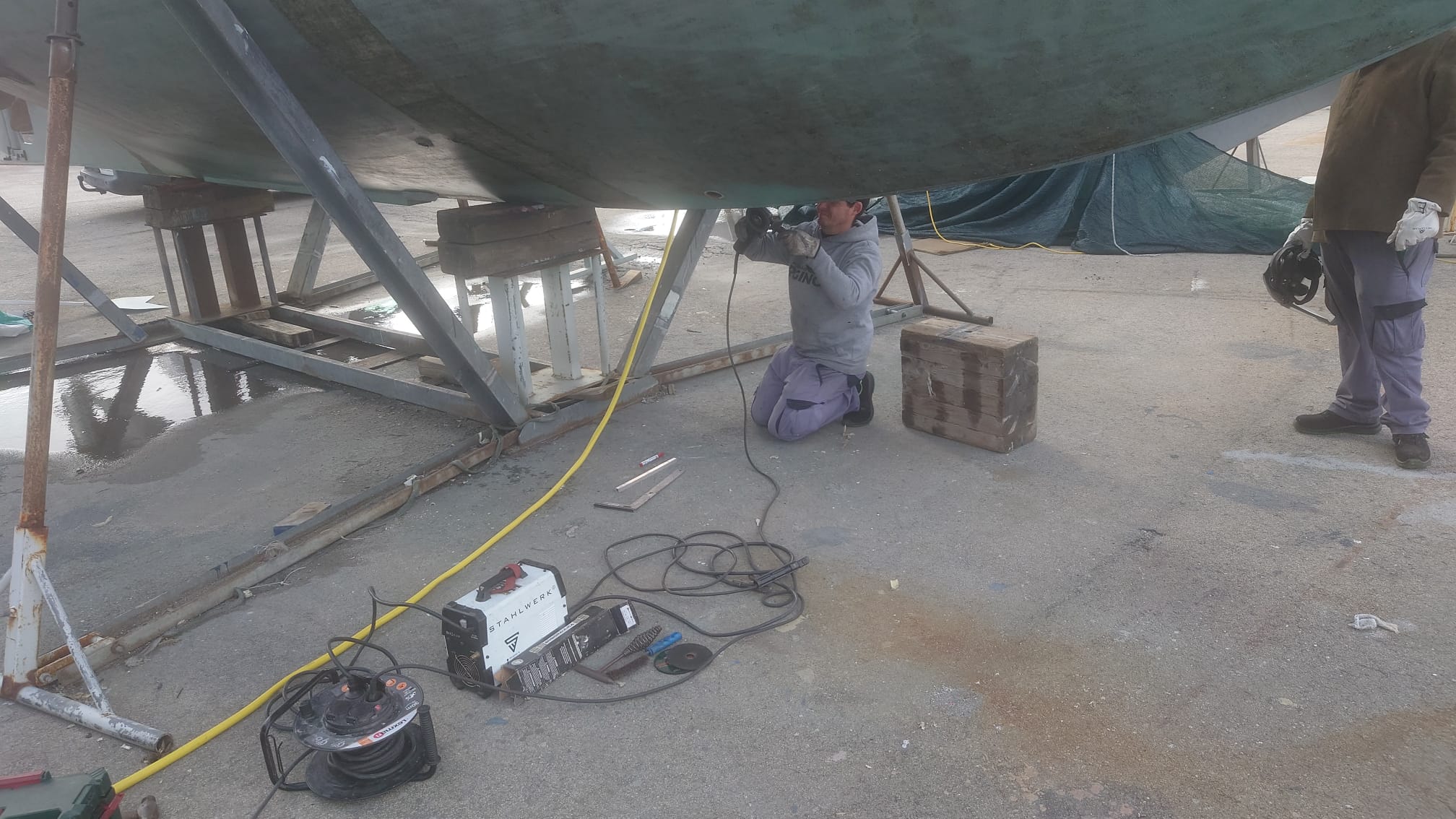 They immediately get to work! Wim has to switch off all electric systems and disconnect the starter battery quickly! The electric currents while welding on the boat could damage things…