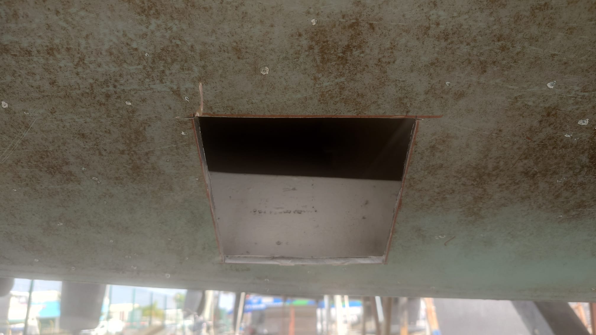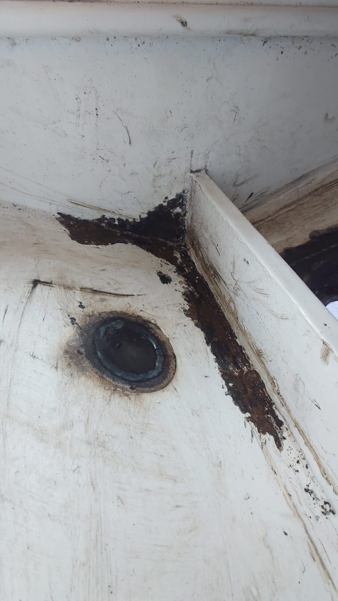 Wim removes some rust which is under the paint by where the welding was done. He did this before in this bilge and re-painted it. But it seems the rust continues under the paint. Obviously the rust wasn’t removed well enough. This time, we’ll sand-blast these spots. Hopefully that will provide a better adhesion for the primer.