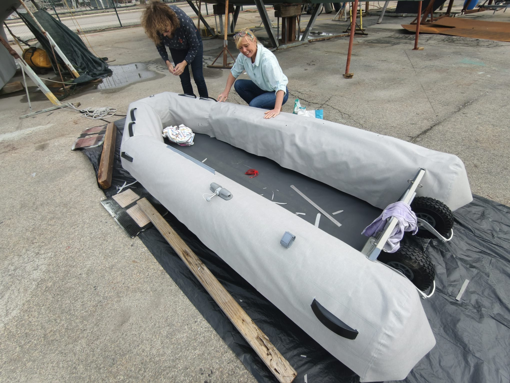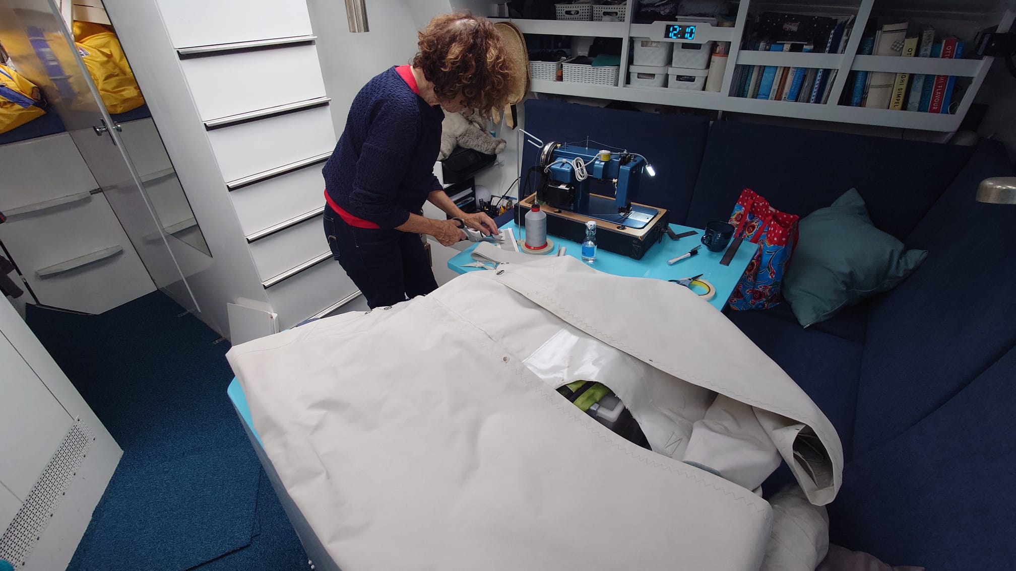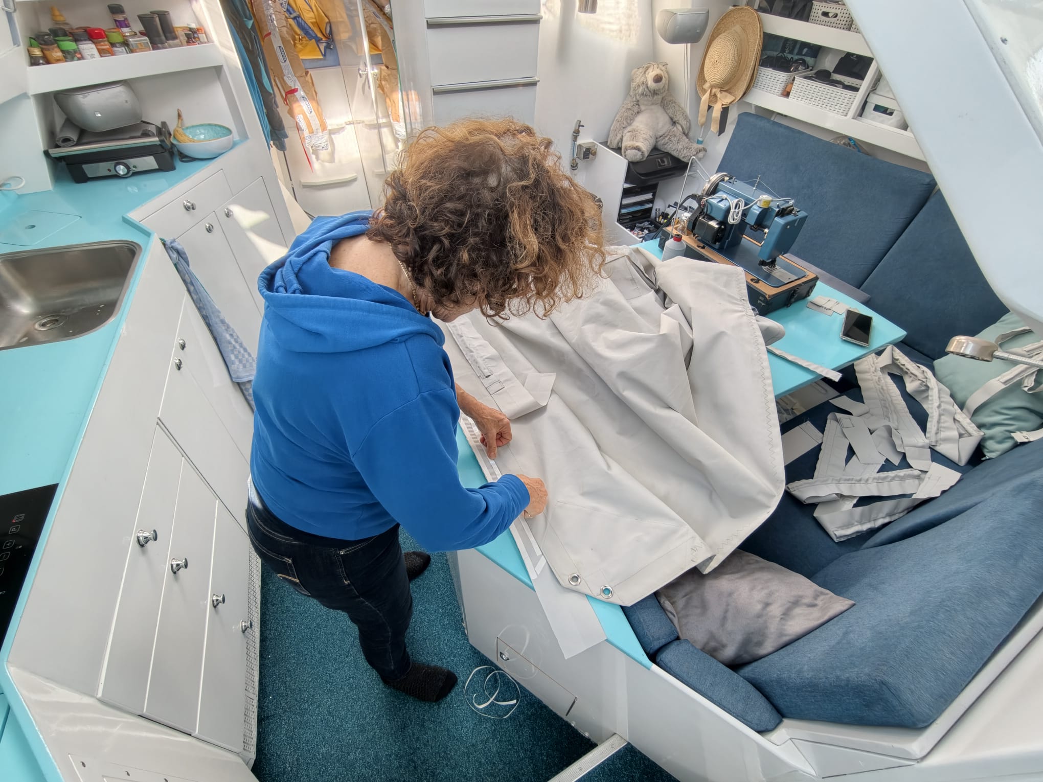 Also Sacha comes to help Sher work on the dinghy cover and fit it, since the weather is nice. They start sewing the parts that were made from the patterns together.