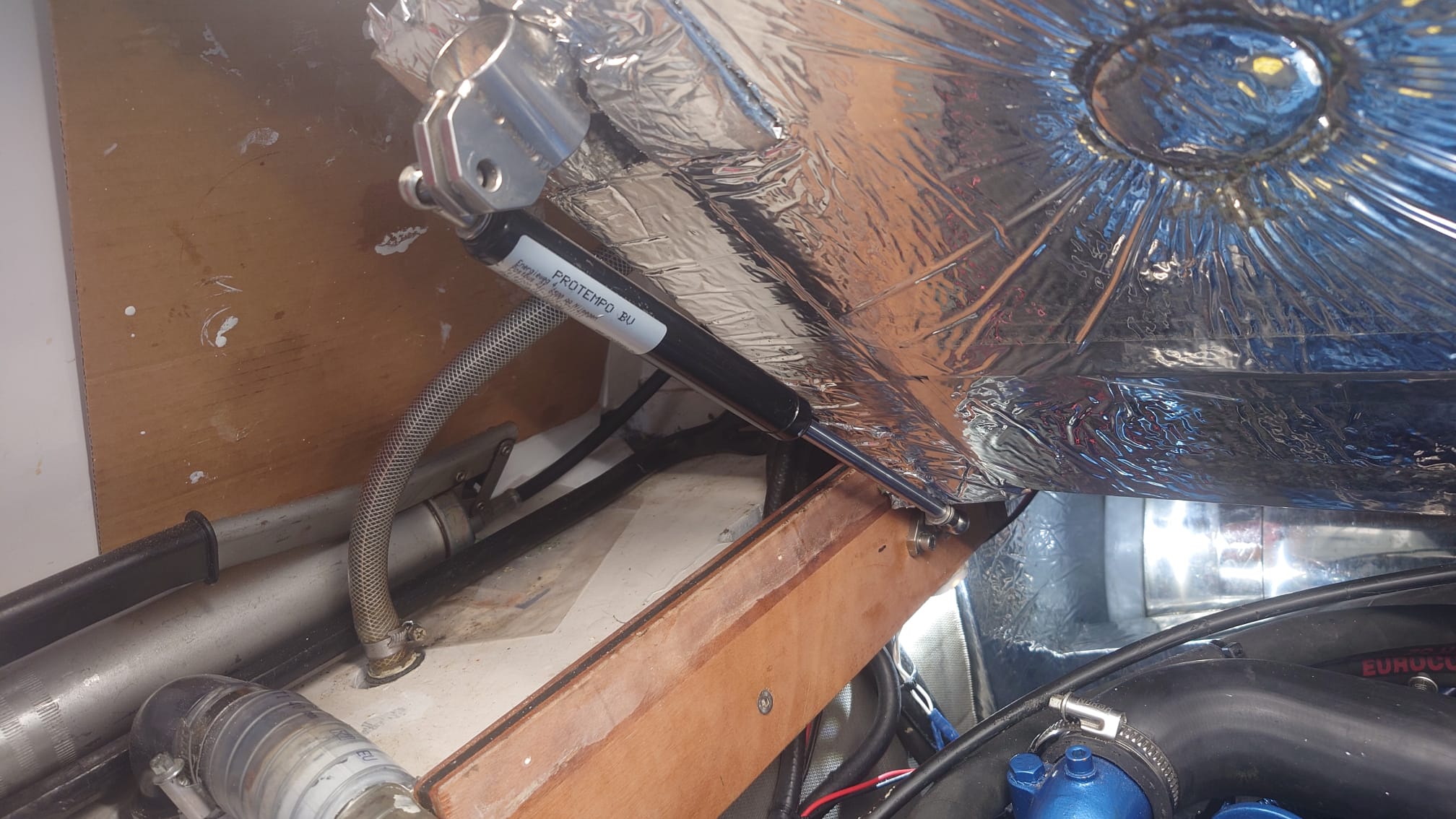 Another small job on the list is a gas spring on the engine hatch. The hatch is made of heavy anti-resonance plywood, heavy sound proofing material and heavy carpet tiles on top. All together about 40kg.