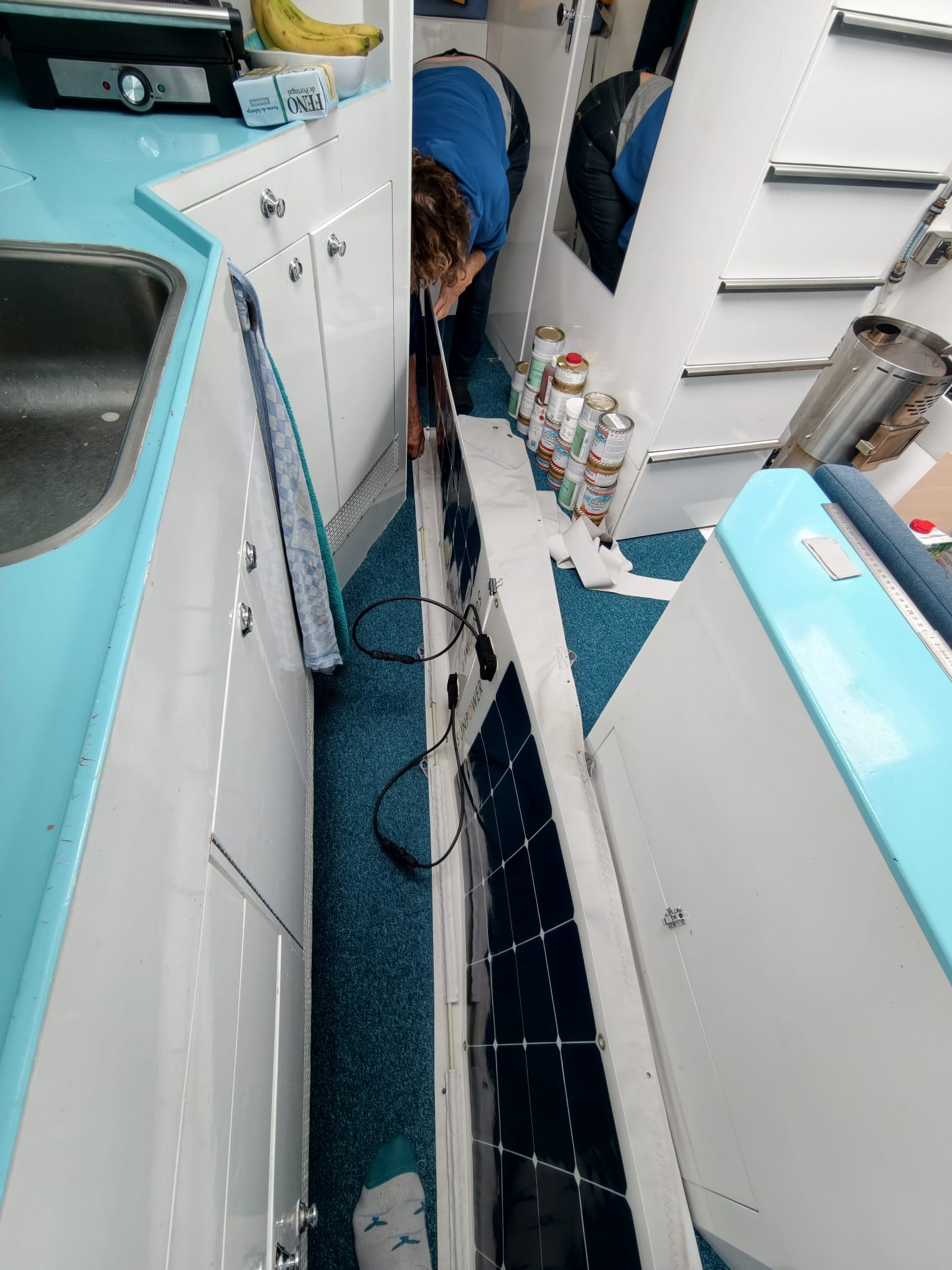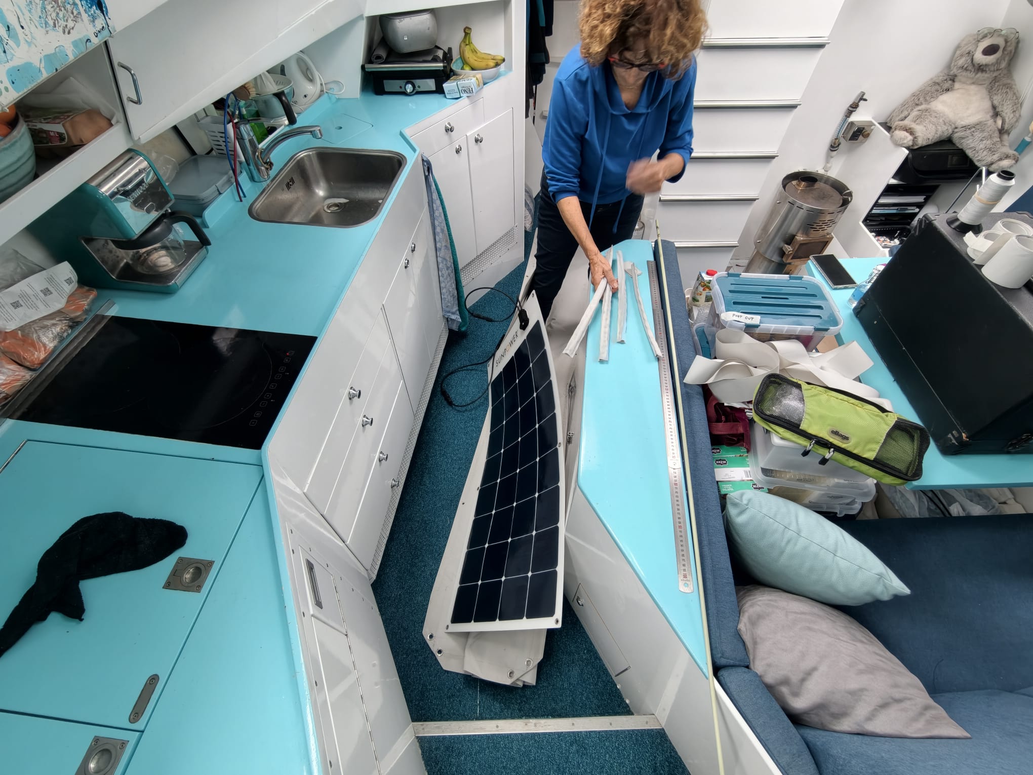 A dry moment! We remove the solar panels from the sun tent over the cockpit. Sher is going to make some modifications. She’s going to make pockets for the battens that support the solar panels.
