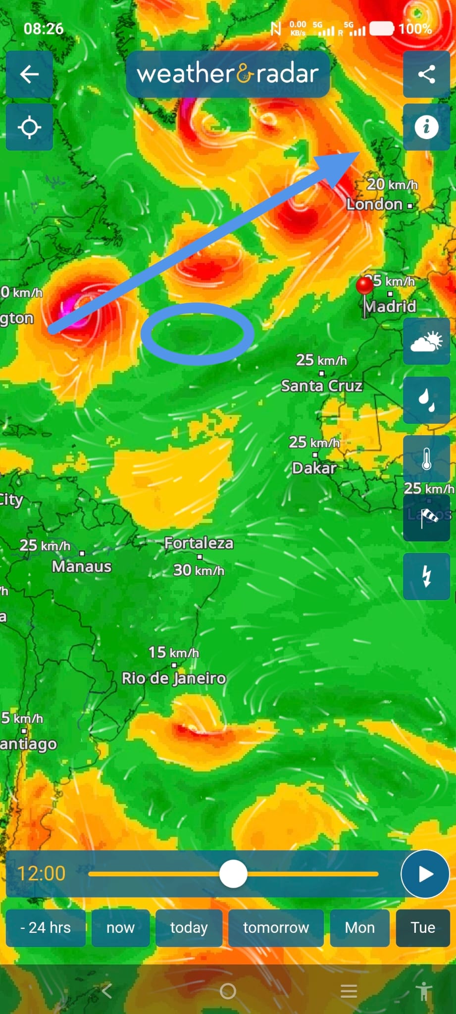 This is the reason why the weather has improved. The Azores high pressure has been way south of the Azores in the past 4 weeks. That gave the depression train room to go more more south and hit Portugal. Now, the Azores high is back in place (the blue oval). That pushes the depressions more to the north, to Ireland, Scotland and Norway. Here, at the Algarve, we stay out of these depressions and we get more influence from southern weather systems.