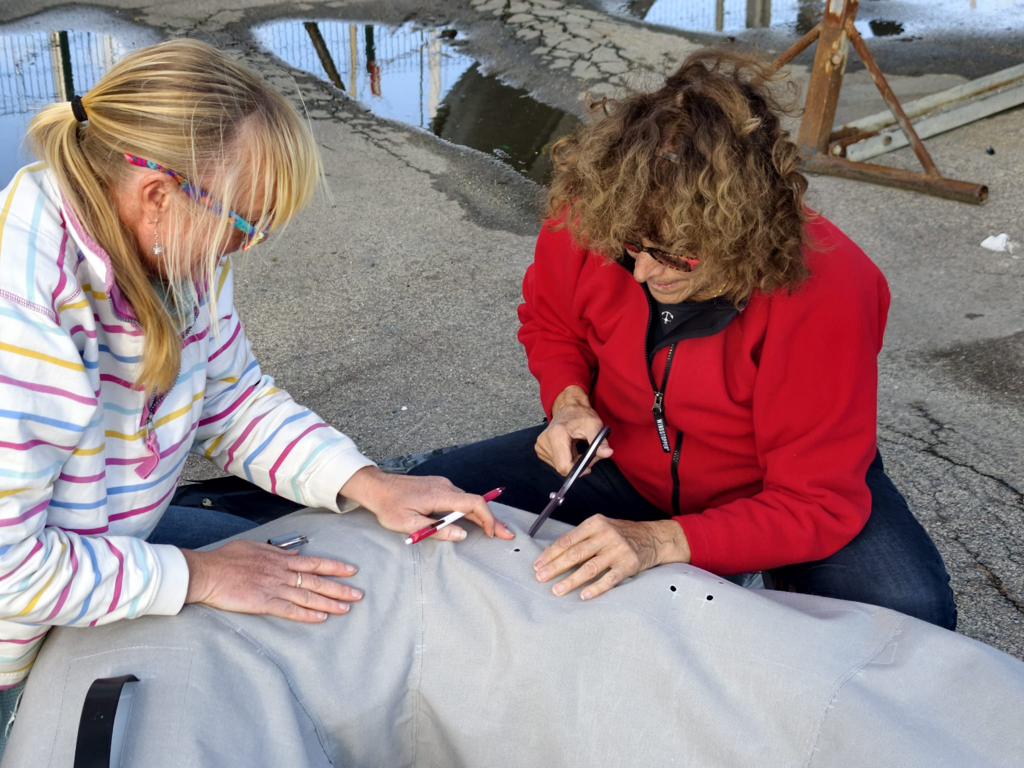 Sacha comes again to help Sher with cutting the holes in the dinghy cover. A very precise and delicate job!