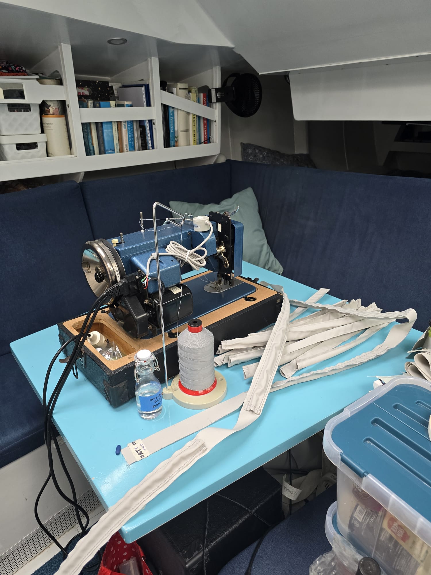 She takes the Sailrite sewing machine with her. It’s heavy. We had to lower it down with the main halyard.