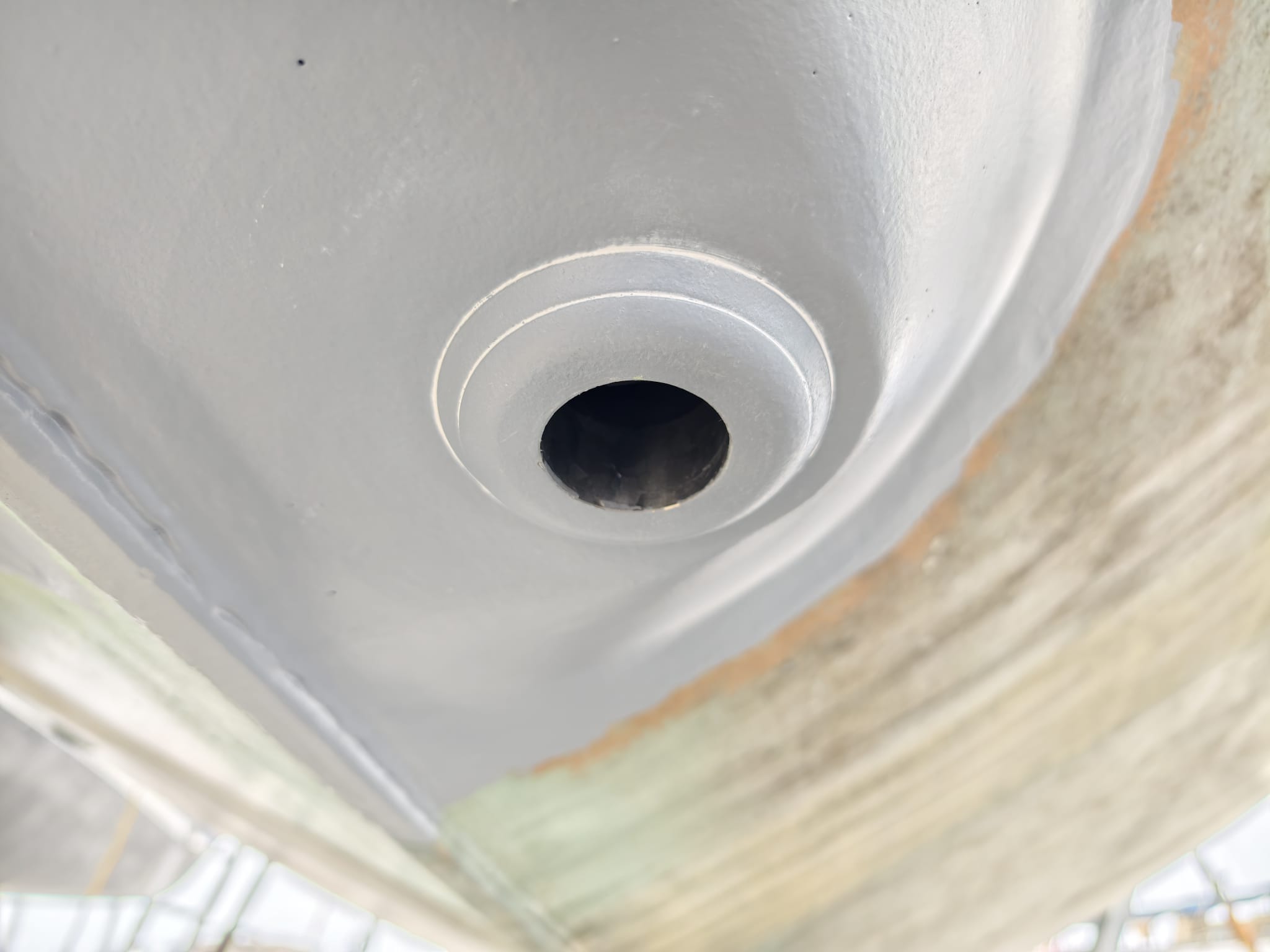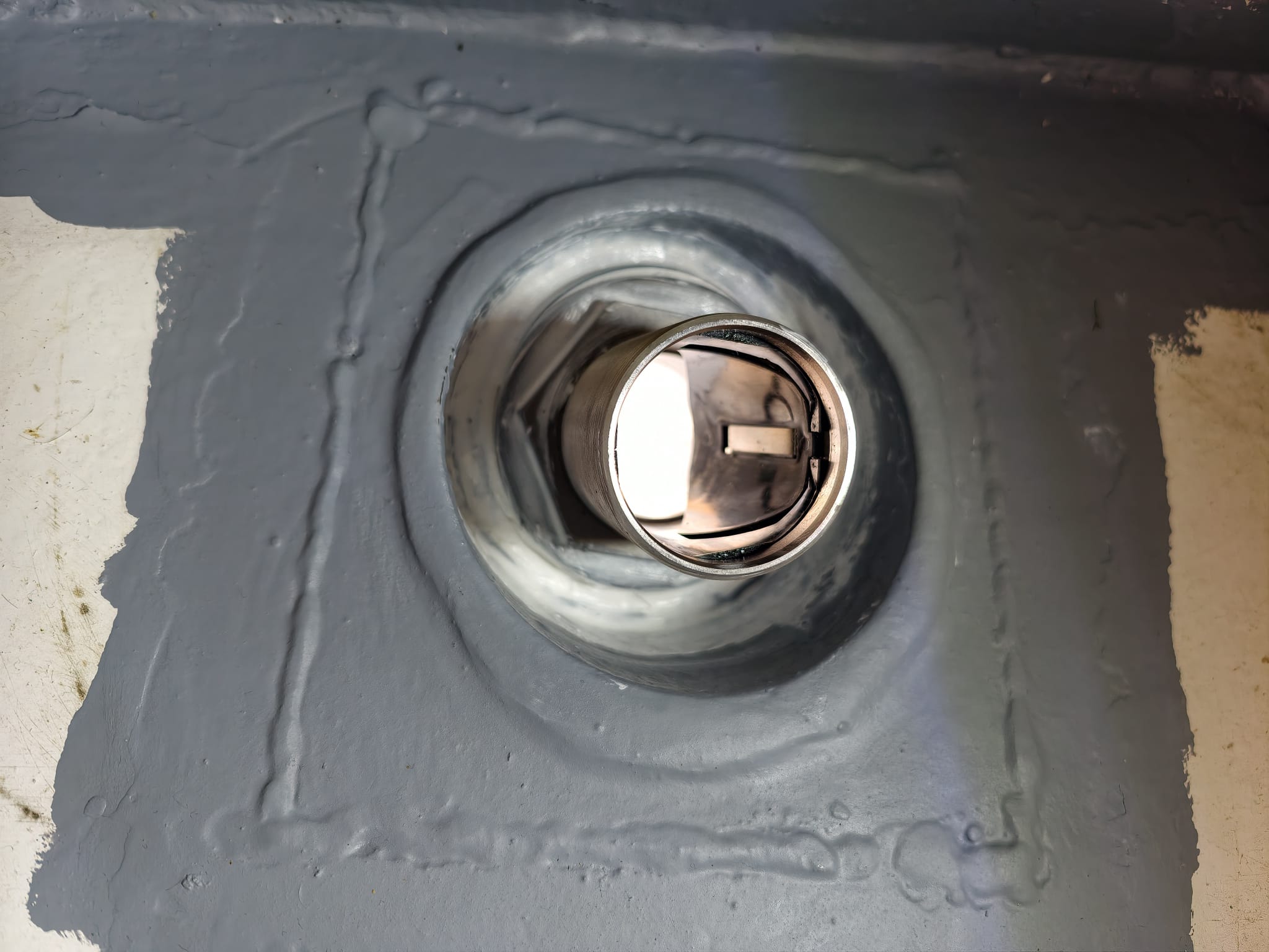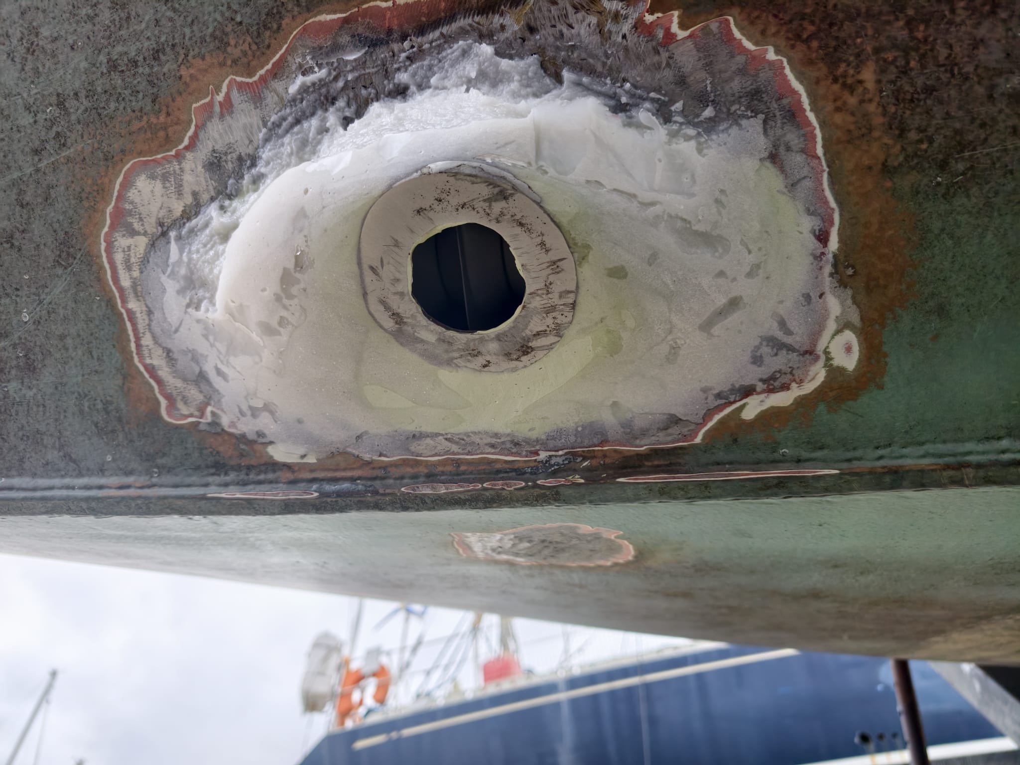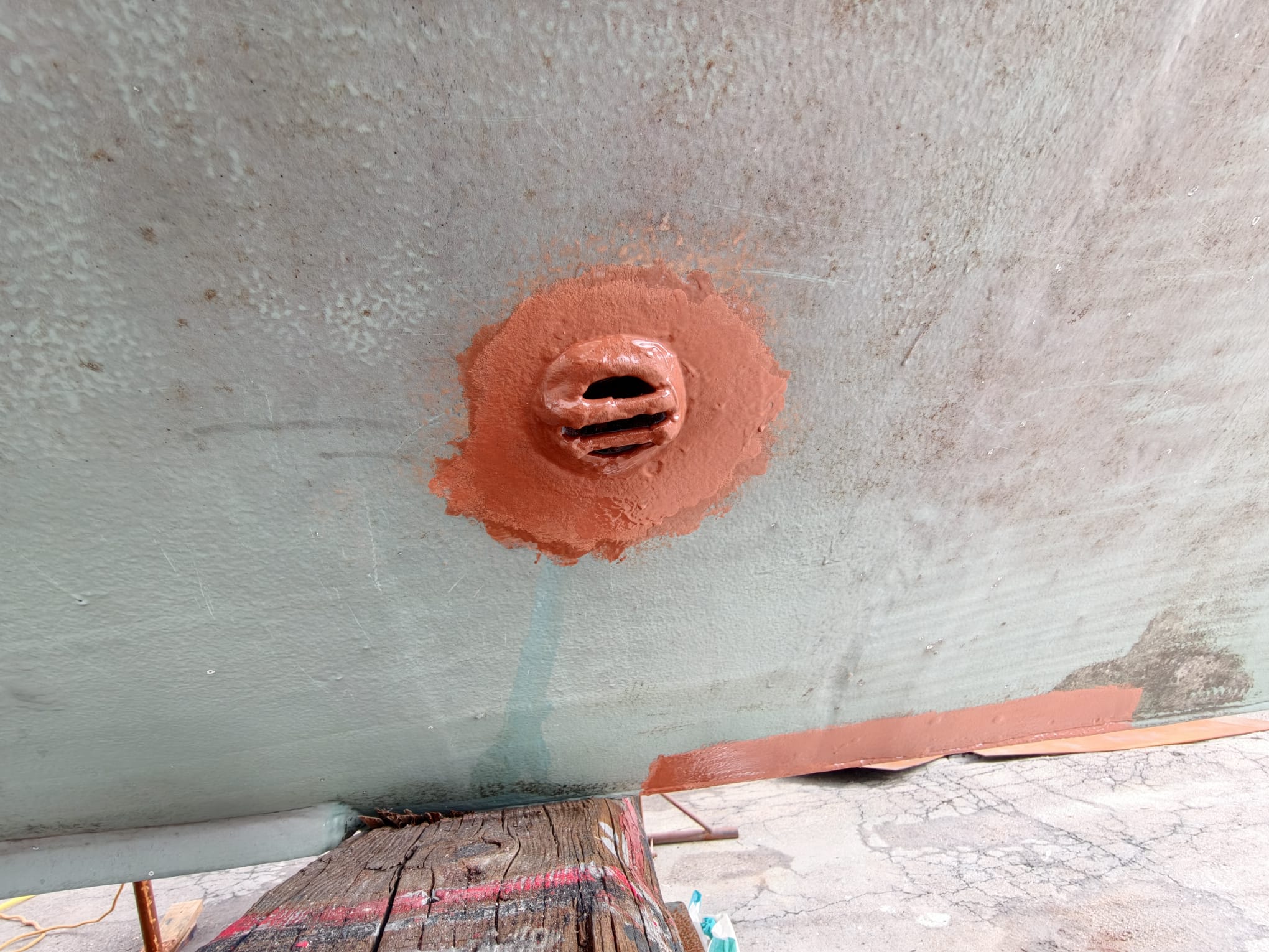 The primer has cured so far that we can mount the transducer housing. Wim gave it a sand-blast to have a nice adhesive surface and 2 coats of Interprotect primer. Not needed to protect the stainless steel but needed for the adhesion of the CopperCoat. We mount with Sikaflex 291i.