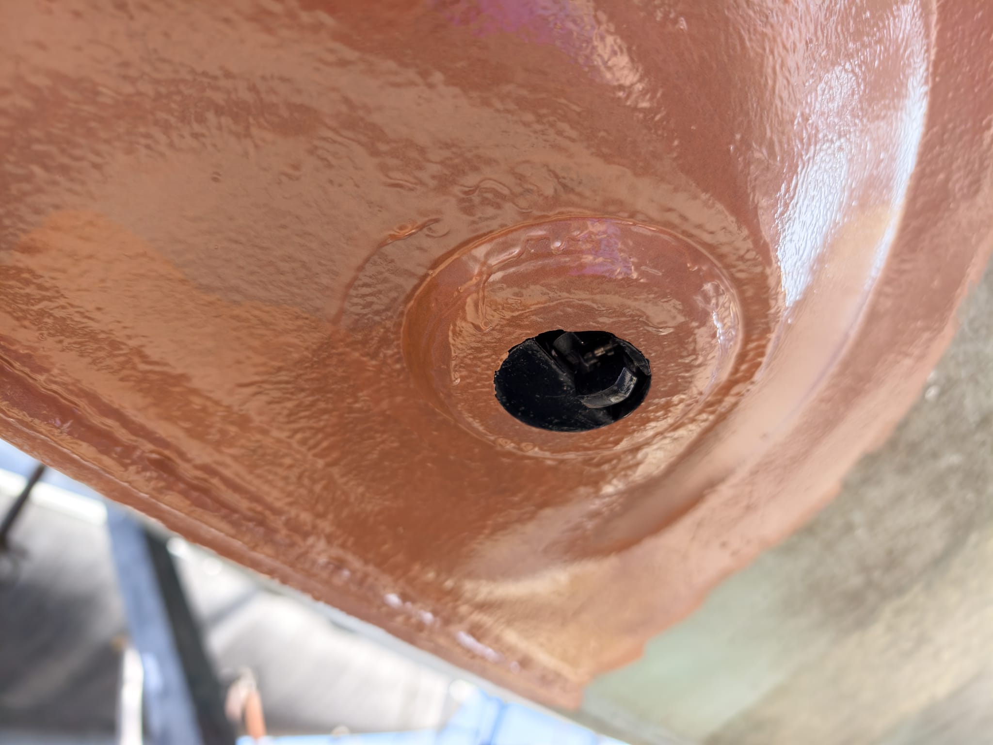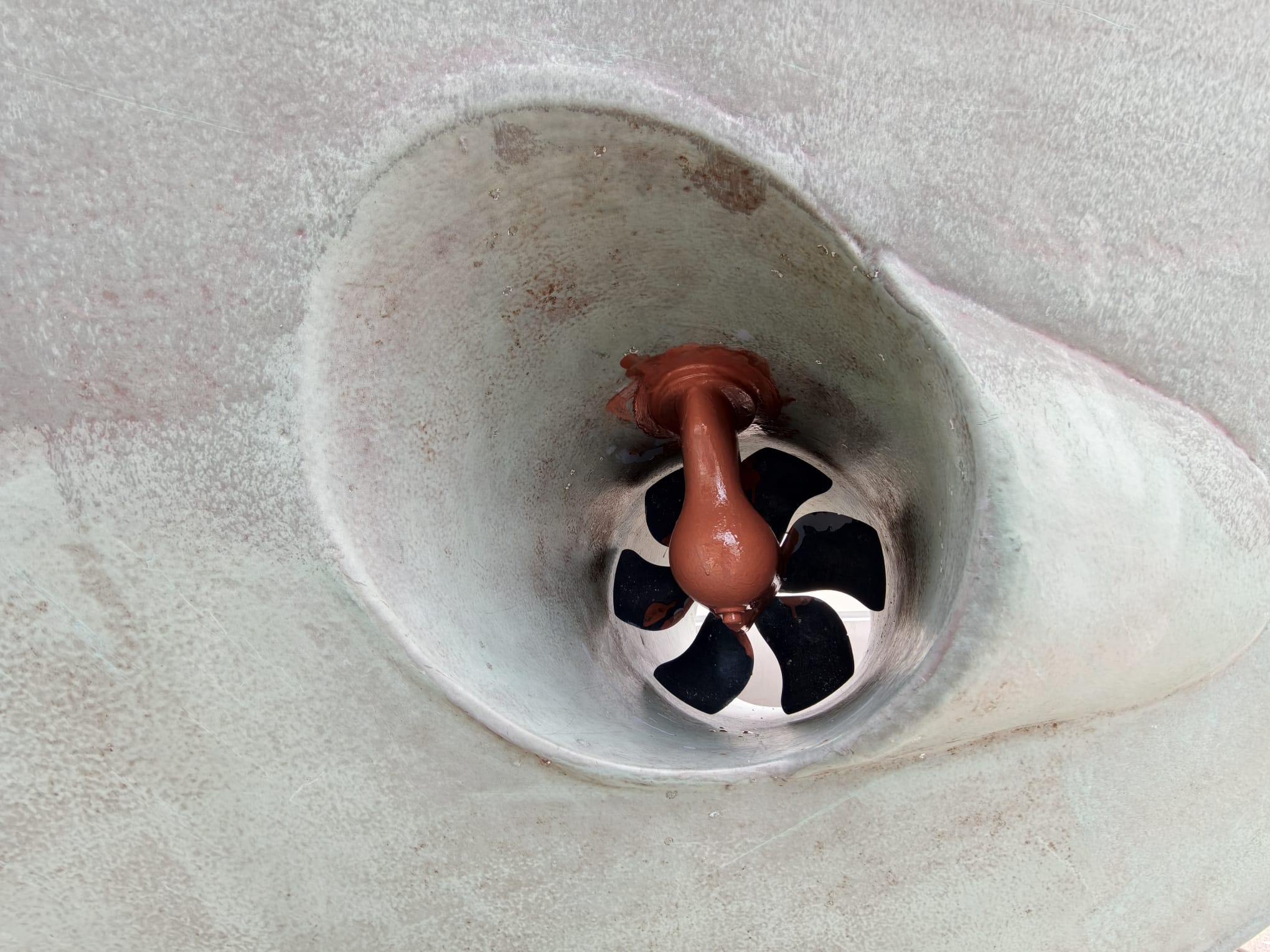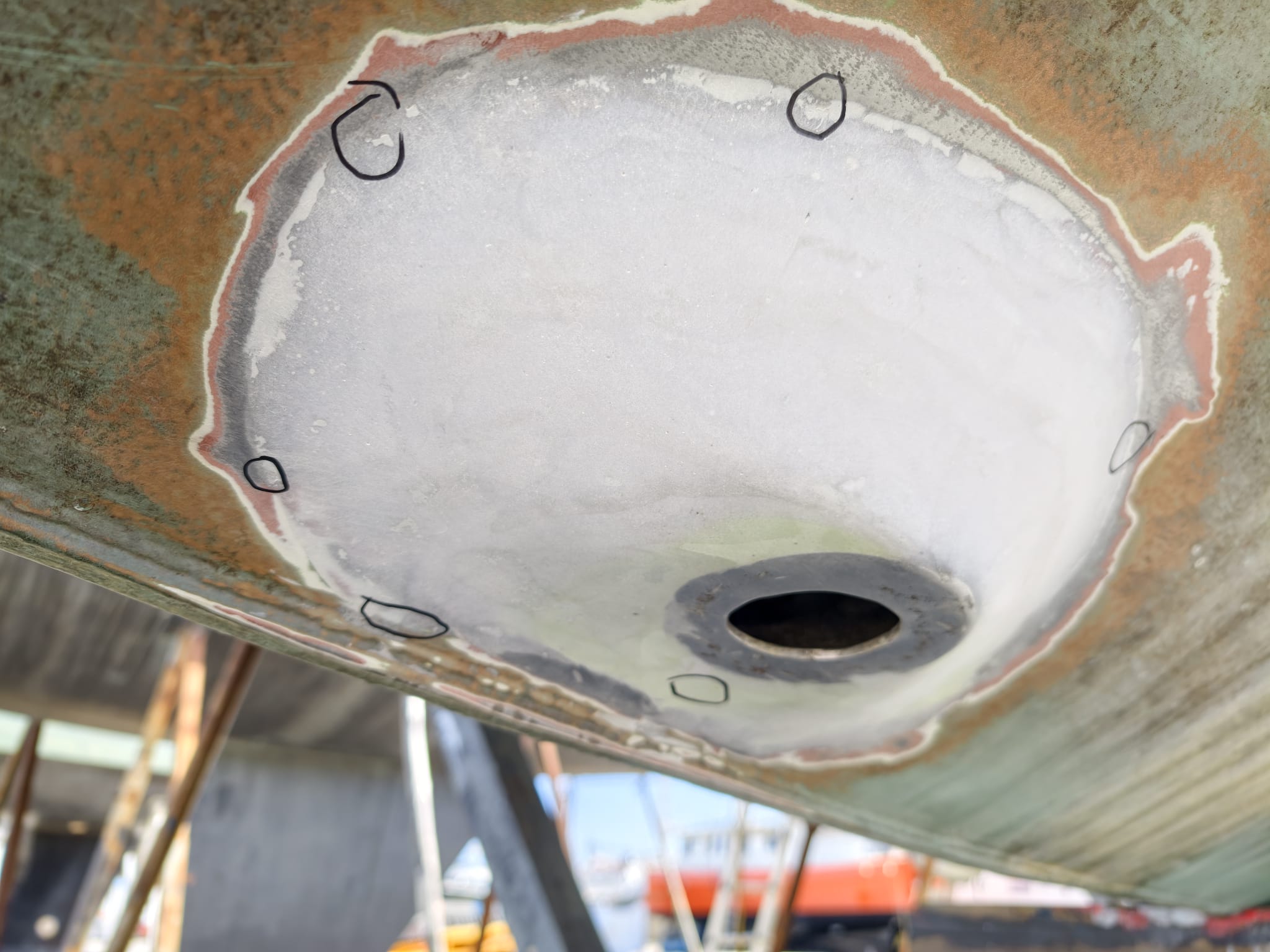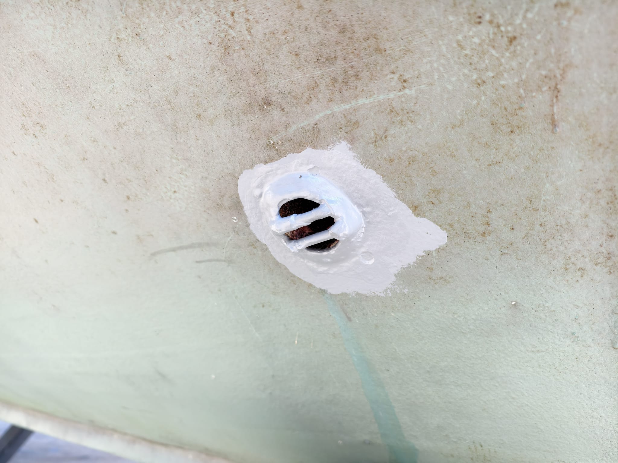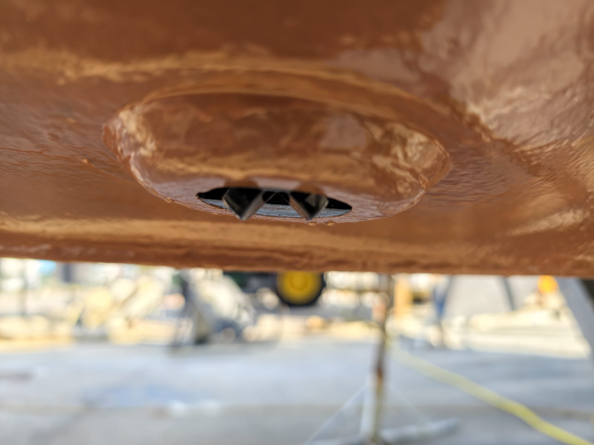 The primer has cured so far that we can mount the transducer housing. Wim gave it a sand-blast to have a nice adhesive surface and 2 coats of Interprotect primer. Not needed to protect the stainless steel but needed for the adhesion of the CopperCoat. We mount with Sikaflex 291i.