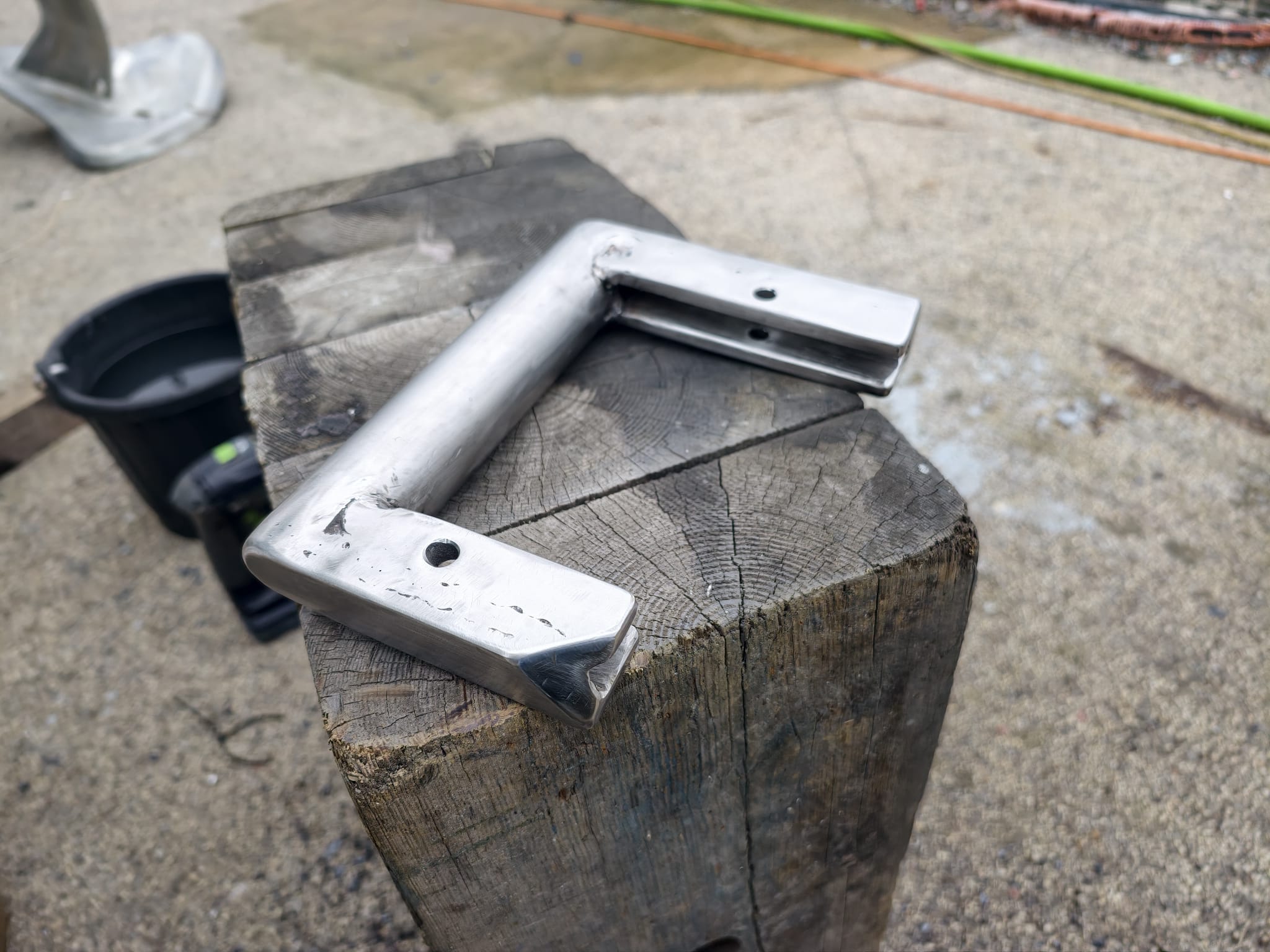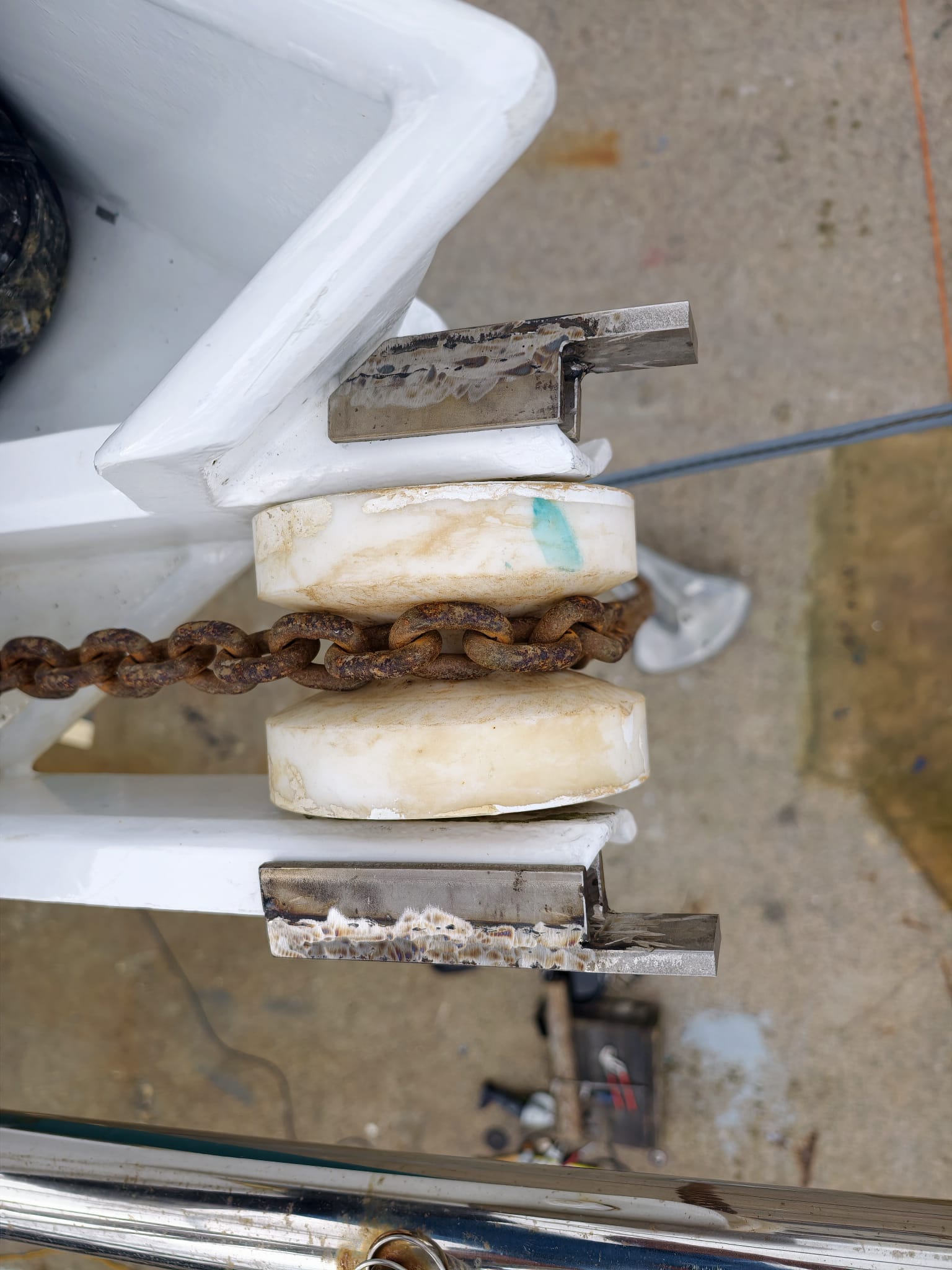 The U-shaped side parts welded. They shift over our anchor chain roller foundation.
