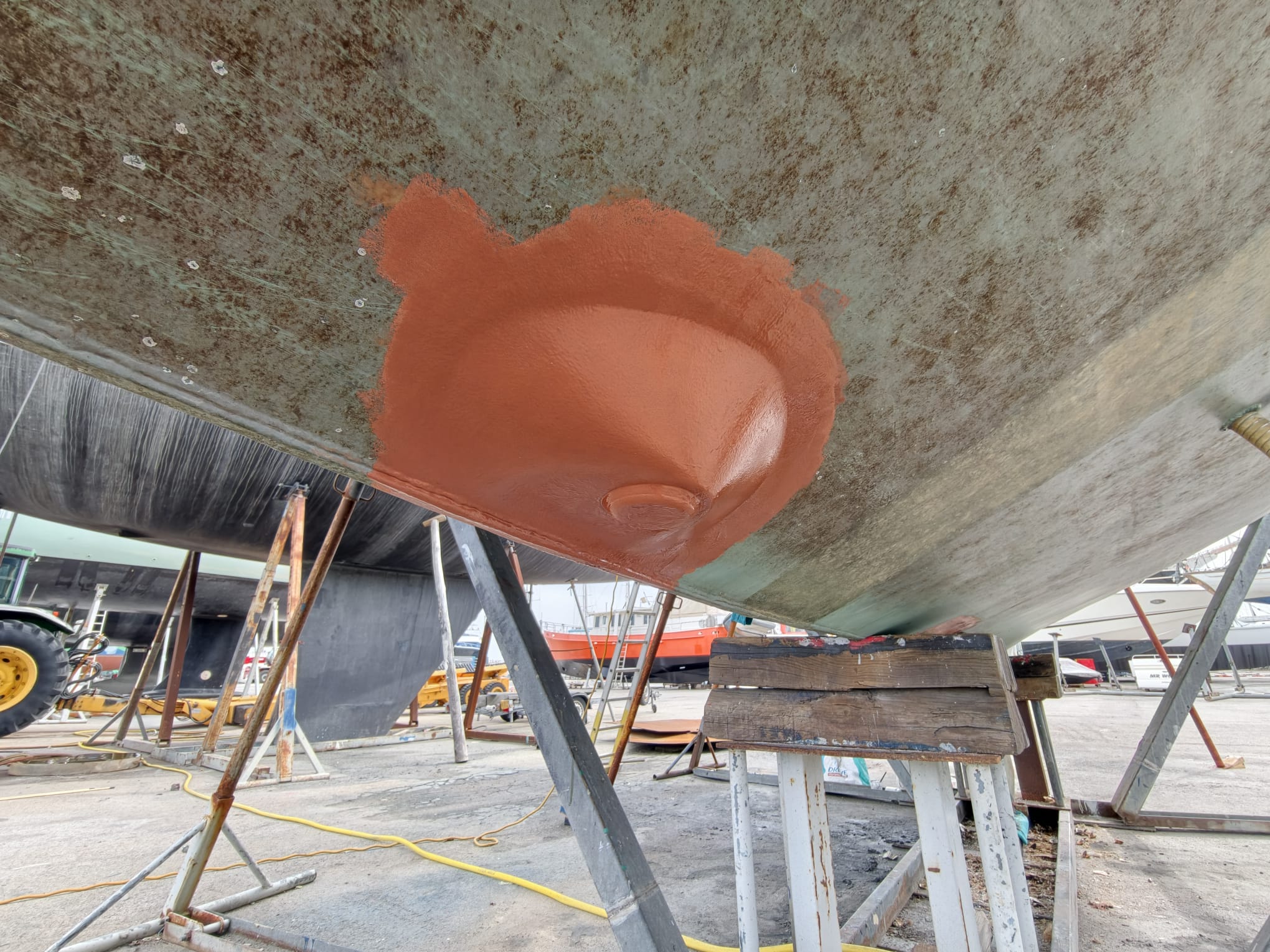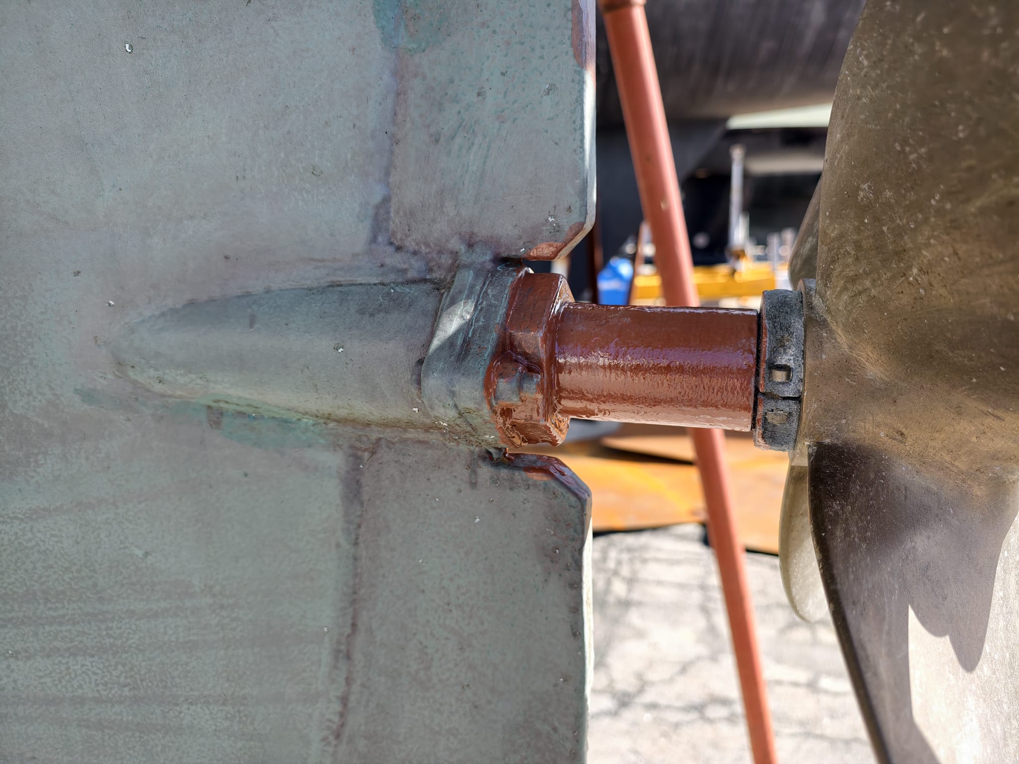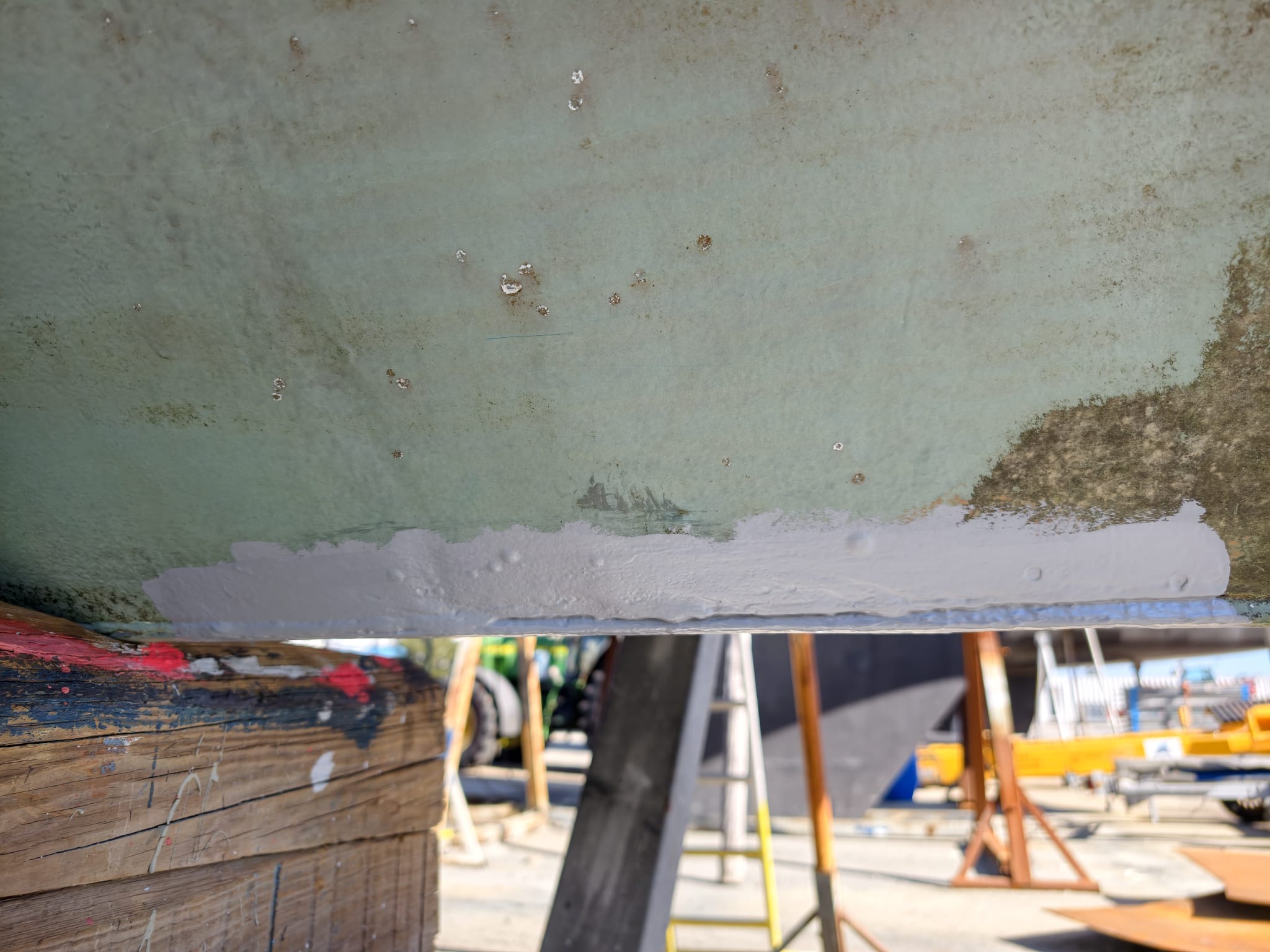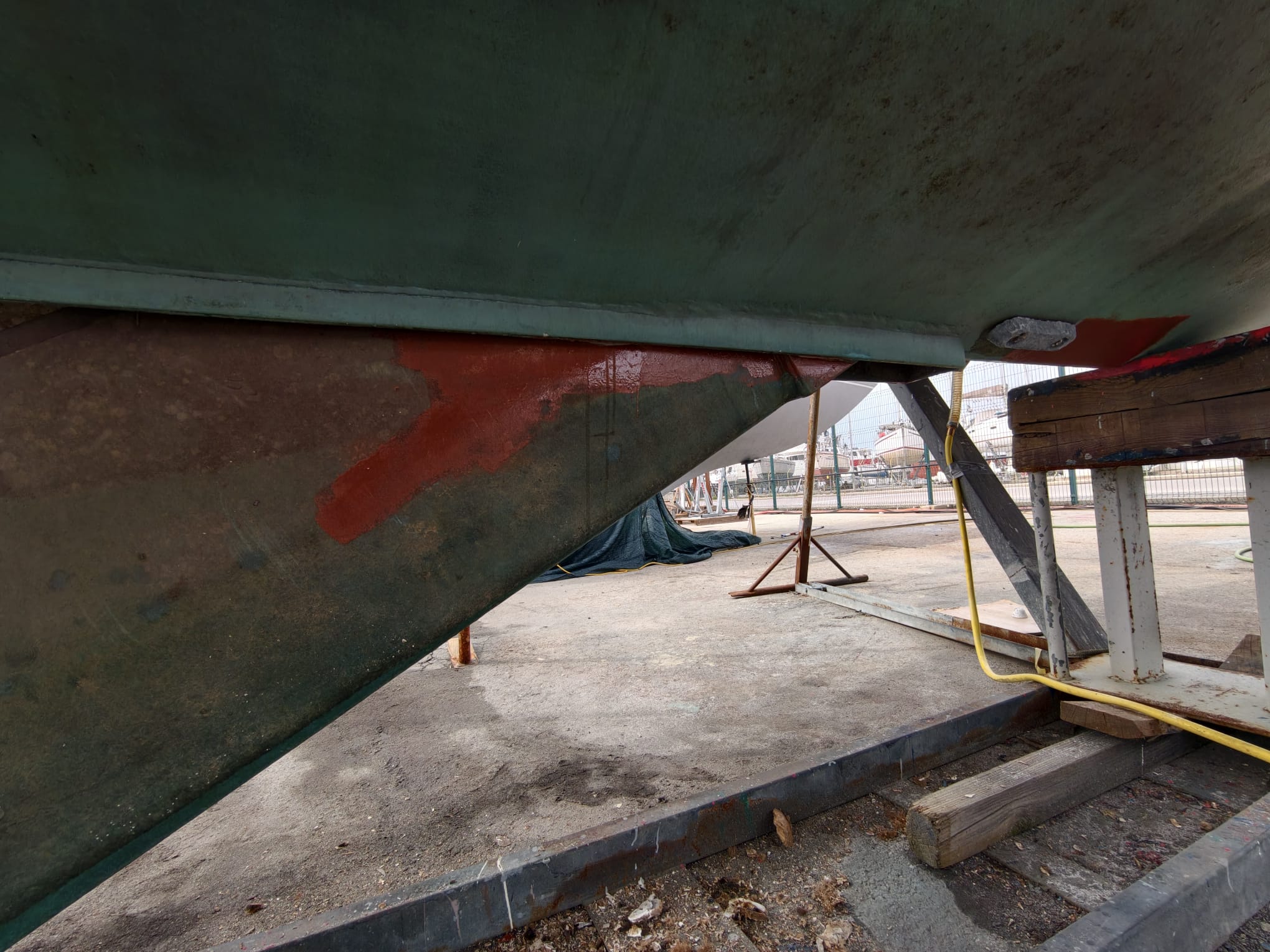 We’ve done so much under the water line, a lot has to be checked. While Wim inspects everything for leaks a little stressed, they turn off the travel lift’s engine. Wow, Wim thinks, I really have time to check and re-check everything! 🫡 Relaxed. Great!