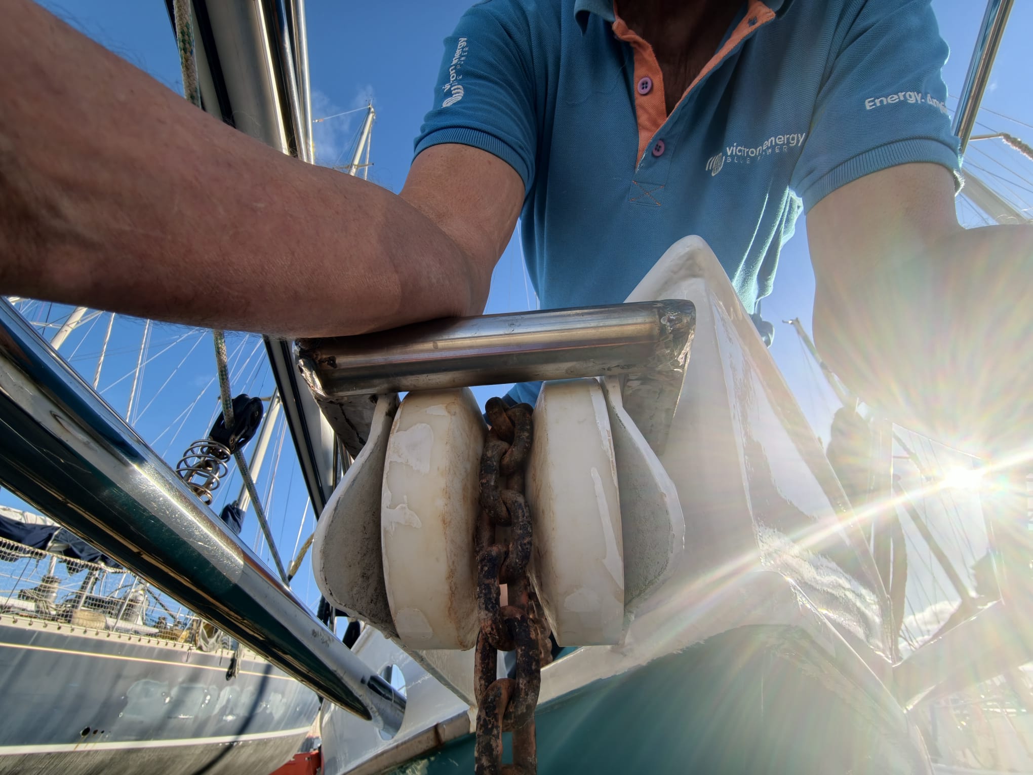 But the end piece of the chain is very rusty. This is the part which is always in the water on the bottom of the chain locker. Wim cuts this bad piece off and re-attaches the shackle and the rope.