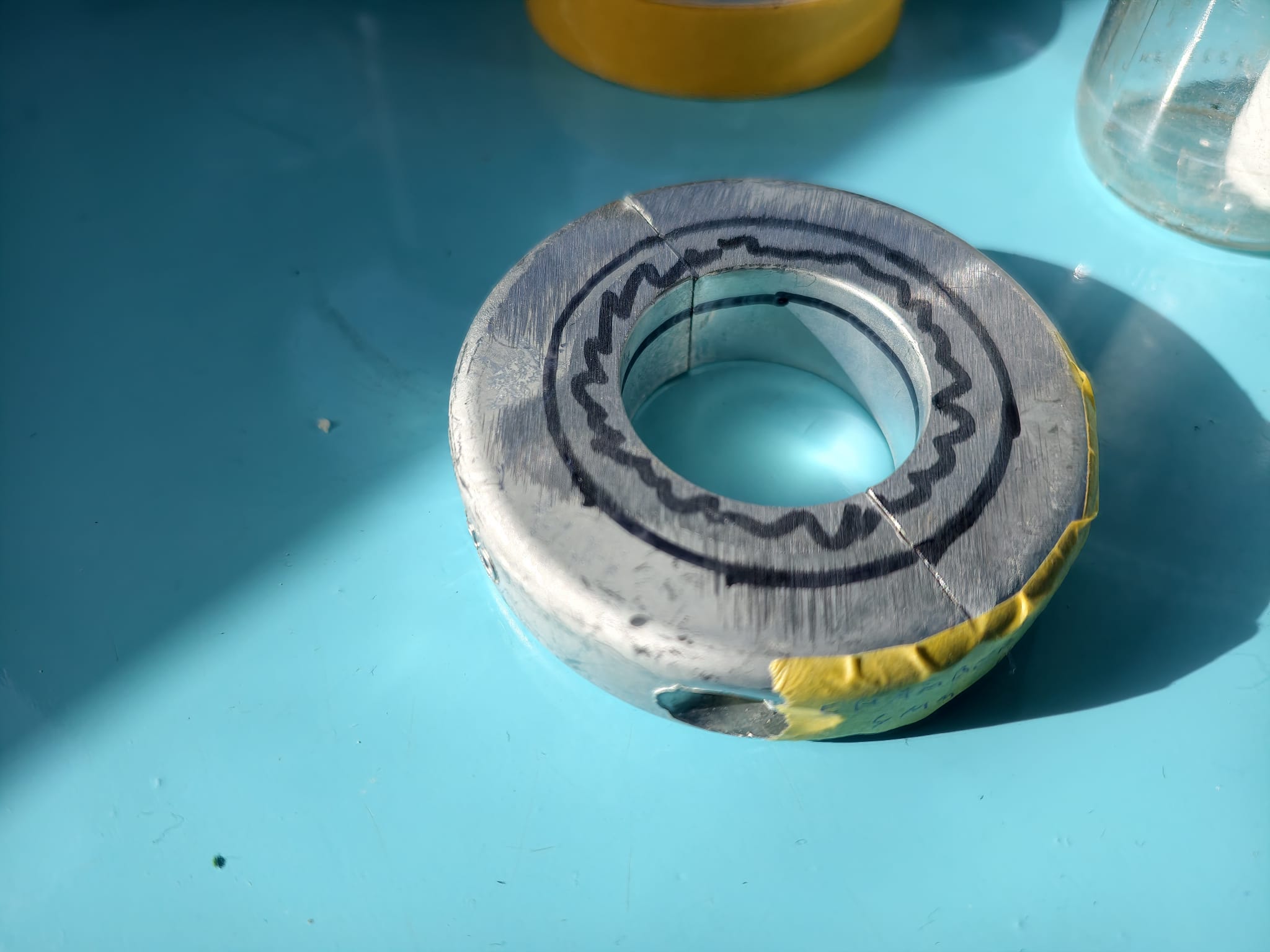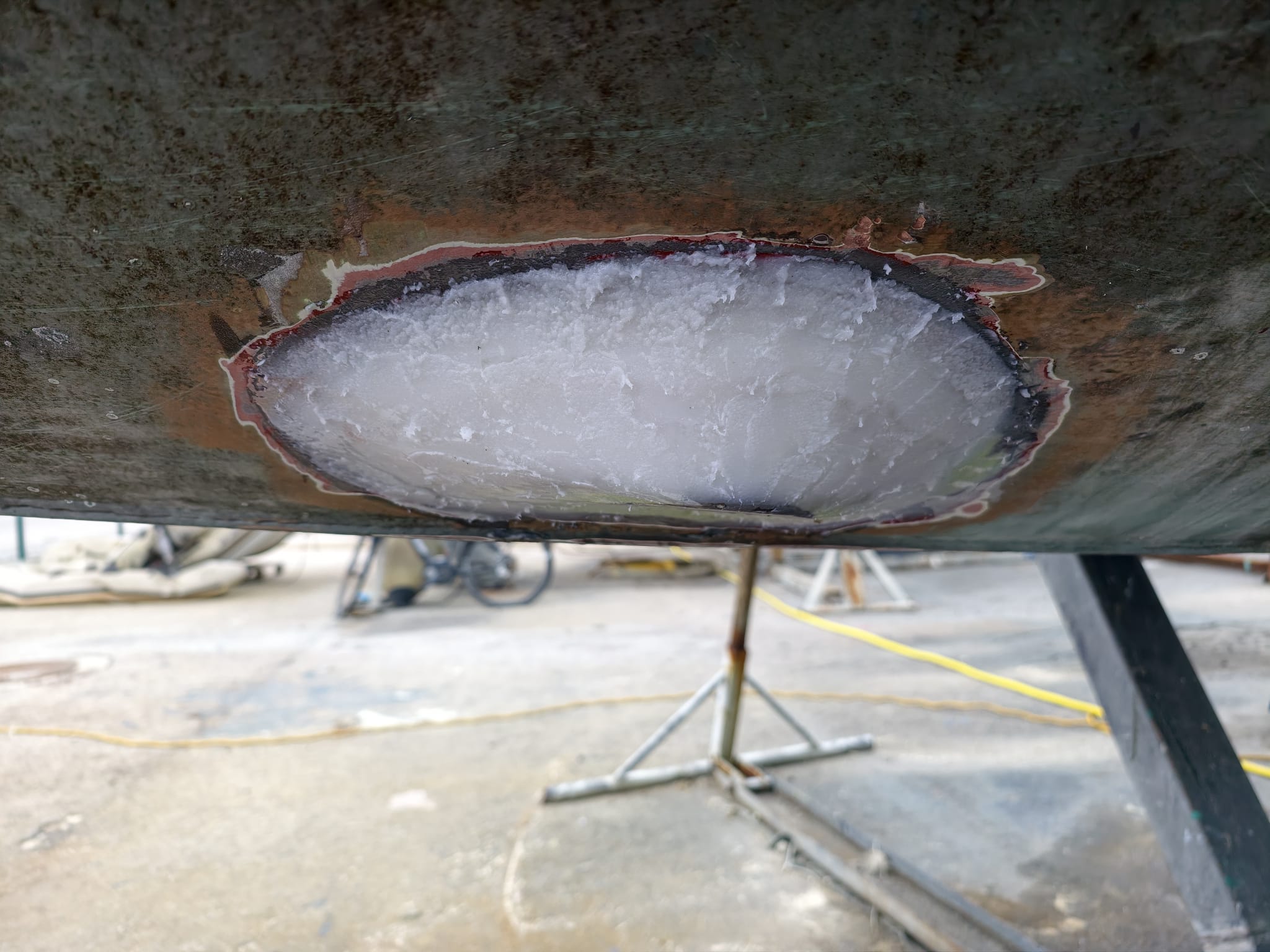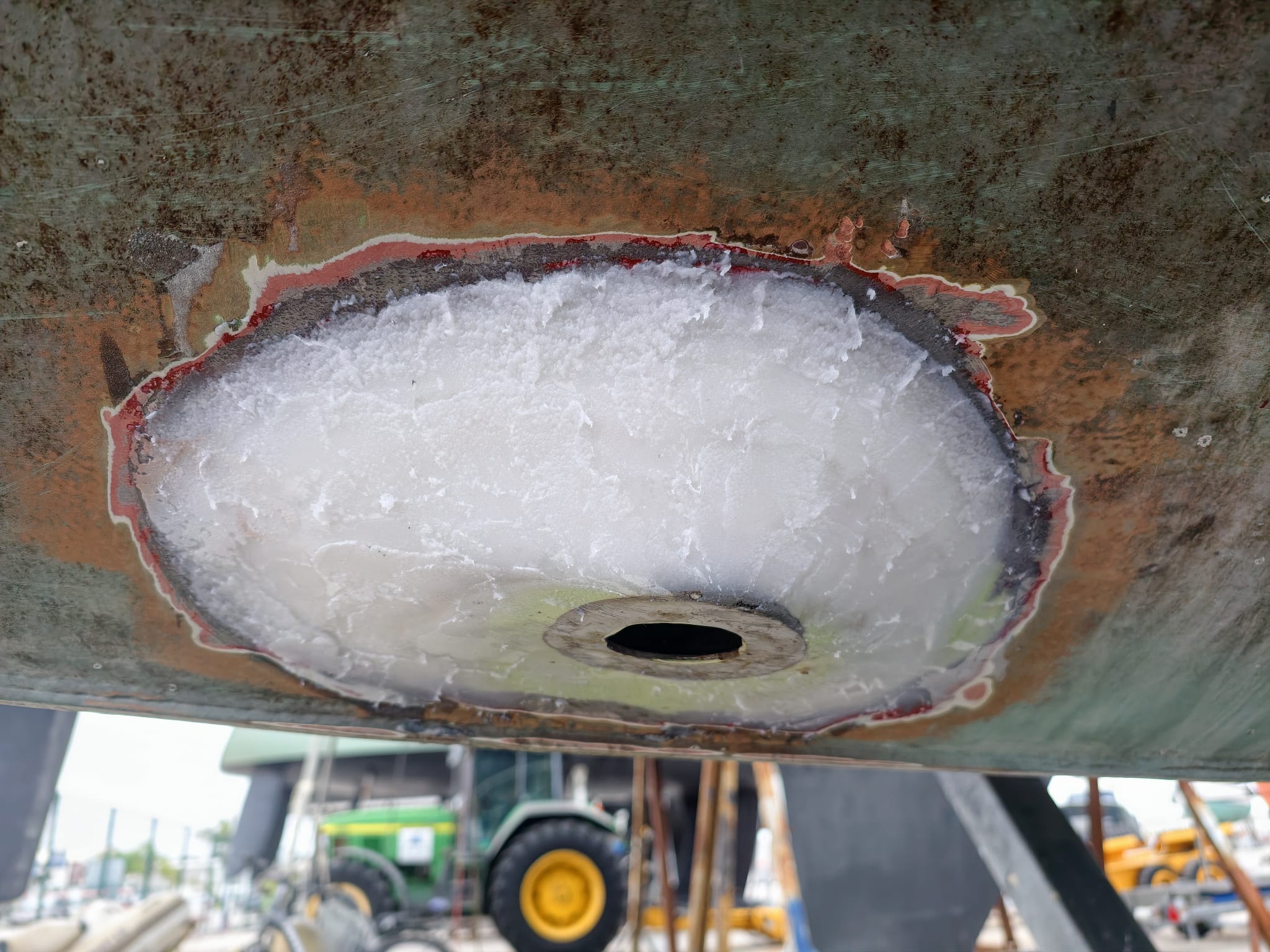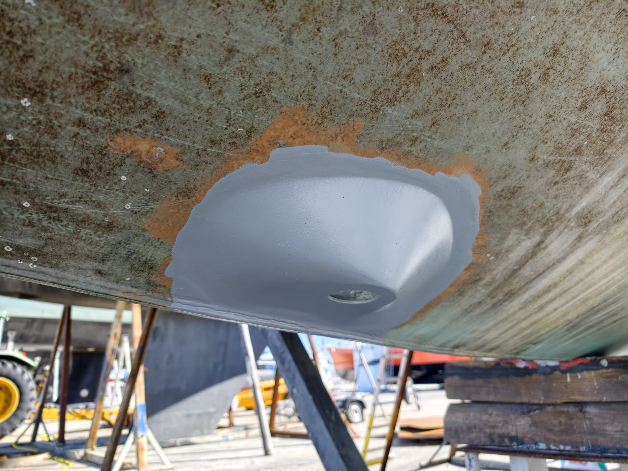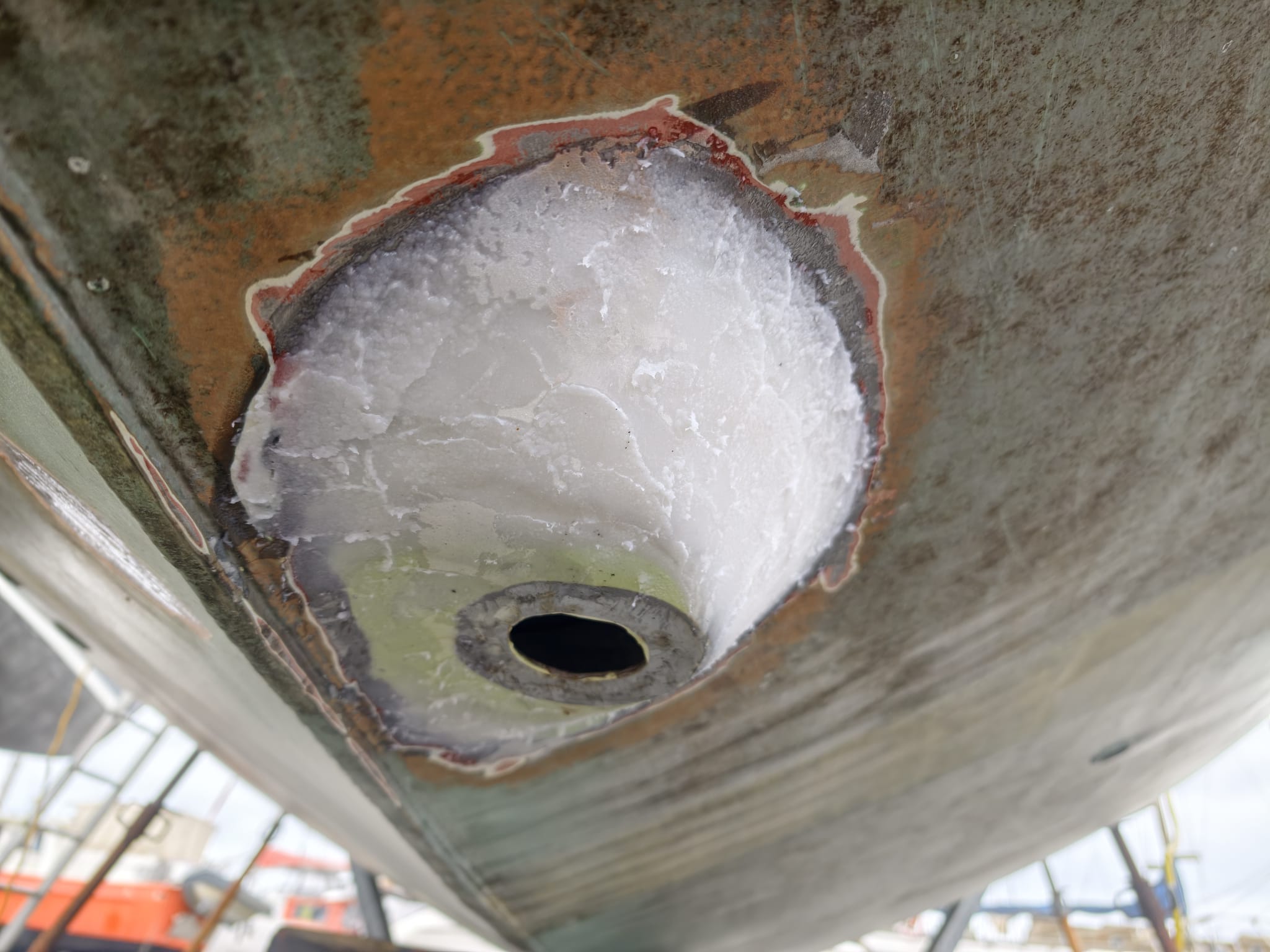 Still here in the boatyard, we continue to work on our projects. Bit by bit, the filler takes shape around the transducer…