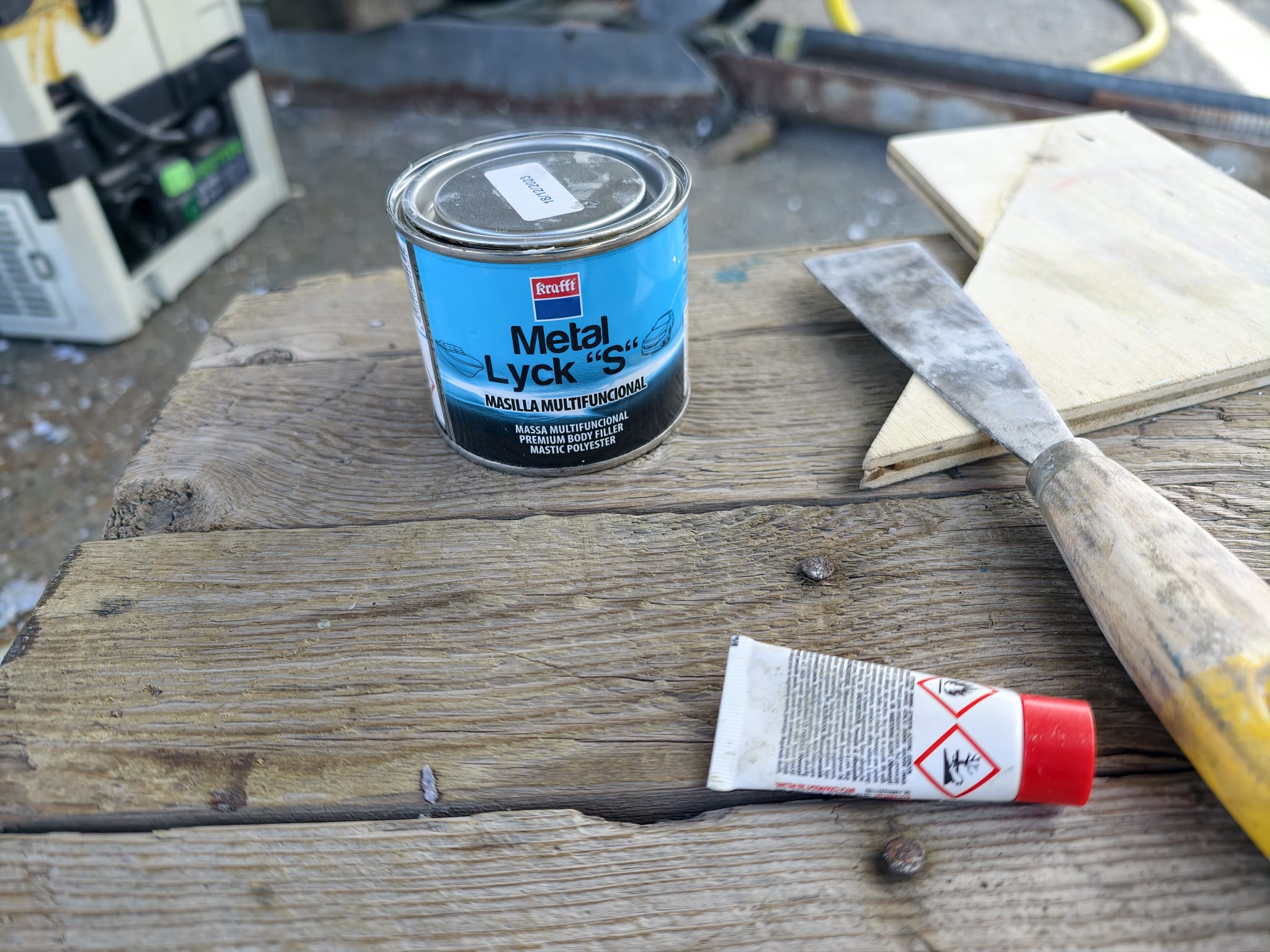 After sanding, there are just a few spots that still need touching up. The epoxy filler is too course for that so we use a little bit of polyester filler.