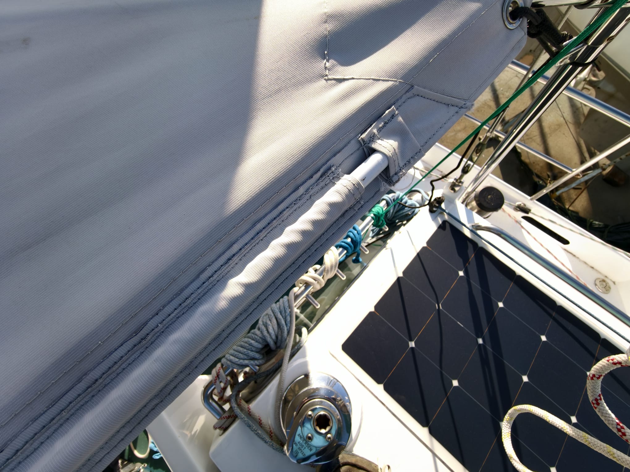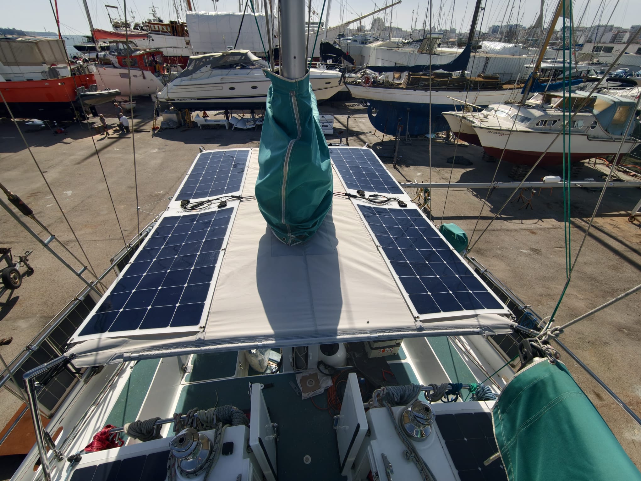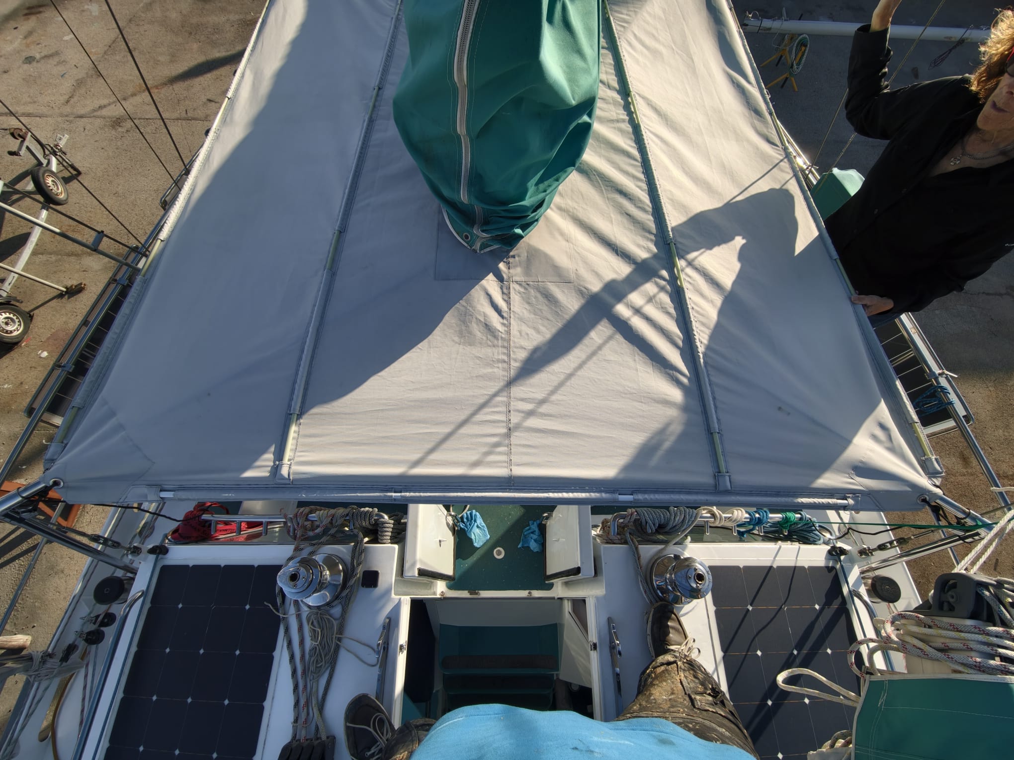 Wim puts the solar panels on the cockpit sun shade back in place. Everything fits nice. This is a nice improvement. Much stronger and tidier. The sun shade survived already 40-50 knots of wind, let’s see if we can break this record now!