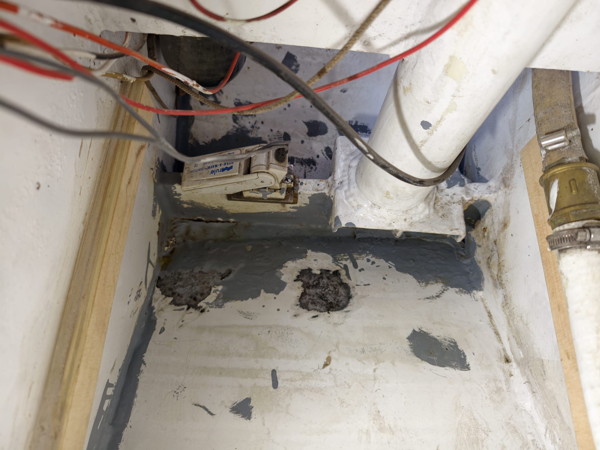 Now that the engine exhaust water lock is back in place, we can restore the storage area under the floor of the lazarette and put everything back. The cockpit looks a lot different without all that stuff!