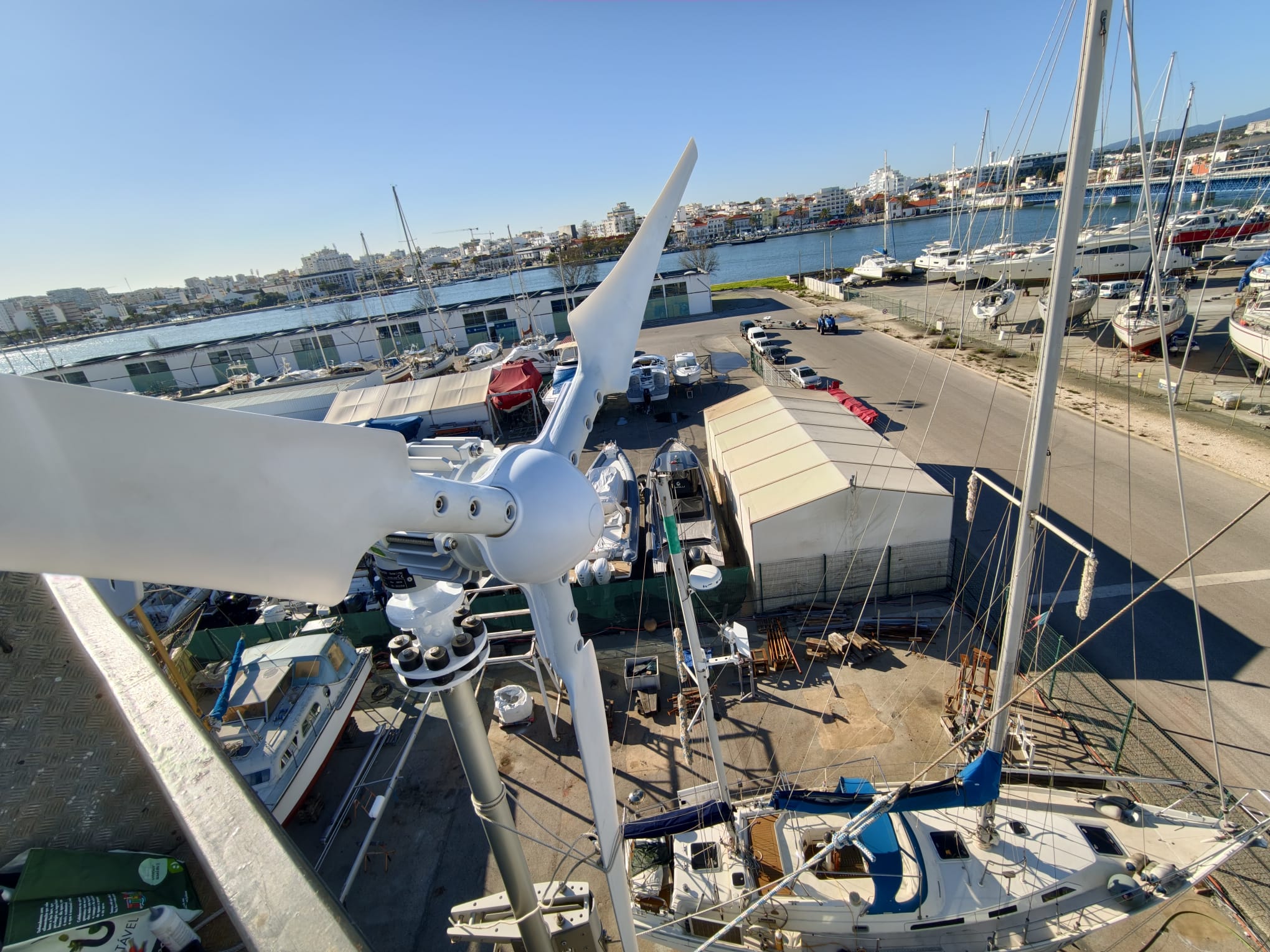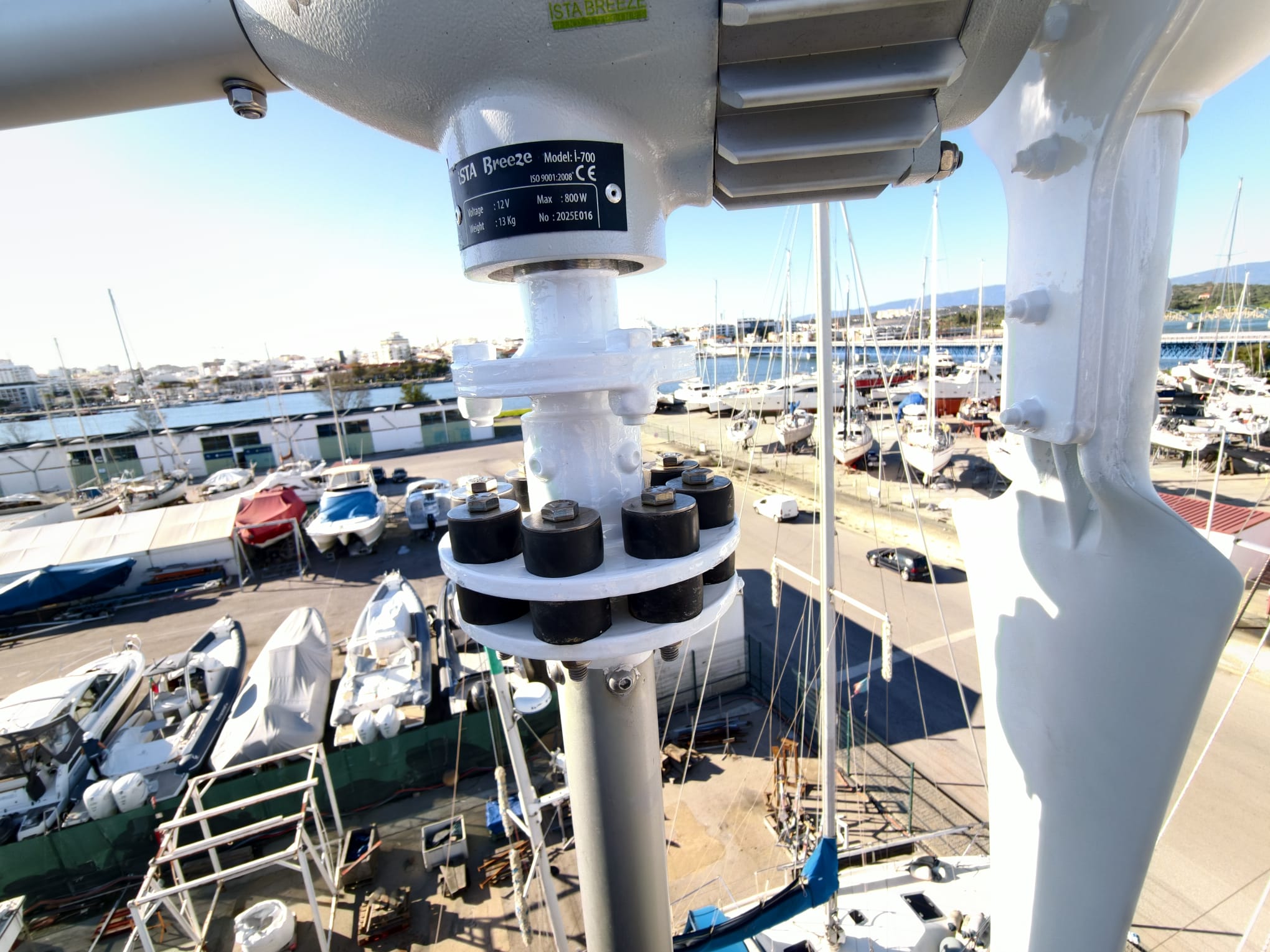 Let’s try it! Release the brake. There’s only 5-7 knots of wind but it spins beautifully! And it’s extremely silent. The noise you hear in the video is background noise from all the machines on the boatyard.