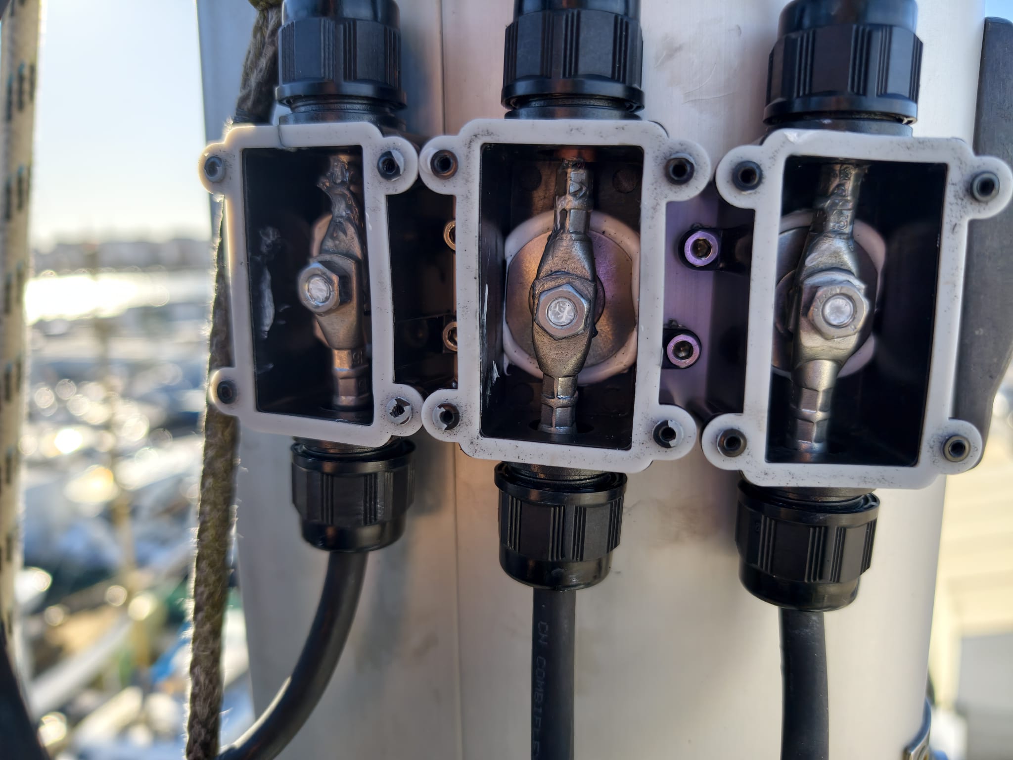 Wim has to drill and tap the junction boxes to mast and crimp cable lugs on to the cables.
