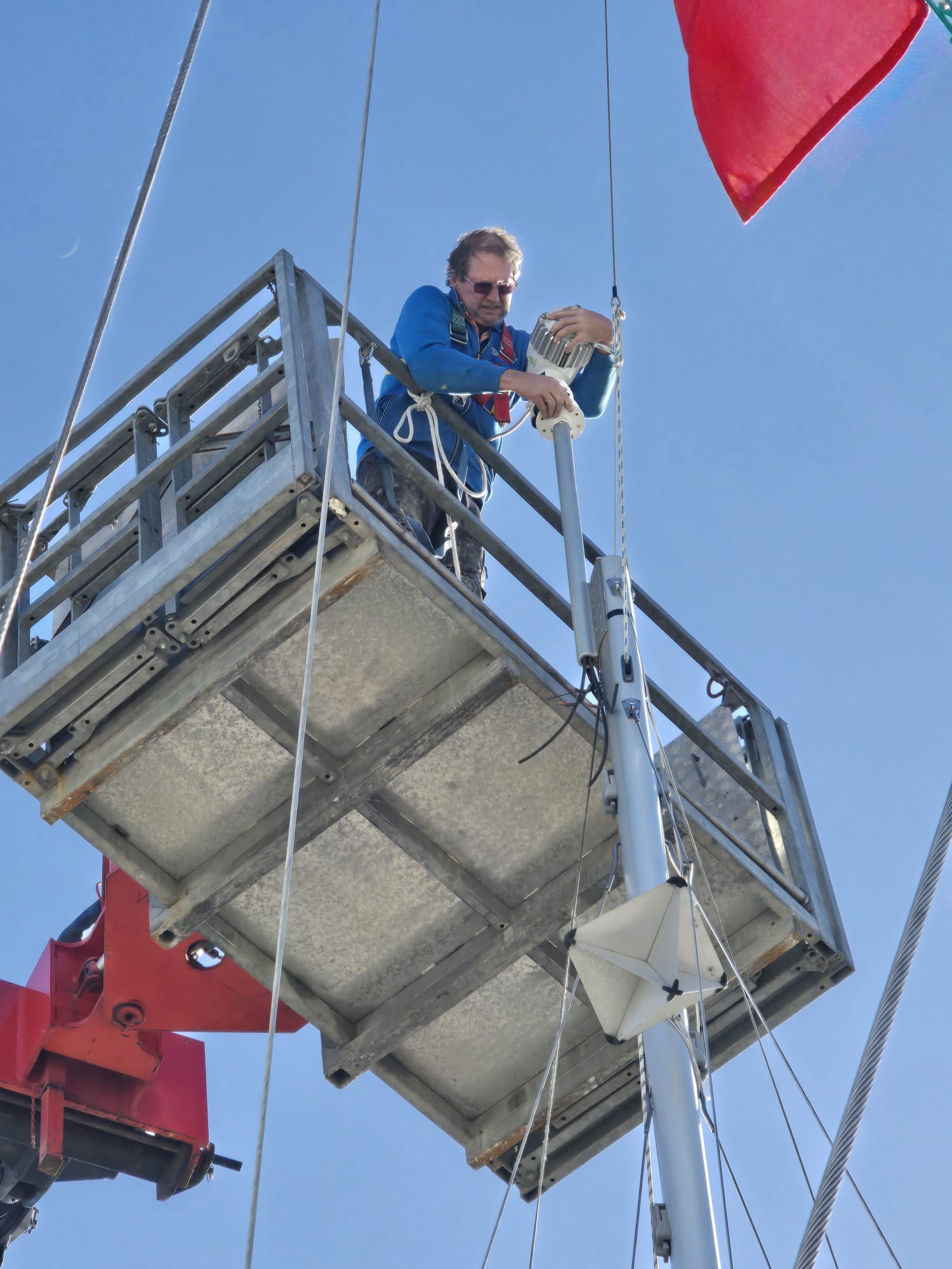 We’ve booked the Manitou working platform for 1530h. It’s a beautiful day with only a very light breeze so, a good opportunity to put the new wind generator on the mast.