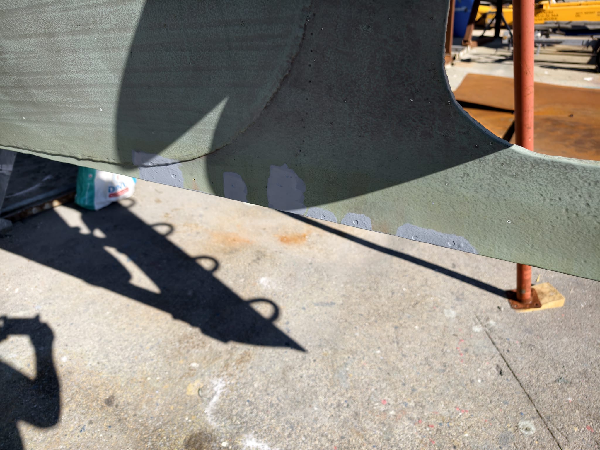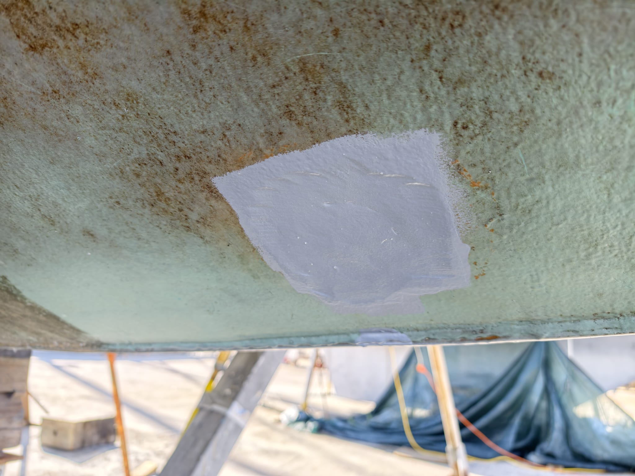 In the morning, we sand-blast all spots in the bilges. This one was done already and had 1 layer of primer but we found 2 more rusty spots…