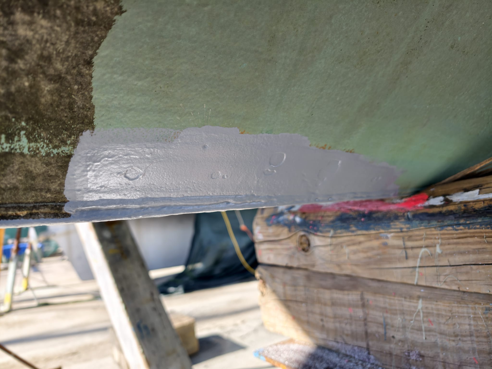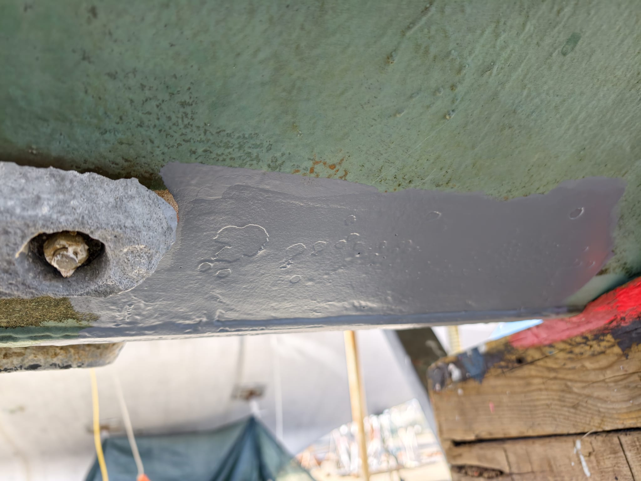 Wim paints a few spots on the hull which were damaged in the past and we had already painted with primer. Using a tiny bit of teal paint. No photo’s because the teal paint is so good, you can’t see where it’s painted!