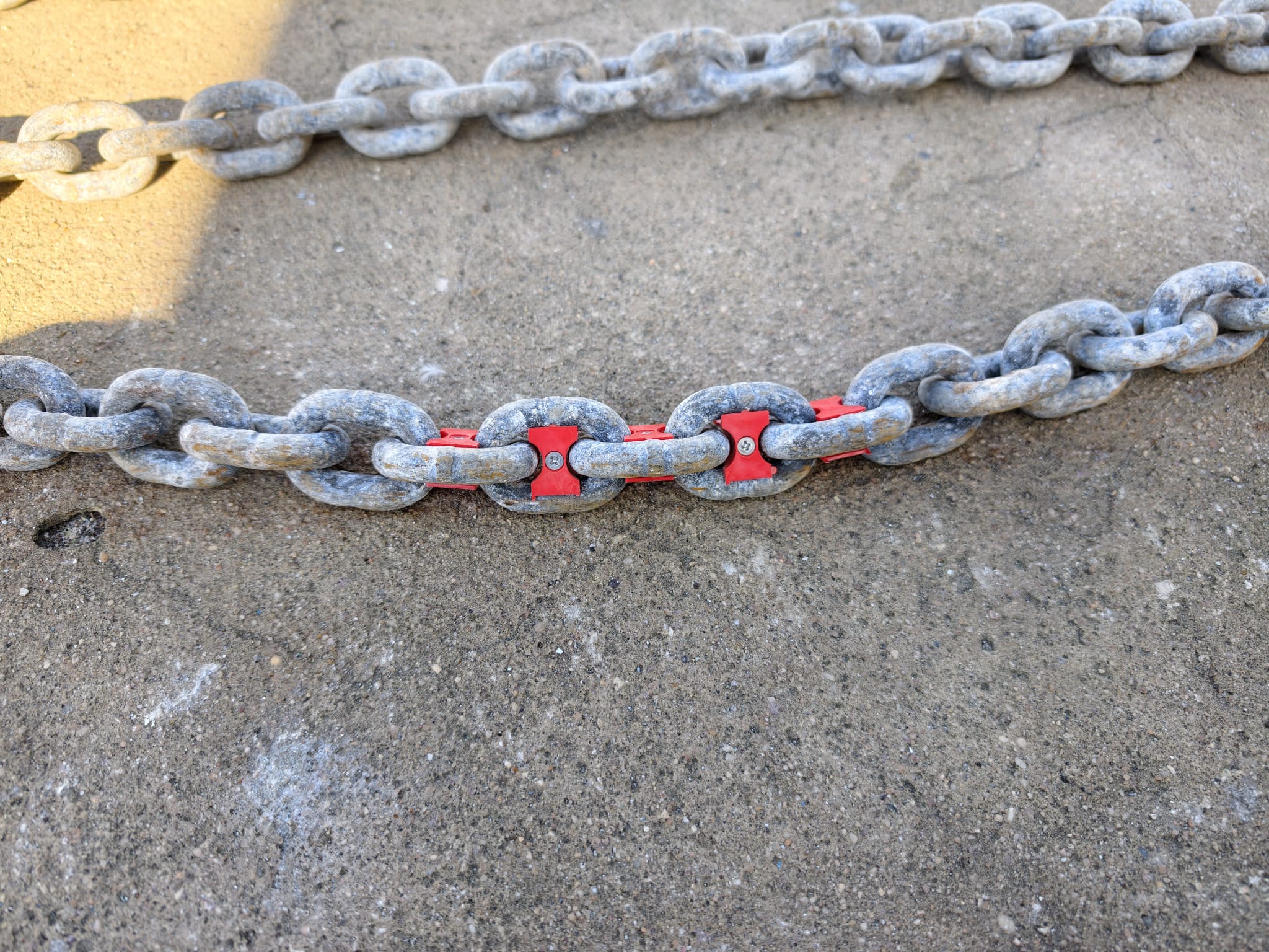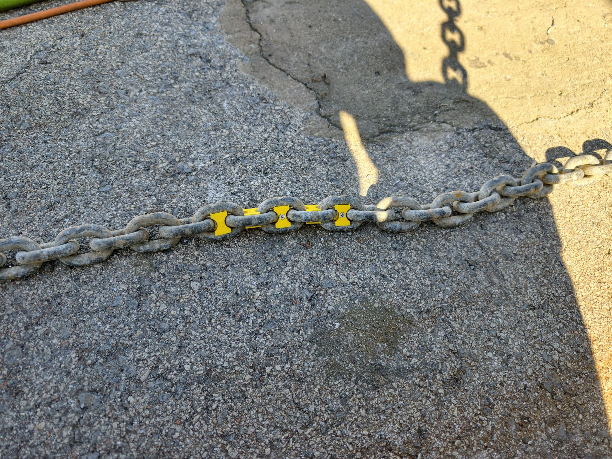 We buy chain markers at the Sopromar chandler and mark 10m (blue), 20m (green), 30m (yellow) and 50m (red). 4 red TyRaps mark the last 3m.