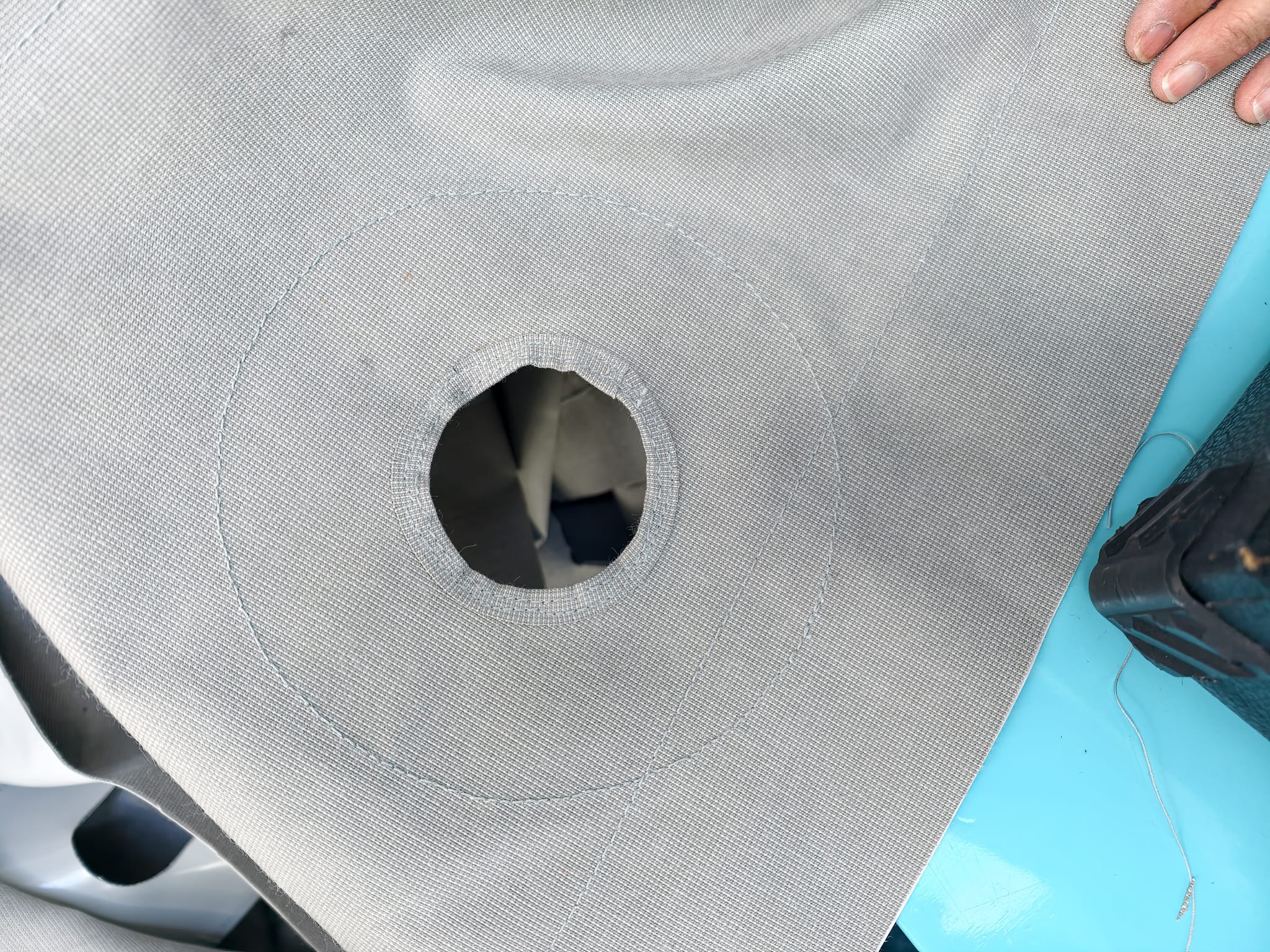 Sher continues working on the dinghy cover. Sewing the binding on the round holes is a tough job. The entire cover has to be pushed under the arm of the Sailrite to circle around the hole!