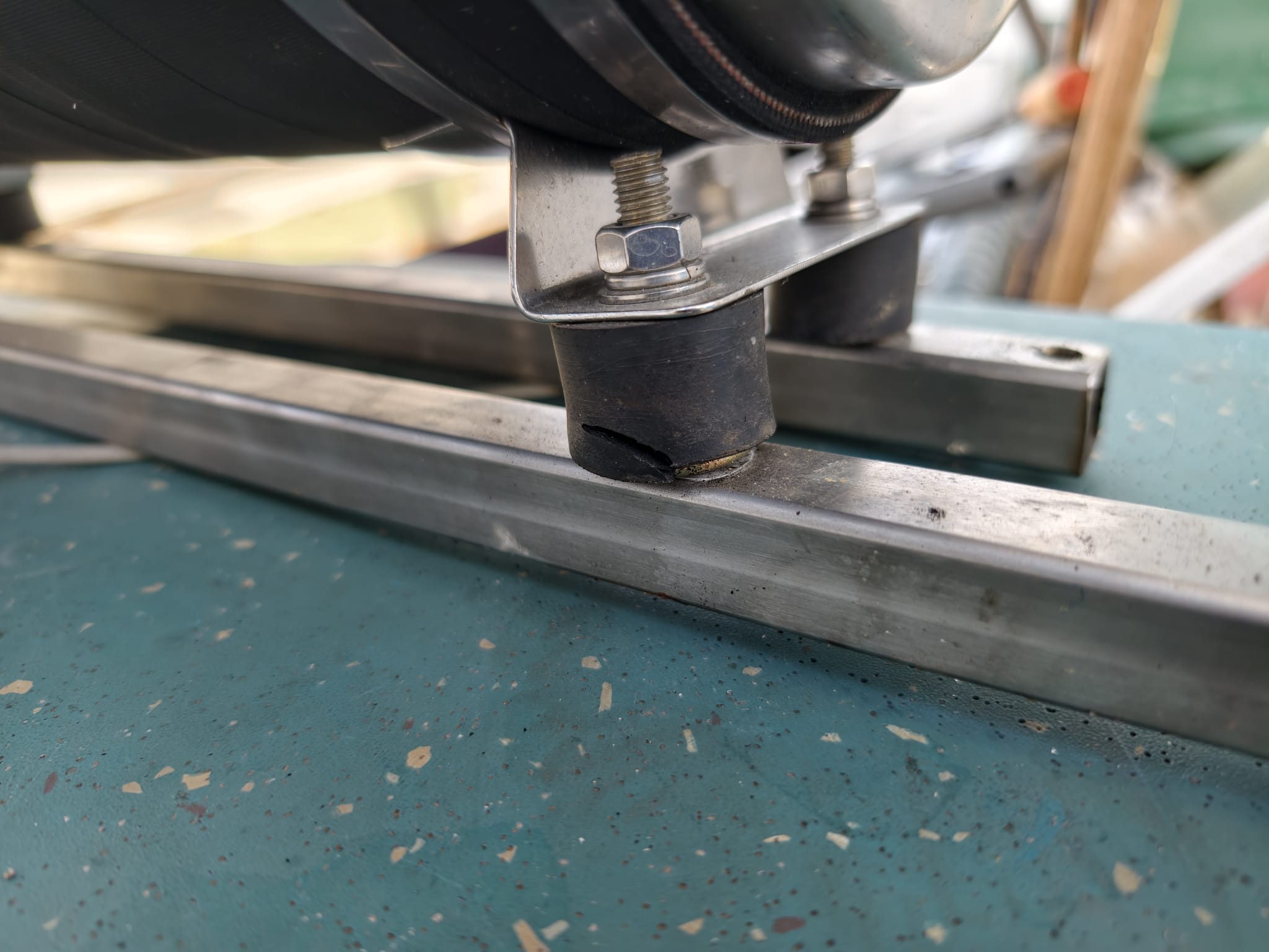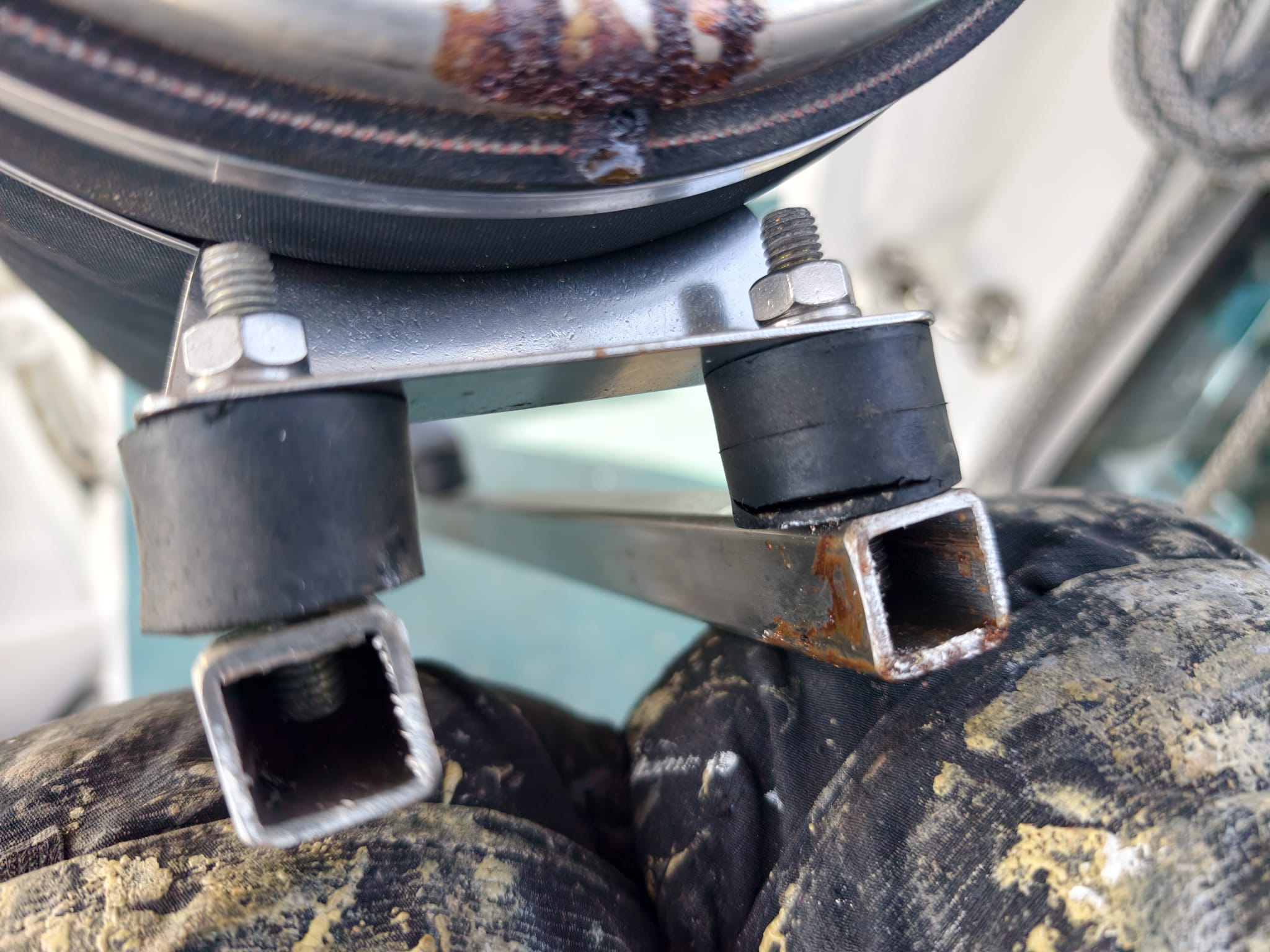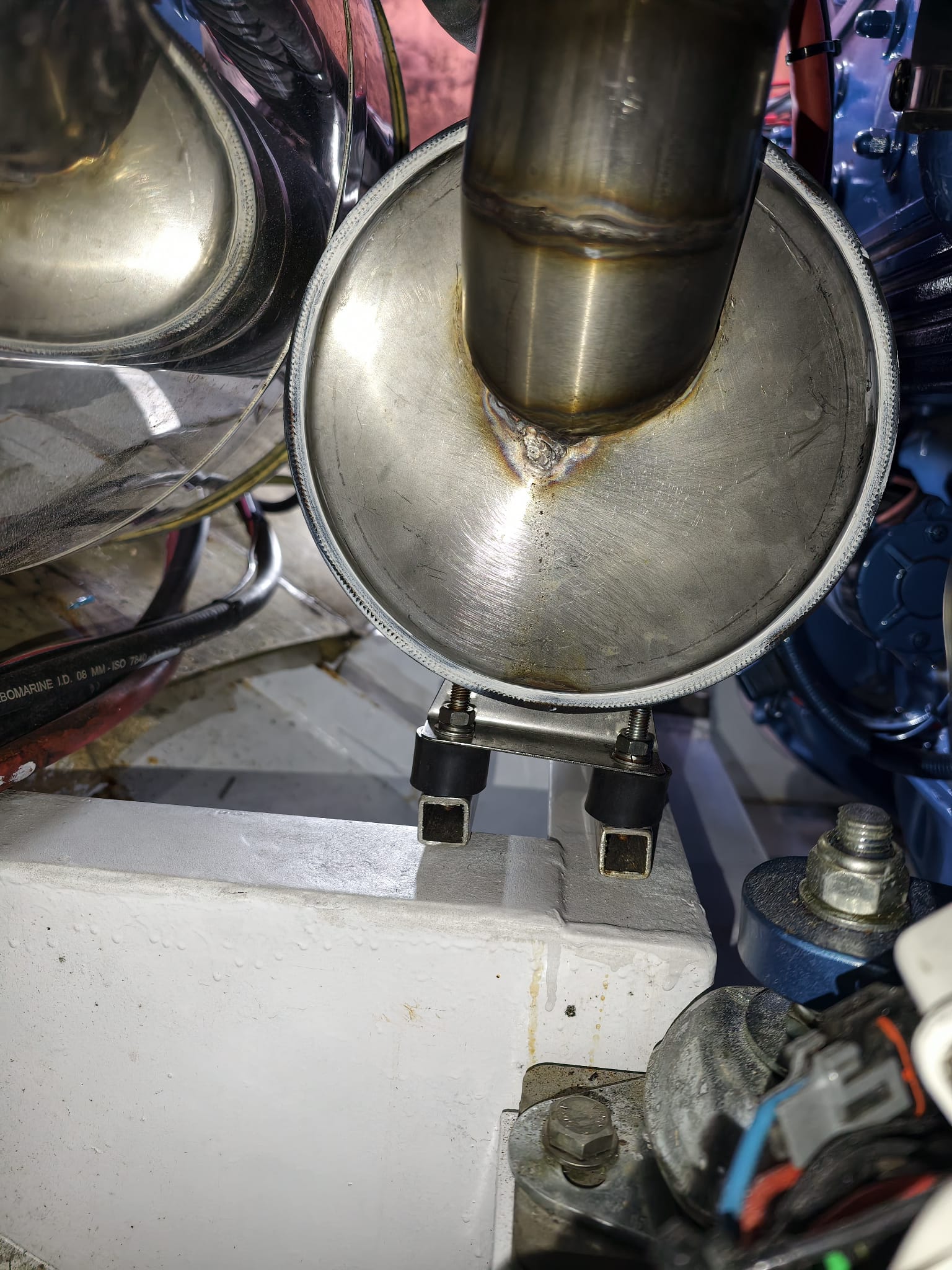 And assembles the repaired (welded) water lock, using Sikaflex sealant because there was some corrosion between the rubber tube and the stainless steel parts. And mount new silent blocks.