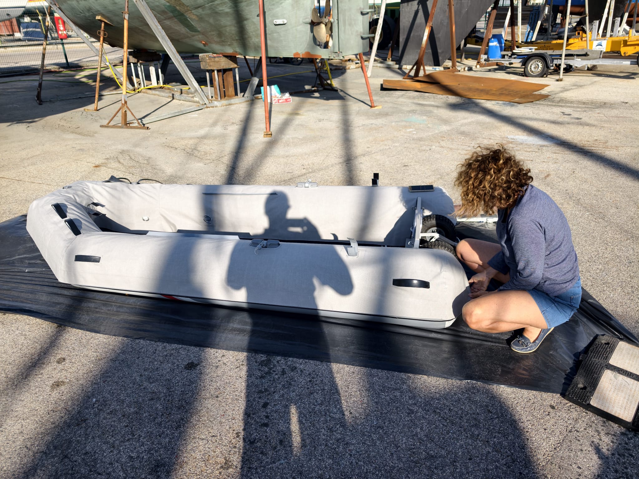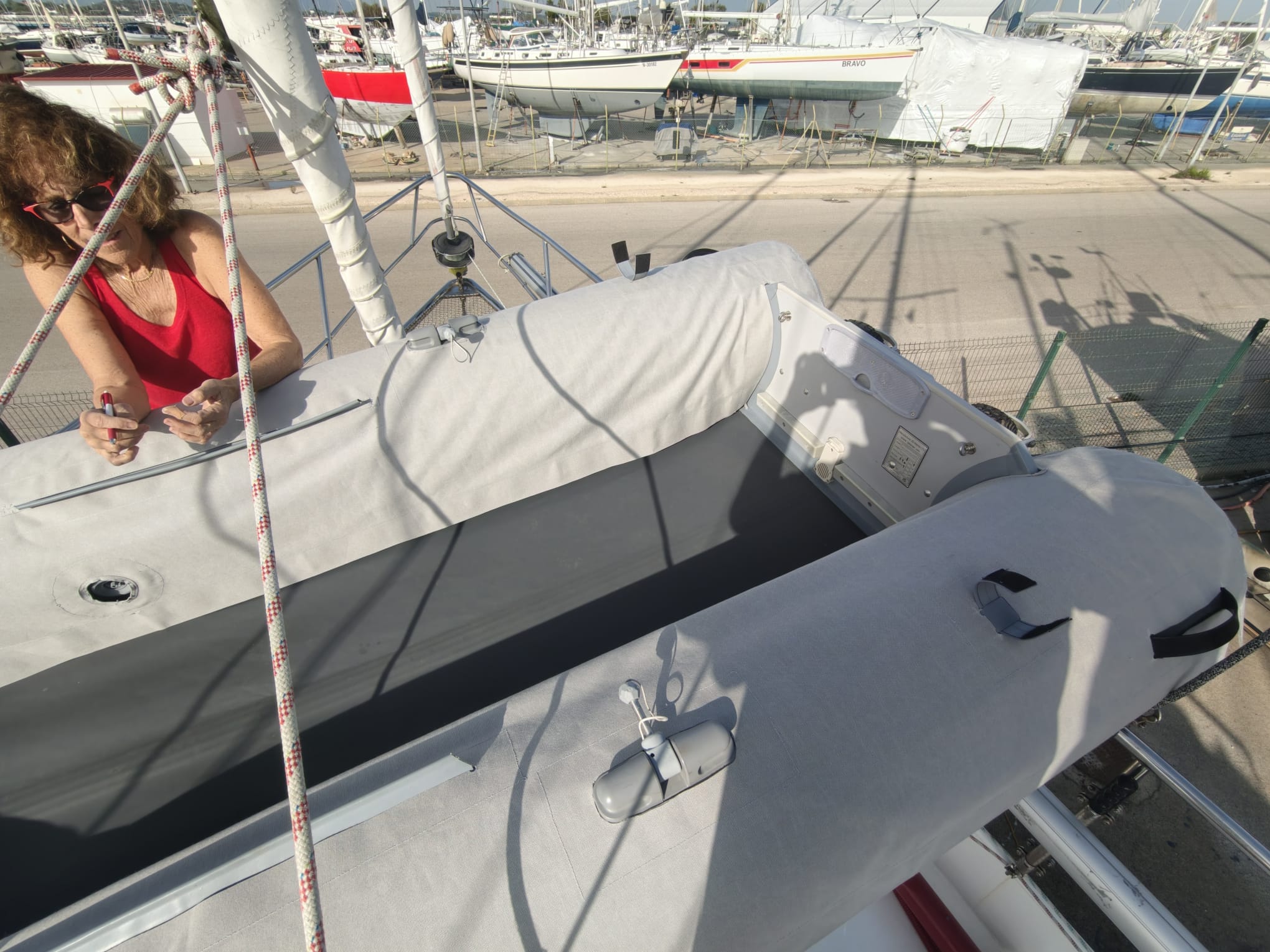 We hoist the dinghy down so Sher can do another fitting of the cover. She decides to improve the shape of the round back ends.