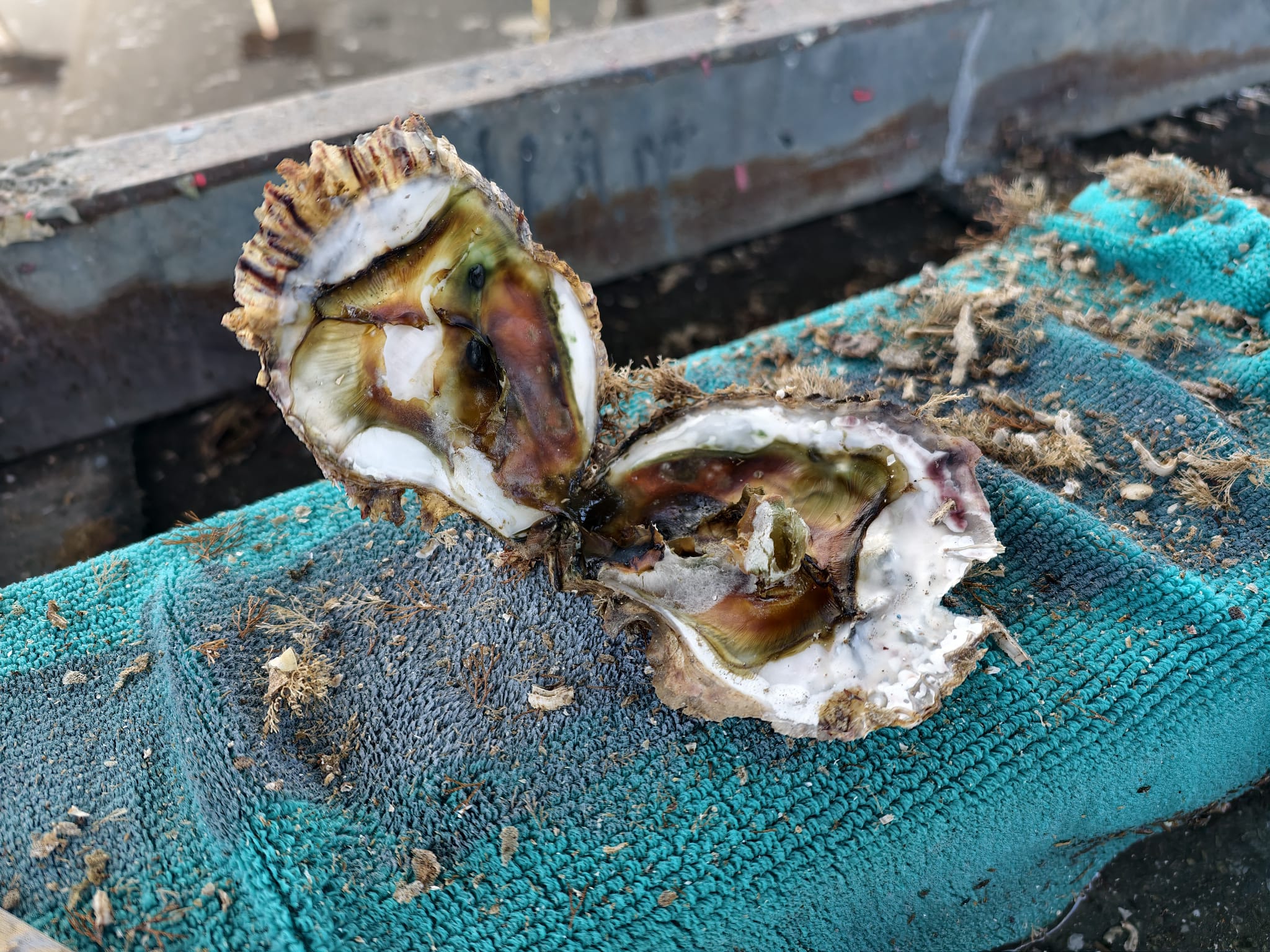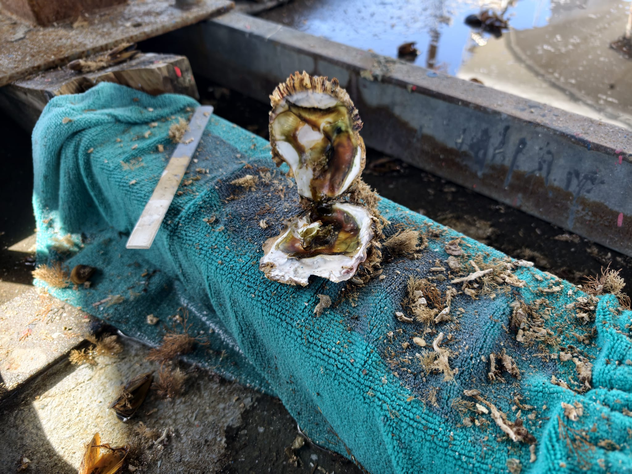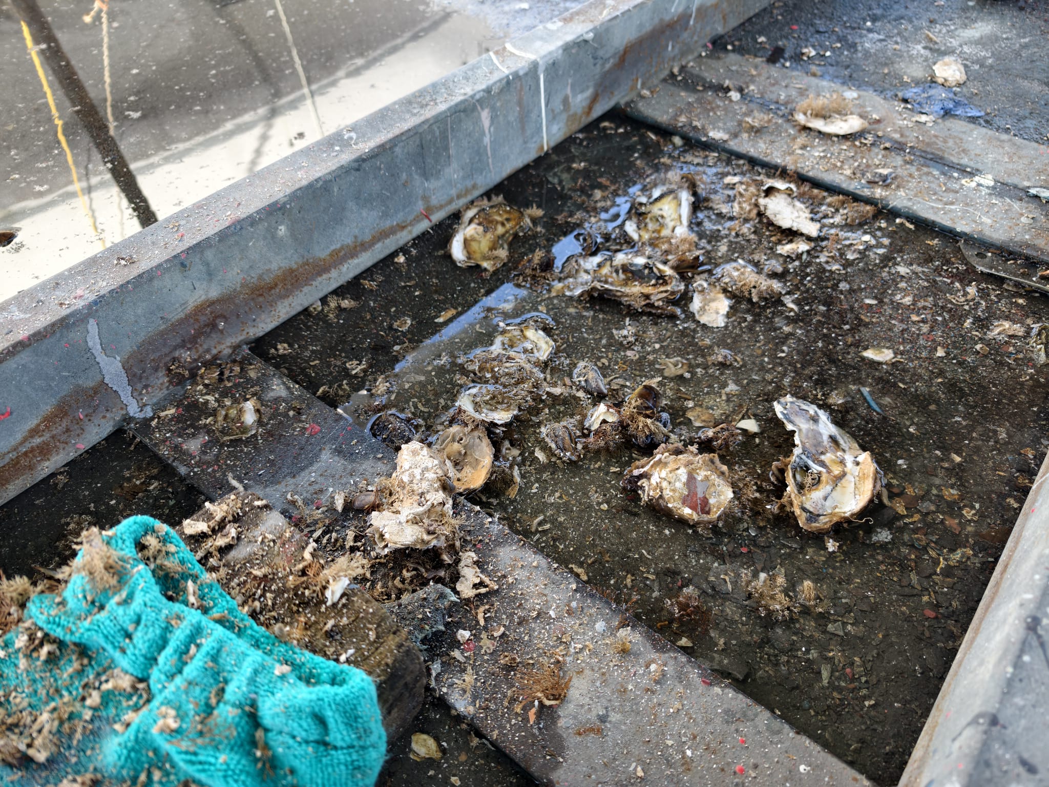 While Wim is waiting for the Coppercoat to dry, he sicks a putty knife in the centerboard case. Although there’s nothing to see on the outside, he feels some hard stuff deeper in the case. Perhaps some mussels? He scratches it with the putty knife and a large oyster fells down! Oops, he can feel many more! These must have grown in the Spanish Ria’s, especially Ria de Arousa.