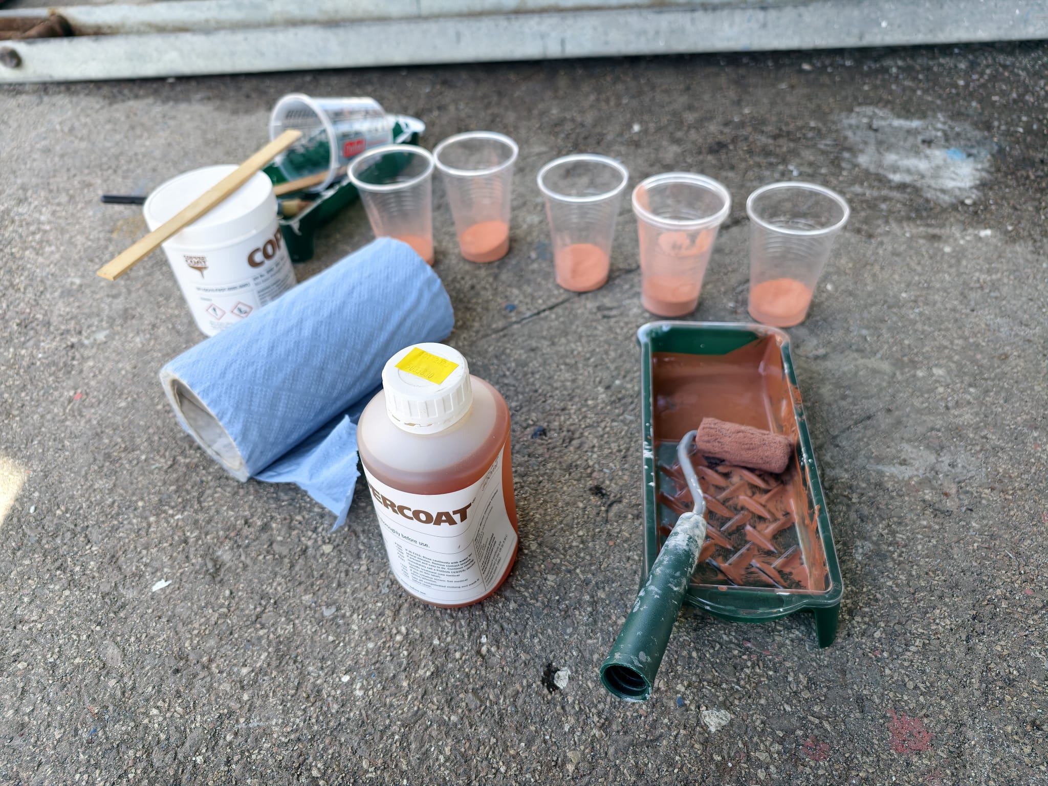 Today, the weather is dry and sunny. That will be perfect for painting CopperCoat. Yesterdays last layer is still sticky so that can have more layers without a problem. We also improve the mixing quantities by using a 30ml spoon. Perhaps we didn’t have the good ratio yesterday, it was too hard to see in the mixing cup.
