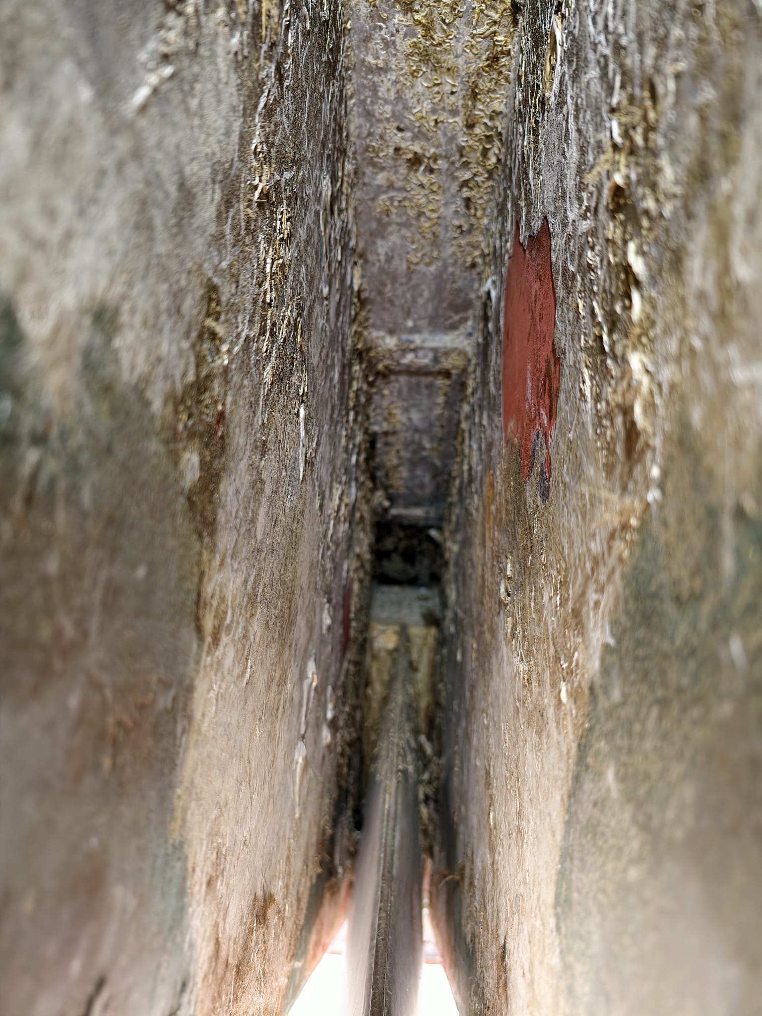 Scraping with putty knife, many oysters fall down. Of course they are dried out but they stick firmly to the centerboard case. It takes real force to poke them of the wall.
