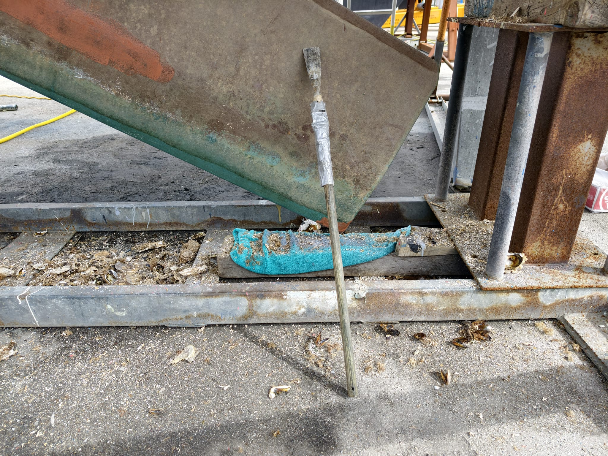 We lower the centerboard to be able to reach them better but Wim can’t reach deep enough to scrape them all off. He gets creative and makes an extension for the putty knife so he can dig the rest of the oysters out of the centerboard case.