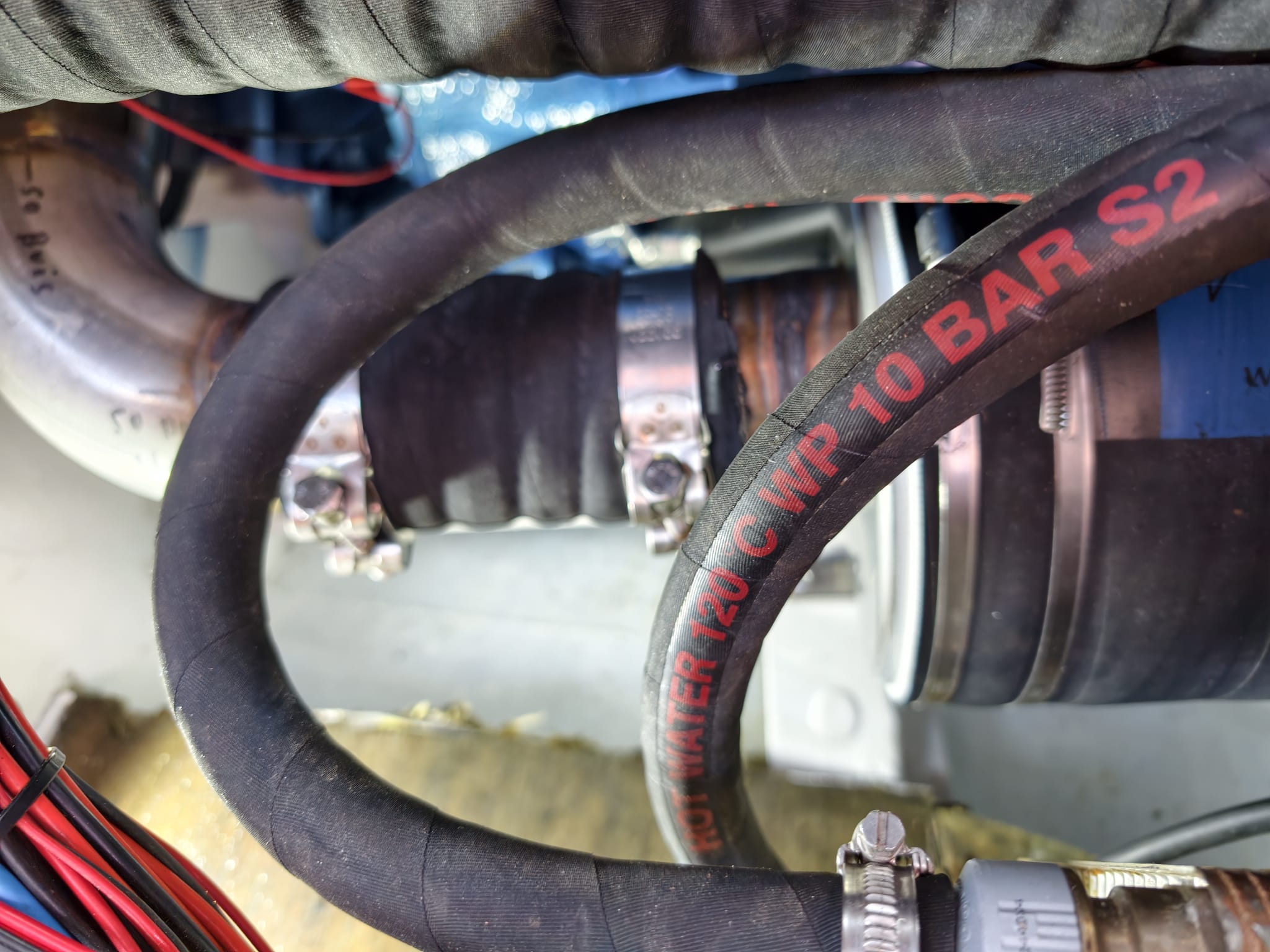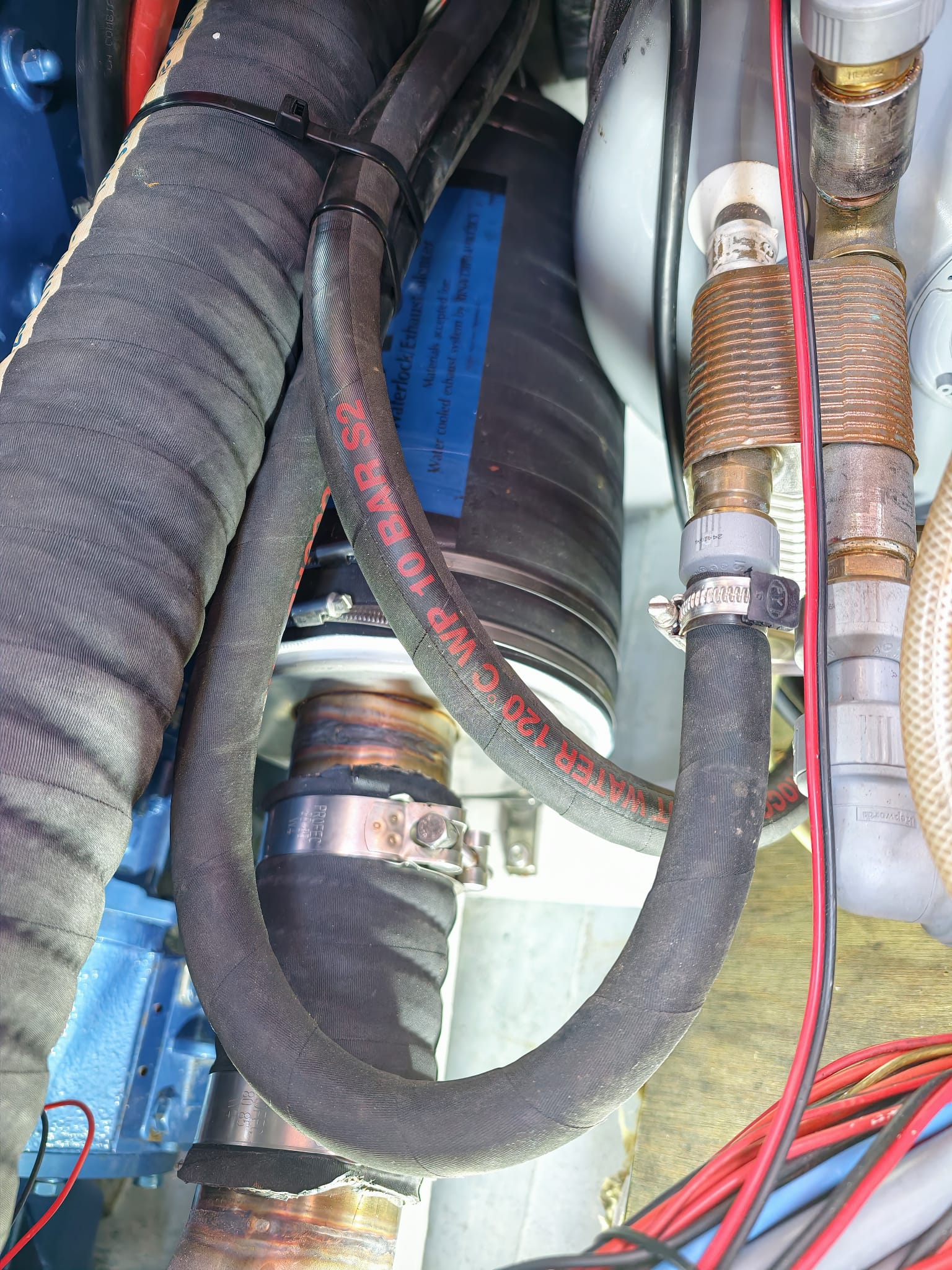 Wim re-installs the engine exhaust water lock.