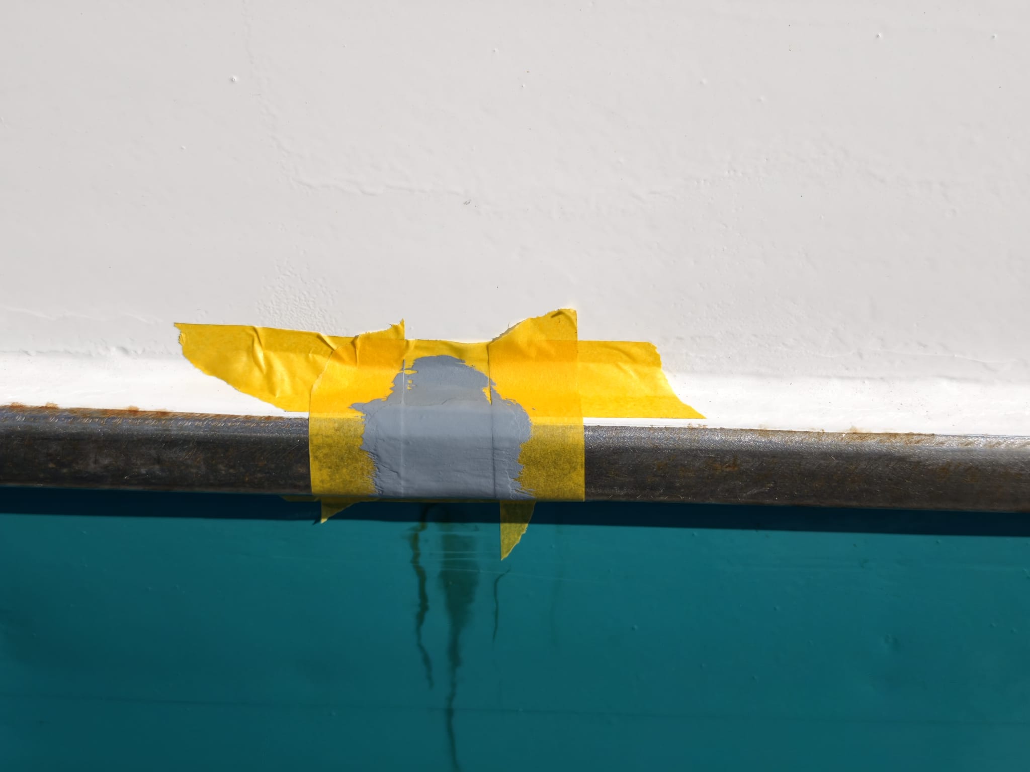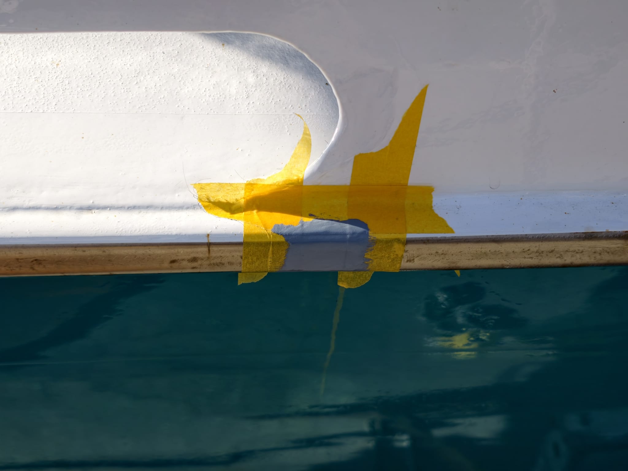 Another thing we decide to do is paint some rusty spots on the stainless steel rub rail. Although the rub rail itself is stainless steel, the welds are getting rusty and rusty water drips down the hull. So, we paint these spots with grey Interprotect primer.