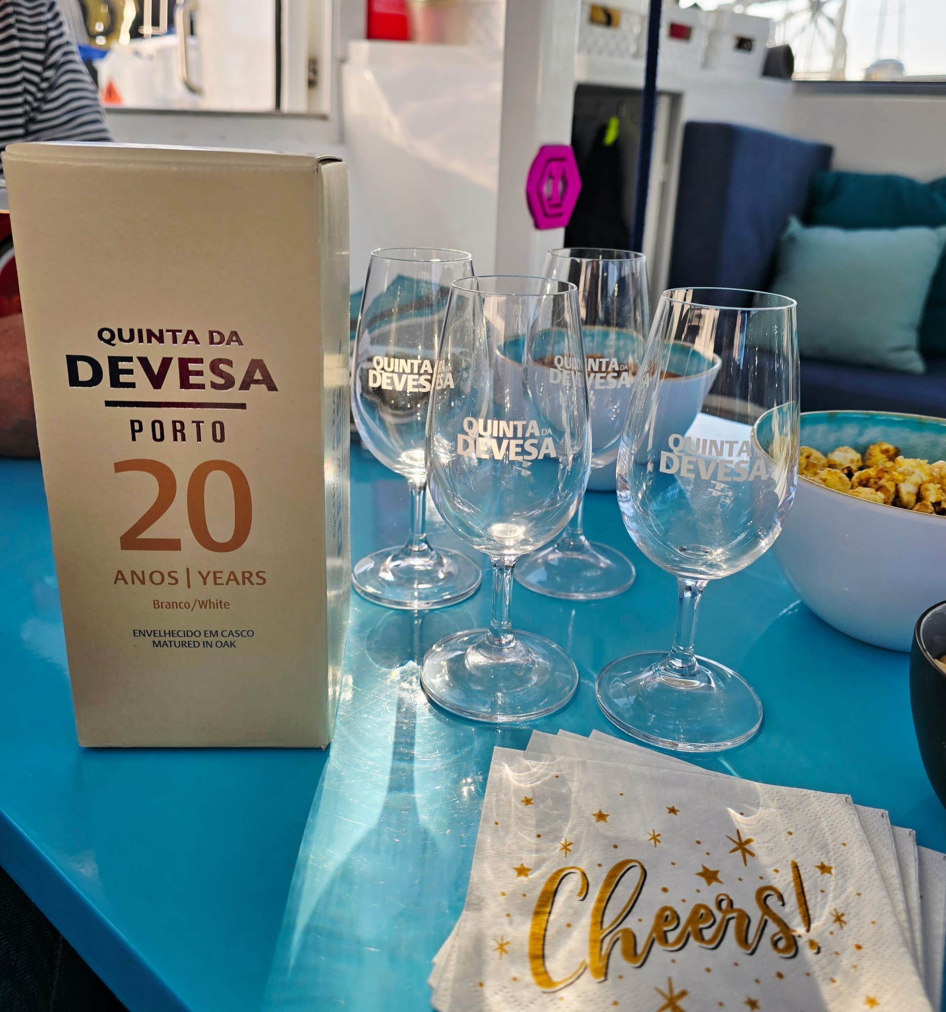 In the late afternoon, Tom & Marcia from the boat “Bird Song” visit us. It’s Tom’s birthday and we toast with one of our most beautiful Port wines: the Devesa 20-year old white. Including the special Devesa glasses! The 4 of us had one of the best days of our lives at the Devesa winery and this is an occasion to celebrate that!