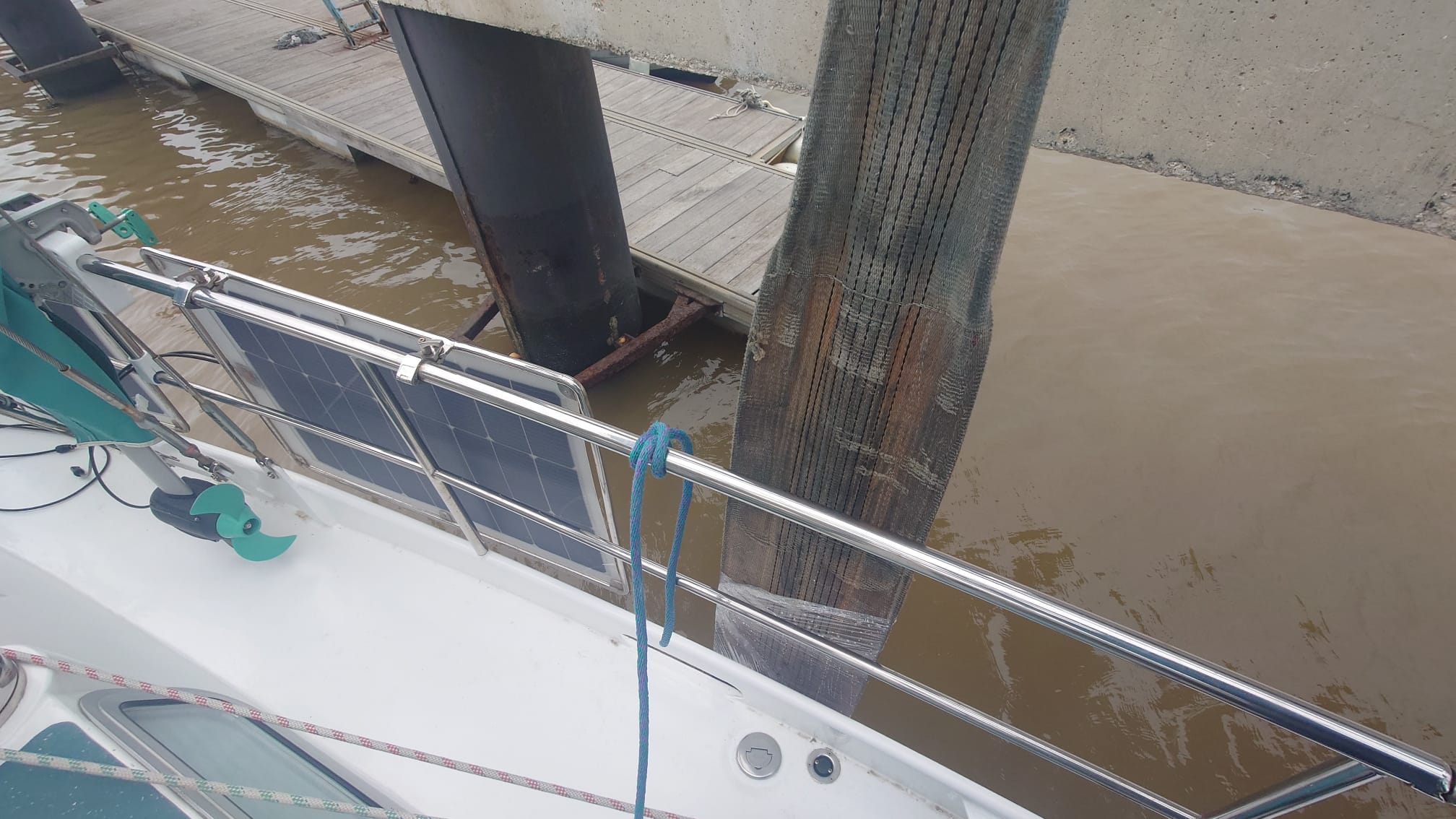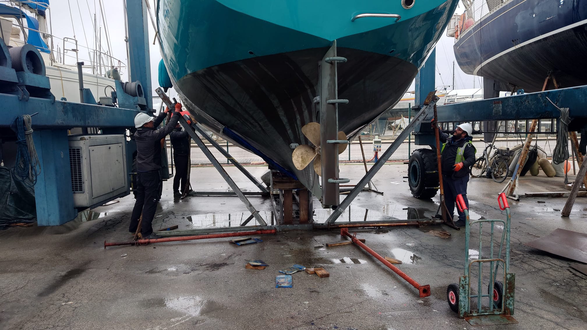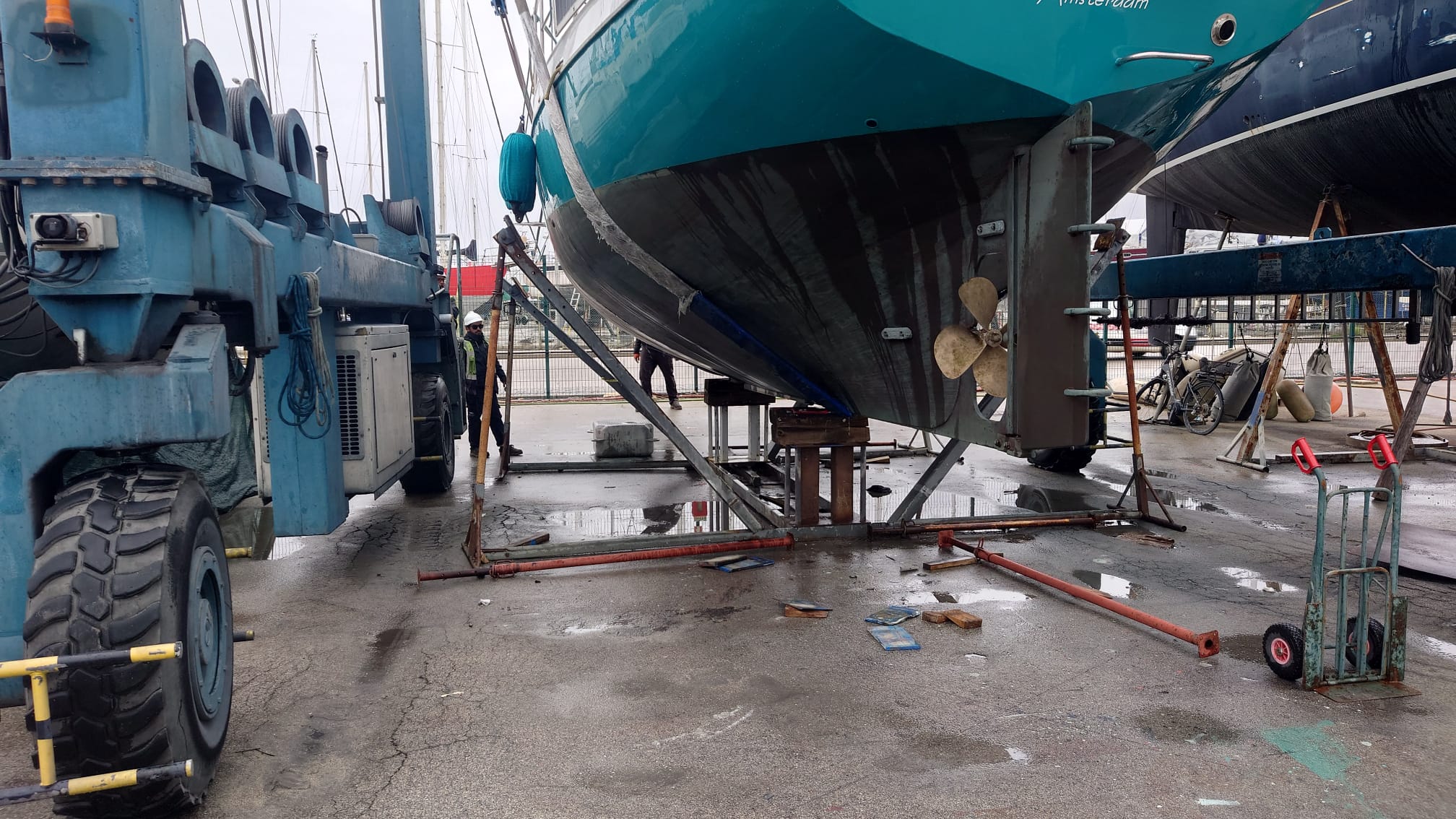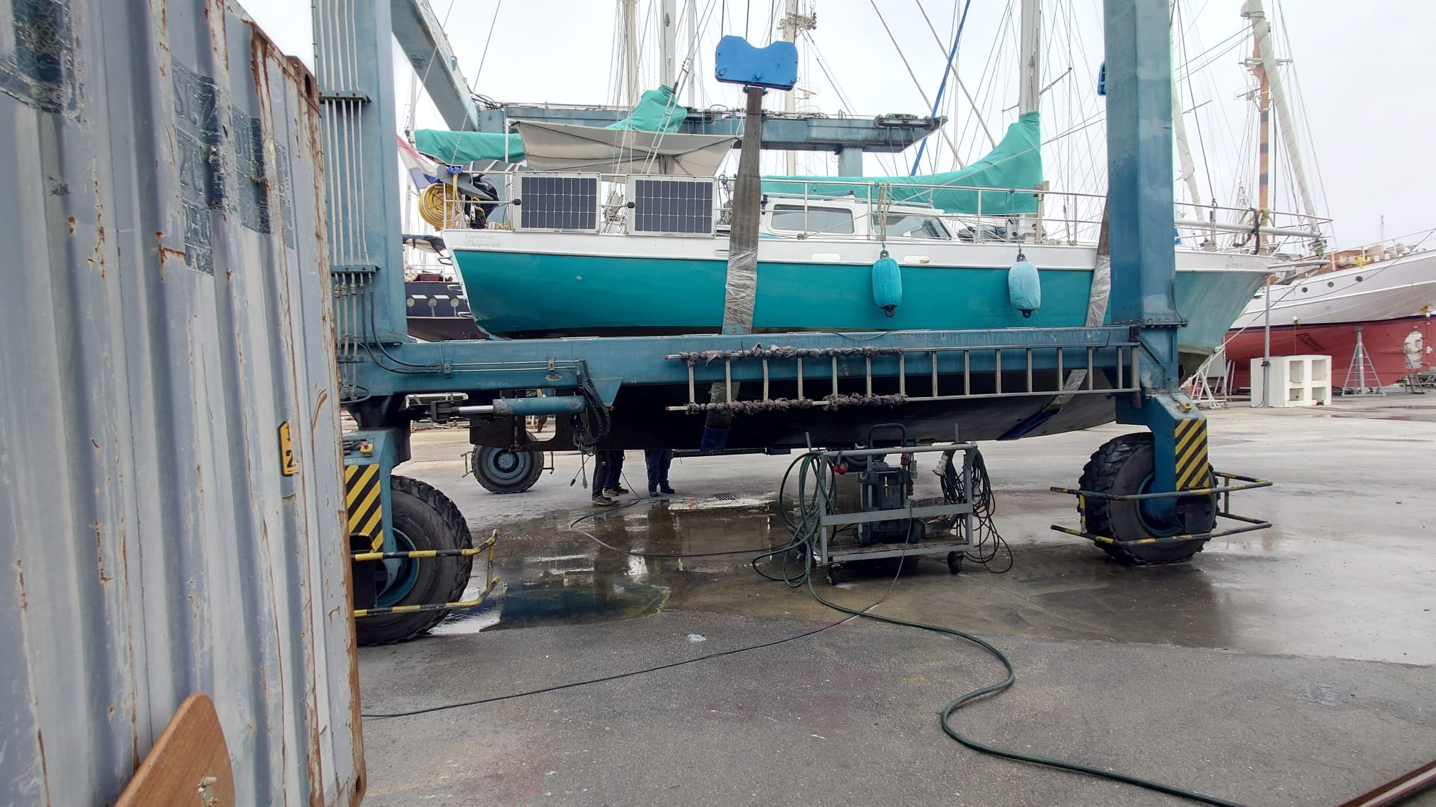 We move to the designated travel lift area, but no travel lift there, and no boatyard people. We call the office again. “Wait until you see the travel lift and our people”. Hm. We wait 45 minutes…hovering in the wind, in front of the entrance… and then the travel lift appears and the men wave us over. We have to go in, in reverse. The slot where the travel lift picks us up is all concrete, which is way too high for our boat fenders at half tide. We have two dinghies which offered to assist if we need help maneuvering. Well, with help of the bow thruster Wim manages to move Dione IV in without touching the concrete 🫡. Once we’re over the slings they quickly hoist a bit and we stay free of the concrete. It takes some adjustment to get the weight balanced and straps in place, but finally… up, up, up we go!