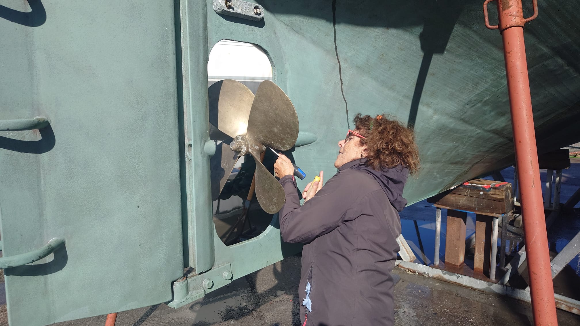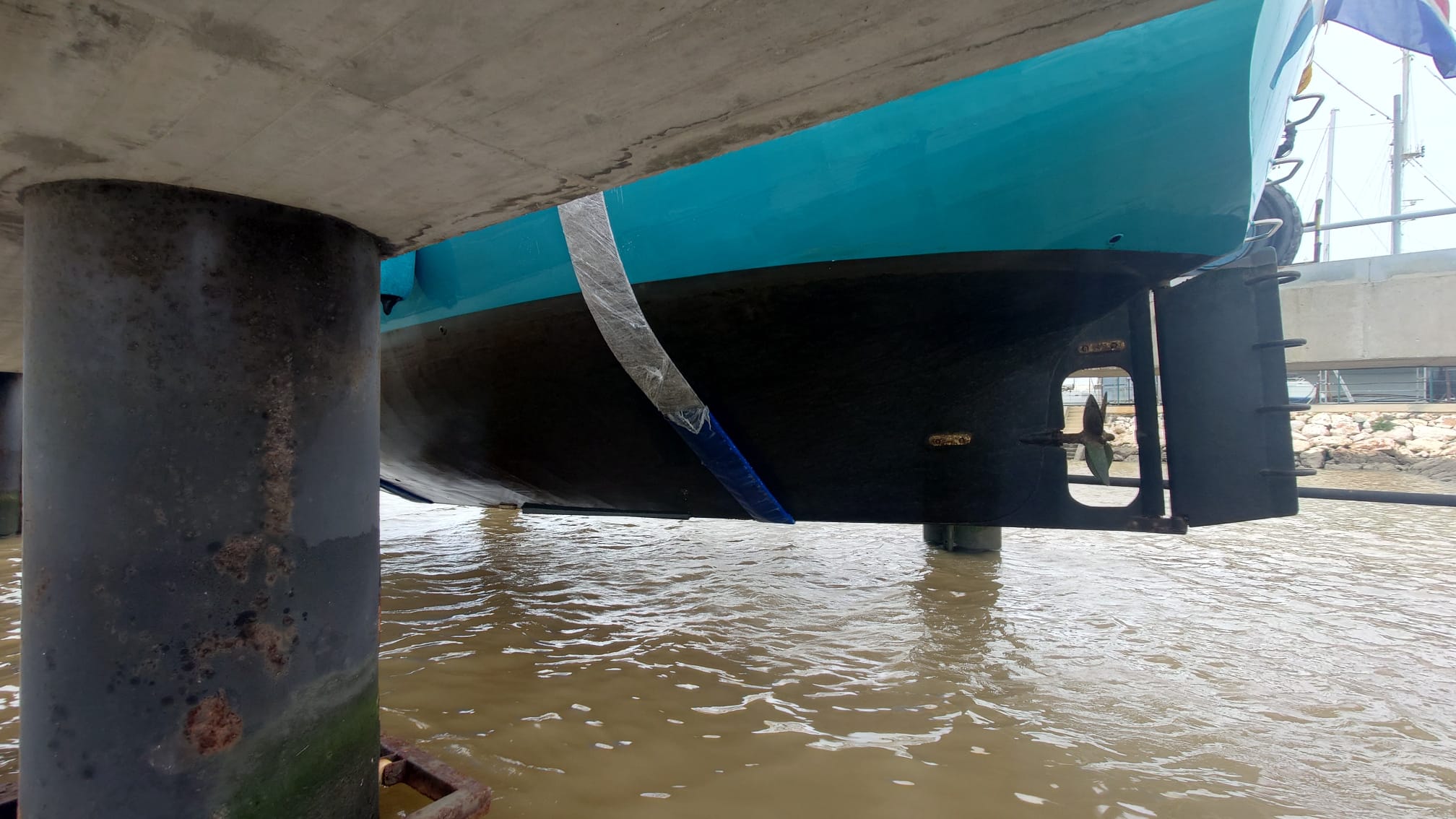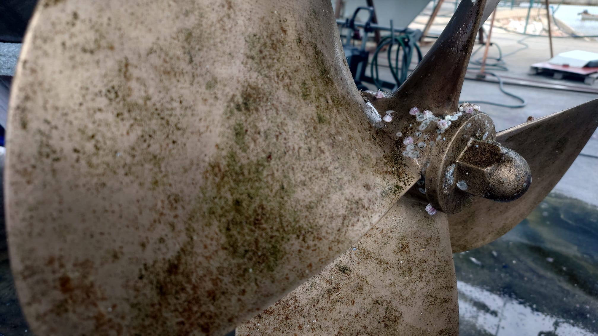 Well, in half a day with no rain Sher can scrape off some barnacles. Look how nice green our CopperCoat is! That is pure copper oxide. Means it’s doing a great job!